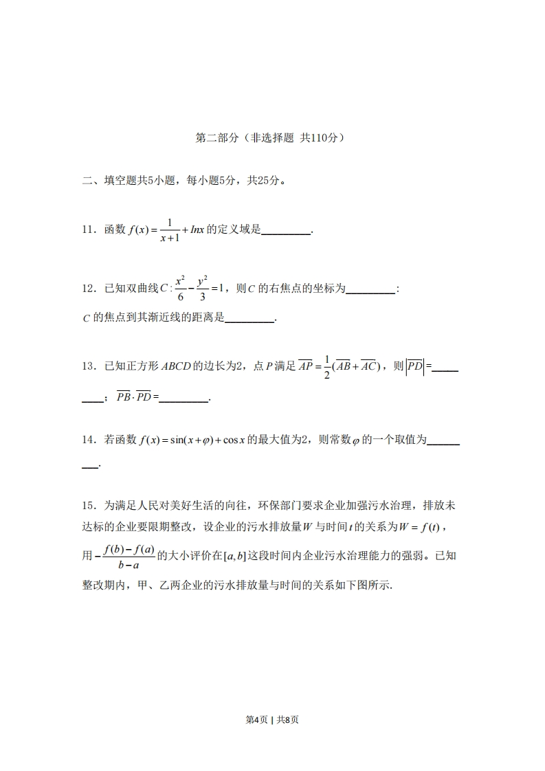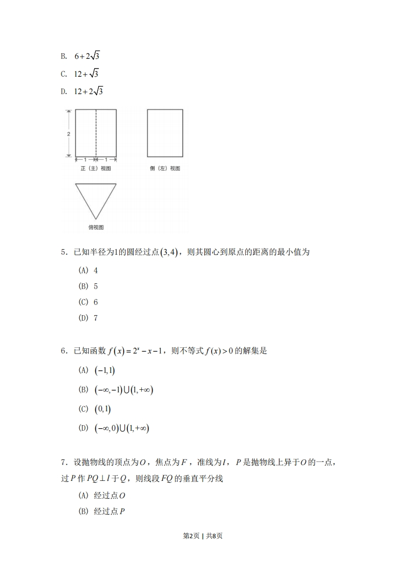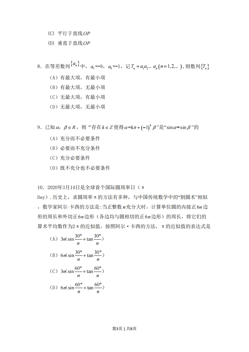 2020年普通高等学校招生全国统一考试(北京卷)数学本试卷共5页,150分,考试时长120分钟。考生务必将答案答在答题卡上,在试卷上作答无效,考试结束后,将本试卷和答案卡一并交回。第一部分(选择题共40分)一、选择题共10小题,每小题4分,共40分。在每小题列出的四个选项中,选出符合题目要求的一项。1.已知集合A={-1,0,12,B={x00的解集是(A)(-1,)(B)(-0,-1)U1,+∞)(C)(0,1)(D)(-0,0)U(1,+0)7.设抛物线的顶点为O,焦点为F,准线为1,P是抛物线上异于O的一点,过P作PQ⊥I于Q,则线段FQ的垂直平分线(A)经过点O(B)经过点P第2页1共8页(C)平行于直线OP(D)垂直于直线OP8.在等差数列a}中,a=-9,4,=-1,记T,=aa-a.(n=1,2-),则数列{亿}(A)有最大项,有最小项(B)有最大项,无最小项(C)无最大项,有最小项(D)无最大项,无最小项9.已知a,B∈R,则“存在k∈Z使得a=kπ+(-l)B”是“sina=sinB”的(A)充分而不必要条件(B)必要而不充分条件(C)充分必要条件(D)既不充分也不必要条件10.2020年3月14日是全球首个国际圆周率日(πDy).历史上,求圆周率π的方法有多种,与中国传统数学中的“割圆术相似,数学家阿尔,卡西的方法是:当正整数n充分大时,计算单位圆的内接正6n边形的周长和外切正6n边形(各边均与圆相切的正6n边形)的周长,将它们的算术平均数作为2π的近似值,按照阿尔·卡西的方法,π的近似值的表达式是(A)3msin30°+n300+tan30°(B)6n(sin30°-tan-n(C)3msin60°60°ttann(D)6n(sin-,60°60°一+tann第3页1共8页
