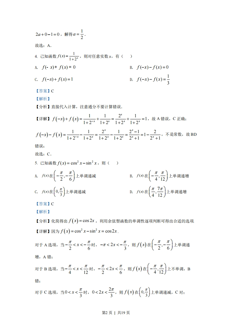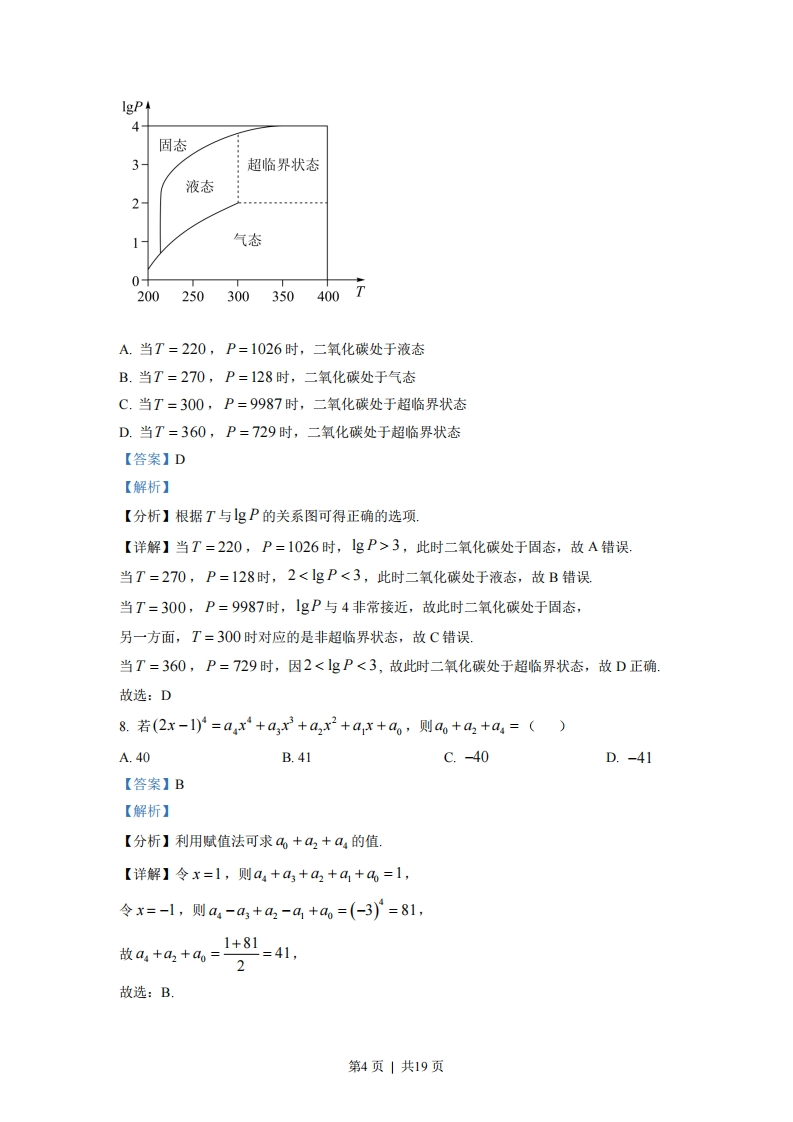 绝密女本科目考试启用前2022年普通高等学校招生全国统一考试(北京卷)数学本试卷共5页,150分.考试时长120分钟.考生务必将答案答在答题卡上,在试卷上作答无效.考试结束后,将本试卷和答题卡一并交回.第一部分(选择题共40分)一、选择题共10小题,每小题4分,共40分.在每小题列出的四个选项中,选出符合题目要求的一项.1.已知全集U={x-3No时,an>0”的()A.充分而不必要条件B.必要而不充分条件C.充分必要条件D.既不充分也不必要条件【答案】C【解析】【分析】设等差数列{an}的公差为d,则d≠0,利用等差数列的通项公式结合充分条件、必要条件的定义判断可得出结论【详解】设等差数列{an}的公差为d,则d≠0,记x为不超过x的最大整数若{an}为单调递增数列,则d>0,若a≥0,则当n≥2时,an>a1≥0:若a1<0,则an=a1+(n-l)d,由0=8+-)1>0可得m>1-台取心,=-}1,则当n>时,a>0,所以,“{an}是递增数列”→“存在正整数N。,当n>N。时,an>0”若存在正整数No,当n>N。时,an>0,取keN且k>N。,a,>0,假设d<0,令a.=a+(n-k)d<0可得n>k-,且k-a>k,dd当nk-9+1时,an<0,与题设矛盾,假设不成立,则d>0,即数列{an}是递增数列所以,“{an}是递增数列”←“存在正整数N。,当n>No时,an>0”所以,“{an}是递增数列”是“存在正整数N。,当n>N。时,an>0”的充分必要条件故选:C7.在北京冬奥会上,国家速滑馆“冰丝带”使用高效环保的二氧化碳跨临界直冷制冰技术,为实现绿色冬奥作出了贡献.如图描述了一定条件下二氧化碳所处的状态与T和gP的关系,其中T表示温度,单位是K:P表示压强,单位是bar.下列结论中正确的是()第3页|共19页
