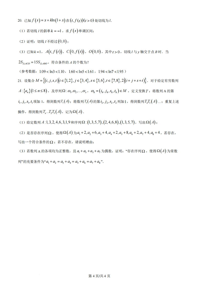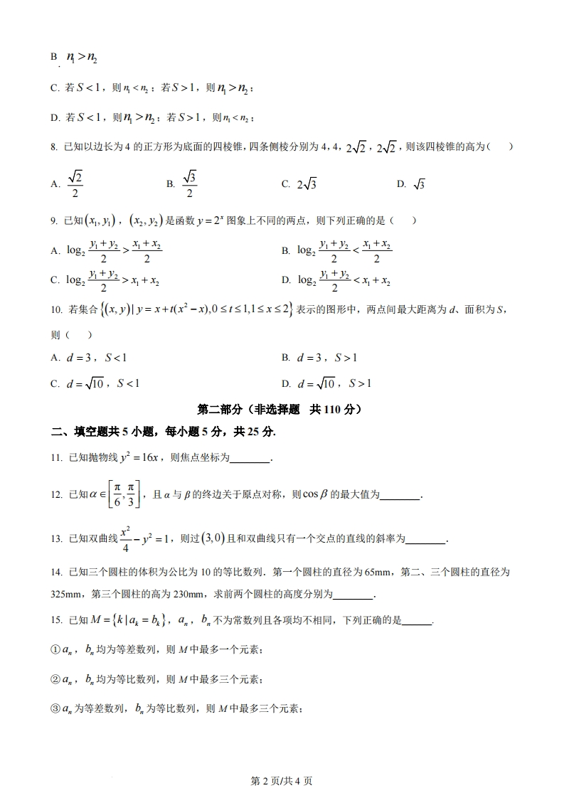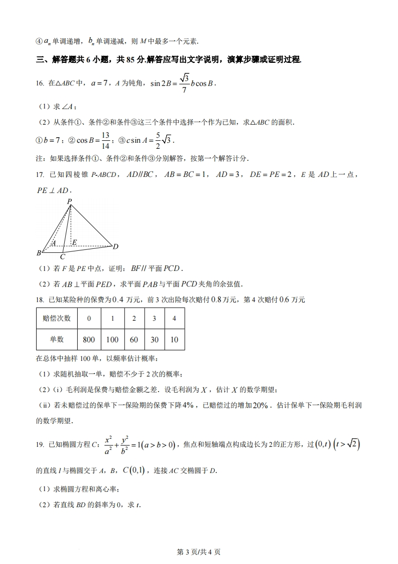 绝密★本科目考试启用前2024年普通高等学校招生全国统一考试(北京卷)数学本试卷共12页,150分.考试时长120分钟.考生务必将答案答在答题卡上,在试卷上作答无效考试结束后,将本试卷和答题卡一并交回。第一部分(选择题共40分)一、选释题共10小题,每小题4分,共40分.在每小题列出的四个选项中,选出符合题目要求的一项。1.已知集合M={x-40),f()=-1,)=l,1-L-号,则o=()A1B.2C.3D.47记水的质量为d=S-,并且d越大,水质量越好.若S不变,且d=2.1,d2=2.2,则n1与n2的关Inn系为()A.i<%第1页共4页B n>nC.若S<1,则%<%:若S>1,则n>n:D.若S<1,则n>n2:若S>1,则m当+32B.log2+业<出+x222C.log,+边1c.d=√0,S<1D.d=10,S>1第二部分(非选择题共110分)二、填空题共5小题,每小题5分,共25分11.己知抛物线y2=16r,则焦点坐标为12.己知∈63且a与B的终边关于原点对称,则cosB的最大值为13.已知双曲线-少=1,则过(6,0)且和双曲线只有一个交点的直线的斜率为414.己知三个圆柱的体积为公比为10的等比数列.第一个圆柱的直径为65mm,第二、三个圆柱的直径为325mm,第三个圆柱的高为230mm,求前两个圆柱的高度分别为15.己知M={k|a,=b},an,bn不为常数列且各项均不相同,下列正确的是①an,bn均为等差数列,则M中最多一个元素:②an,bn均为等比数列,则M中最多三个元素:③an为等差数列,bn为等比数列,则M中最多三个元素:第2页共4页④an单调递增,bn单调递减,则M中最多一个元素.三、解答题共6小题,共85分解答应写出文字说明,演算步骤或证明过程16在△1BC中,a=7,A为能角,sim2B=5-bcos B.7(1)求∠A:(2)从条件①、条件②和条件③这三个条件中选择一个作为己知,求△ABC的面积.①b=7:②cosB=3:③csin A=V51314注:如果选择条件①、条件②和条件③分别解答,按第一个解答计分.17.己知四棱锥P-ABCD,AD∥BC,AB=BC=1,AD=3,DE=PE=2,E是AD上一点,PE⊥ADB4(1)若F是PE中点,证明:BF∥平面PCD(2)若AB⊥平面PED,求平面PAB与平面PCD夹角的余弦值.18.己知某险种的保费为0.4万元,前3次出险每次赔付0.8万元,第4次赔付0.6万元赔偿次数0123单数800100603010在总体中抽样100单,以频率估计概率:(1)求随机抽取一单,赔偿不少于2次的概率:(2)()毛利润是保费与赔偿金额之差.设毛利润为X,估计X的数学期望:(i)若未赔偿过的保单下一保险期的保费下降4%,己赔偿过的增加20%,估计保单下一保险期毛利润的数学期望.知椭圆方程℃二+发三1(a>h>0),焦点和短轴端点构成边长为2的正方形,过(0,)>的直线I与椭圆交于A,B,C(O,),连接AC交椭圆于D.(1)求椭圆方程和离心率:(2)若直线BD的斜率为0,求1.第3页共4页