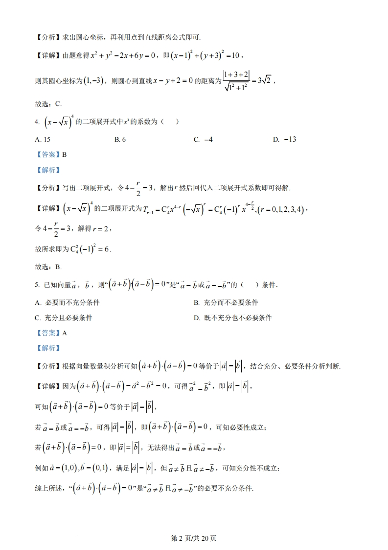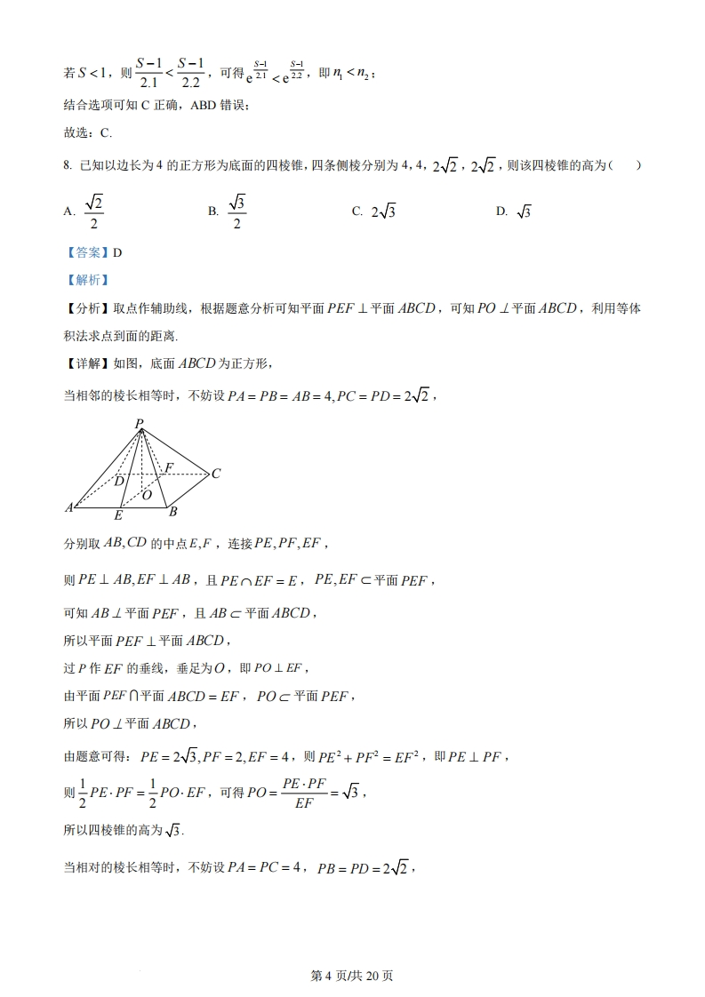 绝密★本科目考试启用前2024年普通高等学校招生全国统一考试(北京卷)数学本试卷共12页,150分.考试时长120分钟.考生务必将答案答在答题卡上,在试卷上作答无效考试结束后,将本试卷和答题卡一并交回,第一部分(选择题共40分)一、选释题共10小题,每小题4分,共40分.在每小题列出的四个选项中,选出符合题目要求的一项,1.已知集合M={x-40),f()=-l,f(3)=l,1-L=5,则0=()A.1B.2C.3D.4【答案】B【解析】【分析】根据三角函数最值分析周期性,结合三角函数最小正周期公式运算求解.【详解】由题意可知:X为f(x)的最小值点,X2为∫(x)的最大值点,则k-=,=2,即T=π,且0>0,所以0=2T故选:B。7记水的质量为d=S-,并且d越大,水质量越好.若S不变,且4=2.1,d2=2.2,则n与n2的关系为()A.mnC.若S<1,则%<:若S>1,则n>n:D.若S<1,则n>乃2:若S>1,则n1,则2>22,可得e品>e品,即%>%:S-1、S-18-1-1若S=1,则S-1=S-2.1-2.2=0,可得n1=n2=1:第3页供20页