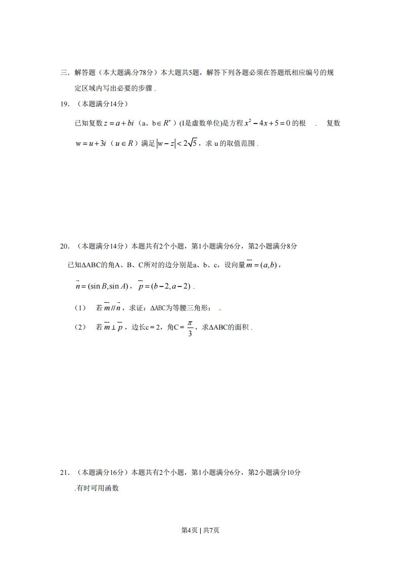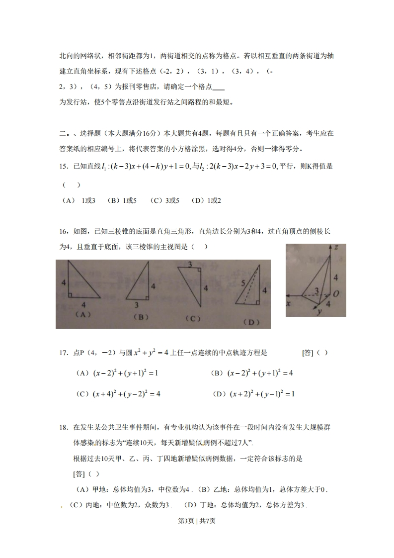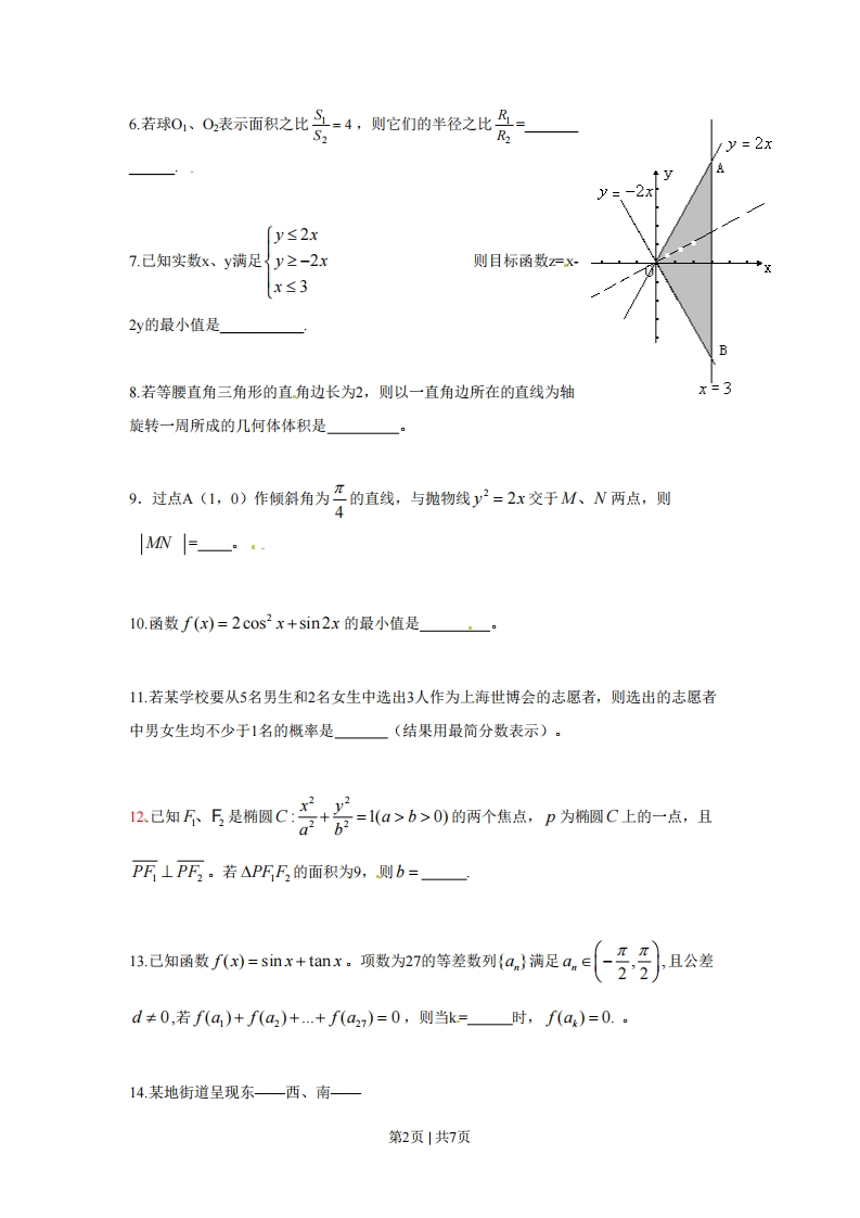 绝密★启用前2009年普通高等学校招生全国统一考试(上海卷)数学试卷(文史类)(满分150分,考试时间120分钟)考生注意1.本场考试时间120分钟,试卷共4页,满分150分,答题纸共2页。2.作答前,在答题纸正面填写姓名、准考证号,反面填写姓名,将核对后的条形码贴在答愿纸指定位置3.所有作答务必填涂或书写在答题纸上与试卷题号对应的区域,不得错位.在试卷上作答一律不得分.4.用2B铅笔作答选择题,用黑色字迹钢笔、水笔或圆珠笔作答非选择题,一填空题(本大题满分56分)本大题共有14题,考生应在答题纸相应编号的空格内直接填写结果,每个空格填对得4分,否则一律得零分。1.函数fx=x3+1的反函数f1(x上2.己知集体A={xX≤1},B={x|≥a},且AUB=R,则实数a的取值范围是453.若行列式1×3789到中,元素4的代数余子式大于0,则x满足的条件是」y+x2y+2四4.某算法的程序框如右图所示,则输出量y与输入量x满足的关系式是出结束5.如图,若正四棱柱ABCD一A1B1CD1的底面边长为2,高为4,则异面直线BD1与AD所成角的大小是(结果用反三角函数值表示).第1页1共7页6.若球01、0表示面积之比=4,则它们的半径之比及=S2R/y=2x2xy≤2x7.已知实数x、y满足{y≥-2x则目标函数=xx≤32y的最小值是8.若等腰直角三角形的直角边长为2,则以一直角边所在的直线为轴=3旋转一周所成的几何体体积是」9.过点A(1,0)作倾斜角为T的直线,与抛物线y2=2x交于M、N两点,则4MN=.10.函数f(x)=2cos2x+sin2x的最小值是11.若某学校要从5名男生和2名女生中选出3人作为上海世博会的志愿者,则选出的志愿者中男女生均不少于1名的概率是(结果用最简分数表示)。2.已知人、5是箱圆C若+长=a>b>0)的两个焦点,p为箱铜C上的一点,且PE⊥PF。若△PFF的面积为9,则b=13.已知函数)=snx+tamx.项数为27的等差数列a,}满足a,(受引且公卷d≠0,若f(a)+f(a2)+..+f(a27)=0,则当k=时,f(a)=0.。14某地街道呈现东—西、南—第2页|共7页北向的网络状,相邻街距都为1,两街道相交的点称为格点。若以相互垂直的两条街道为轴建立直角坐标系,现有下述格点(-2,2),(3,1),(3,4),(-2,3),(4,5)为报刊零售店,请确定一个格点为发行站,使5个零售点沿街道发行站之间路程的和最短。二。、选择题(本大题满分16分)本大题共有4题,每题有且只有一个正确答案,考生应在答案纸的相应编号上,将代表答案的小方格涂黑,选对得4分,否则一律得零分。15.己知直线1:(k-3)x+(4-k)y+1=0,与:2(k-3)x-2y+3=0,平行,则K得值是()(A)1或3(B)1或5(C)3或5(D)1或216,如图,己知三棱锥的底面是直角三角形,直角边长分别为3和4,过直角顶点的侧棱长为4,且垂直于底面,该三棱锥的主视图是()(B)(C)(D)17.点P(4,一2)与圆x2+y2=4上任一点连续的中点轨迹方程是[答]()(A)(x-2)2+(y+1)2=1(B)(x-2)2+(y+1)2=4(C)(x+4)2+(y-2)2=4(D)(x+2)2+(y-1)2=118.在发生某公共卫生事件期间,有专业机构认为该事件在一段时间内没有发生大规模群体感染的标志为“连续10天,每天新增疑似病例不超过7人”根据过去10天甲、乙、丙、丁四地新增疑似病例数据,一定符合该标志的是[答]()(A)甲地:总体均值为3,中位数为4.(B)乙地:总体均值为1,总体方差大于0.,(C)丙地:中位数为2,众数为3.(D)丁地:总体均值为2,总体方差为3第3页|共7页