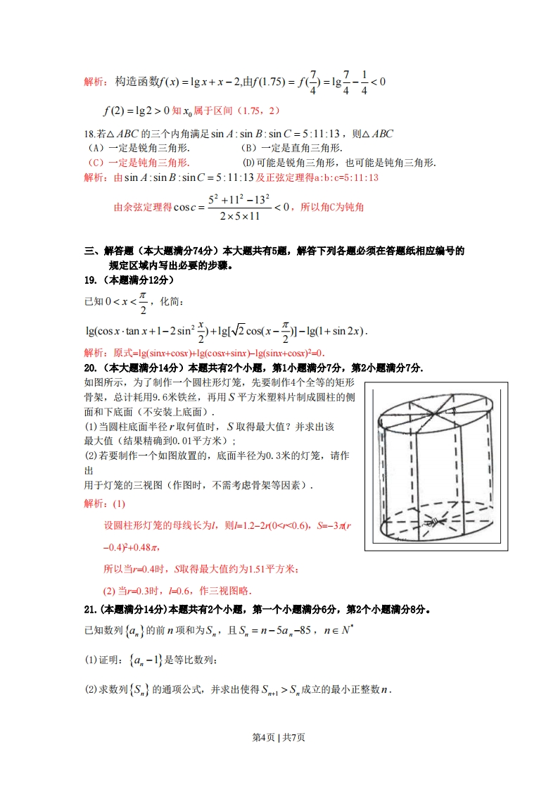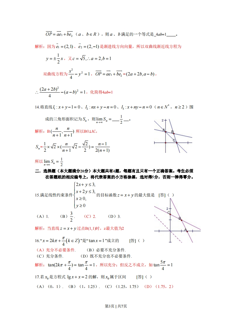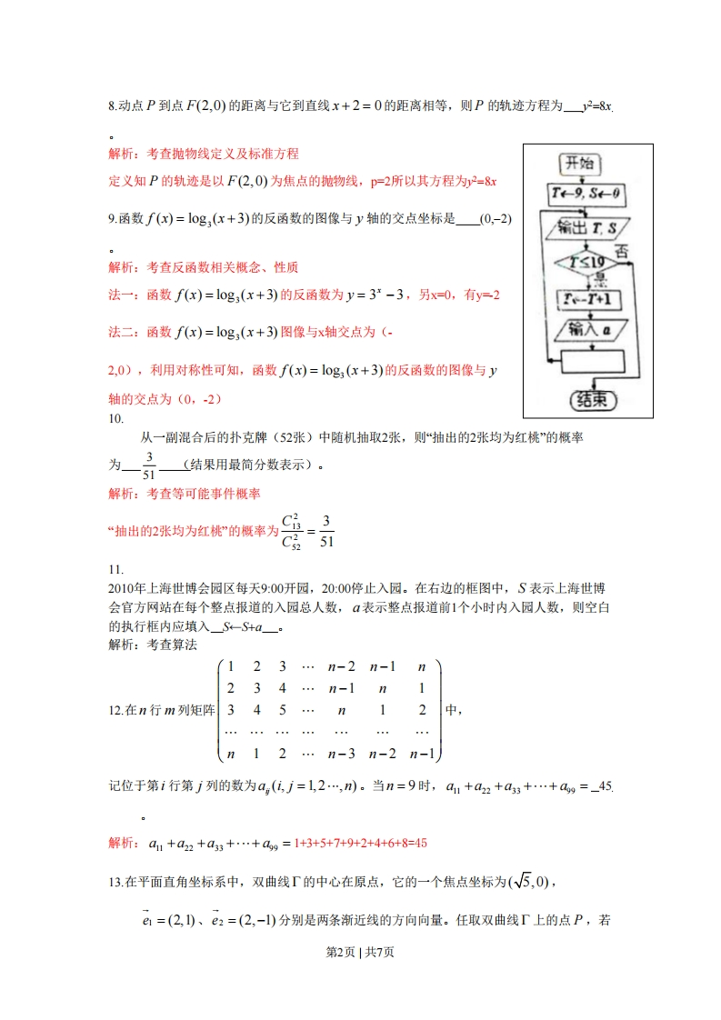 2010年普通高等学校招生全国统一考试(上海卷)数学(文科)一、填空题(本大题满分56分)本大题共有14题,考生必须在答题纸相应编号的空格内直接填写结果,每个空格填对得4分,否则一律得零分。1.己知集合A={1,3,m},B={3,4,AB={1,2,3,4}则m=2解析:考查并集的概念,显然m=22.不等式2-x>0的解集是_1-40等价于(x-2)(x+40,所以4x<2x+4πcos-6sin交3.行列式6的值是0.5—πcos66πsin解析:考查行列式运算法则66π1=cos-cos--sin-sin-=cos2666632Sin-coS664.若复数z=1-2i(i为虚数单位),则z·z+z=6-2i一。解析:考查复数基本运算z·z+z=(1-2)(1+2)+1-2i=6-2i5.将一个总数为A、B、C三层,其个体数之比为5:3:2。若用分层抽样方法抽取容量为100的样本,则应从C中抽取20个个体。2解析:考查分层抽样应从C中抽取100×二=20106.己知四棱椎P-ABCD的底面是边长为6的正方形,侧棱PA⊥底面ABCD,且PA=8,则该四棱椎的体积是96。解析:考查棱锥体积公式V=二×36×8=967.圆C:x+y2-2x-4y+4=0的圆心到直线3x+4y+4=0的距离d=3_。解析:考查点到直线距离公式3×1+4×2+4圆心(1,2)到直线3x+4y+4=0距离为=35第1页1共7页8.动点P到点F(2,0)的距离与它到直线x+2=0的距离相等,则P的轨迹方程为2=8x解析:考查抛物线定义及标准方程开始定义知P的轨迹是以F(2,0)为焦点的抛物线,p=2所以其方程为)2=8xT←-9,S←-09.函数f(x)=l0g(x+3)的反函数的图像与y轴的交点坐标是_(0,-2)出TS解析:考查反函数相关概念、性质。4。法一:函数f(x)=1og(x+3)的反函数为y=3-3,另x=0,有y=2法二:函数f(x)=l0g,(x+3)图像与x轴交点为(-2,0),利用对称性可知,函数f(x)=10g(x+3)的反函数的图像与y轴的交点为(0,-2)结束10.从一副混合后的扑克牌(52张)中随机抽取2张,则“抽出的2张均为红桃”的概率为一3(结果用最简分数表示)·解析:考查等可能事件概率3“抽出的2张均为红桃”的概率为511.2010年上海世博会园区每天9:00开园,20:00停止入园。在右边的框图中,S表示上海世博会官方网站在每个整点报道的入园总人数,α表示整点报道前1个小时内入园人数,则空白的执行框内应填入_S-S+a一。解析:考查算法7123n-2n-1n234n-1112.在n行m列矩阵345.n2中,n12…n-3n-2n-1记位于第i行第j列的数为a,(,j=1,2…,n)。当n=9时,41+a2+a33十…+ag=_45.解析:41+a22+a33+…+ag=1+3+5+7+9+2+4+6+8=4513.在平面直角坐标系中,双曲线厂的中心在原点,它的一个焦点坐标为(√5,0),e=(2,1)、e2=(2,-1)分别是两条渐近线的方向向量。任取双曲线T上的点P,若第2页|共7页OP=ae1+be2(a、b∈R),则a、b满足的一个等式是_4ab=l—解析:因为白=(2,1)、2=(2,-1)是渐进线方向向量,所以双曲线渐近线方程为y=±2x,又c=5,a=2,b=1双曲线方程为-y=1.OP=aei+be=(2a+2b,a-b).:2a+2b-a-b)2=l,化简得4abe1414.将直线:x+y-1=0、:x+y-n=0、4:x+y-n=0(n∈N,n≥2)围成的三角形面积记为8,则mS。=一方一,解析:B(”,n所以B0LAC,n+1n+1n-1n+12(n+1)所以mS.=号二.选择题(本大题满分20分)本大题共有4题,年题有且只有一个正确答案。考生必须在答题纸的相应编号上,将代表答案的小方格涂黑,选对得5分,否则一律得零分。2x+y≤3,x+2y≤3,15.满足线性约束条件的目标函数z=x+y的最大值是[答]()x≥0,y≥0(A)1.(B)3(C)2.(D)3.解析:当直线z=x+y过点B(1,1)时,z最大值为216.“x=2kπ+T(k∈Z))是“tanx=1”成立的[答]()4(A)充分不必要条件.(B)必要不充分条件(C)充分条件,(D)既不充分也不必要条件解析:an2kπ+T)=tanTπ=1,所以充分:但反之不成立,如a5二1417.若x是方程式1gx+x=2的解,则x属于区间[答]()(A)(0,1).(B)(1,1.25).(C)(1.25,1.75)(D)(1.75,2)第3页|共7页