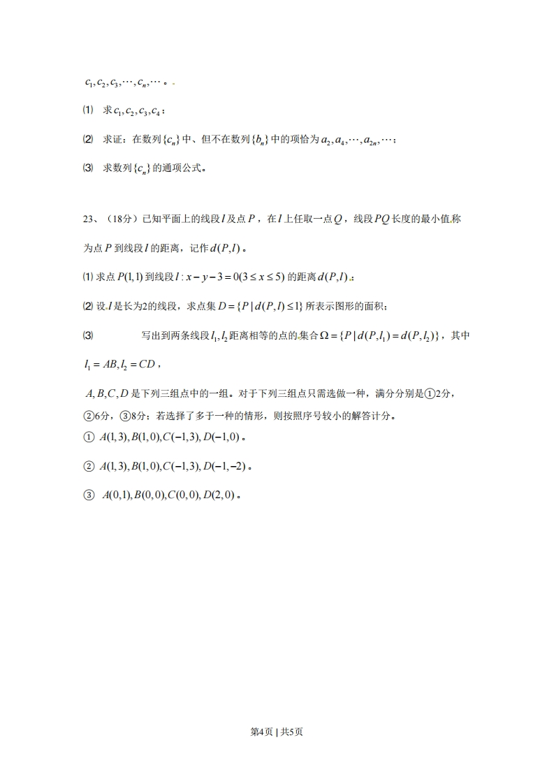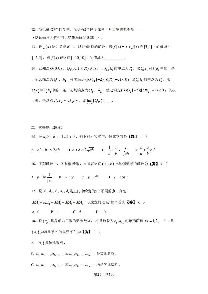 绝密★启用前2011年普通高等学校招生全国统一考试(上海卷)数学试卷(理工农医类)(满分150分,考试时间120分钟)考生注意1.本场考试时间120分钟,试卷共4页,满分150分,答题纸共2页.2.作答前,在答题纸正面填写姓名、准考证号,反面填写姓名,将核对后的条形码贴在答愿纸指定位置3.所有作答务必填涂或书写在答题纸上与试卷题号对应的区域,不得错位.在试卷上作答一律不得分.4,用2B铅笔作答选择题,用黑色字迹钢笔、水笔或圆珠笔作答非选择题.一、填空题(56分)1、函数fx)=的反函数为f(x)=x-22、若全集U=R,集合A={x|x≥1U{x|x≤0},则CuA=3设m为常数,若点F(0,)是双曲线上-亡=1的一个焦点,则m=m 94不等式x+-<3的解为5、在极坐标系中,直线p(2cos0+sin0)=2与直线pcos0=1的夹角大小为6、在相距2千米的A、B两点处测量目标C,若∠CAB=75,∠CBA=60°,则A、C两点之间的距离是千米。7、若圆锥的侧面积为2π,底面积为π,则该圆锥的体积为8.函数y=sin(5+)cos(公-)的最大值为69、马老师从课本上抄录一个随机变量£的概率分布律如下表P(&=x)请小牛同学计算£的数学期望,尽管“!”处无法完全看清,且两个“?”处字迹模糊,但能肯定这两个“?”处的数值相同。据此,小牛给出了正确答案E£=b10、行列式(a,b,c,d∈{-1,1,2})的所有可能值中,最大的是」d11、在正三角形ABC中,D是BC上的点,AB=3,BD=1,则AB·AD=。第1页|共5页12、随机抽取9个同学中,至少有2个同学在同一月出生的概率是(默认每月天数相同,结果精确到0.001)。13、设g(x)是定义在R上、以1为周期的函数,若f(x)=x+g(x)在[3,4]上的值域为[-2,5],则f(x)在区间[-10,10]上的值域为14、己知点O(0,0)、Q(0,1)和R(3,1),记2R的中点为乃,取QP和PR中的一条,记其端点为9、R,使之满足(IOgI-2)OR|-2)<0:记QR的中点为P,取QP和PR中的一条,记其端点为Q2、R,使之满足0O92|-2)OR|-2)<0:依次下去,得到点乃,P2,…,P,…,则limloP乍一。二、选择题(20分)15、若a,b∈R,且ab>0,则下列不等式中,恒成立的是《答】()A ai+b>2ab B a+b22 ab C 1+1>2Db+9≥2a b aba b16、下列函数中,既是偶函数,又是在区间(0,+o)上单调递减的函数为【答〗()A y=InB y=x3 C y=21 D y=cosx17、设A1,A2,A3,A4,A是空间中给定的5个不同的点,则使MA+MA,+MA,+M4+MA=0成立的点M的个数为〖答〗()A0B 1.c5D1018、设{an}是各项为正数的无穷数列,A,是边长为a,a的矩形面积(i=1,2,…),则{A}为等比数列的充要条件为【答〗()A{an}是等比数列。Ba1,4,…,a2m-1,…或42,a4,…,42m,…是等比数列。C41,4,…,a2m-1,…和42,a4,…,a2m,…均是等比数列。第2页|共5页Da1,a3,…,a2m-1…和a2,a4,…,a2m,…均是等比数列,且公比相同。三、解答题(74分)19、(12分)己知复数z,满足(3-2)1+)=1-i(i为虚数单位),复数z2的虚部为2,322是实数,求2220、(12分)已知函数f(x)=a·2+b.3,其中常数a,b满足ab≠0。(1)若ab>0,判断函数f(x)的单调性:(2若ab<0,求f(x+1)>f(x)时x的取值范围。21、(14分)己知ABCD-A,BCD是底面边长为1的正四棱柱,O是AC和BD的交点。(1)设AB,与底面A,BCD所成的角的大小为a,二面角A-BD-A的大小为B。A0求证:tanB=√2tana:②若点C到平面ABD,的距离为,求正四棱柱ABCD-AB,GD,的高。BCDIC22、(18分)已知数列{an}和{b,}的通项公式分别为an=3n+6,bn=2n+7(n∈N),将集合{x|x=an,n∈N}U{x|x=bn,n∈N}中的元素从小到大依次排列,构成数列第3页|共5页