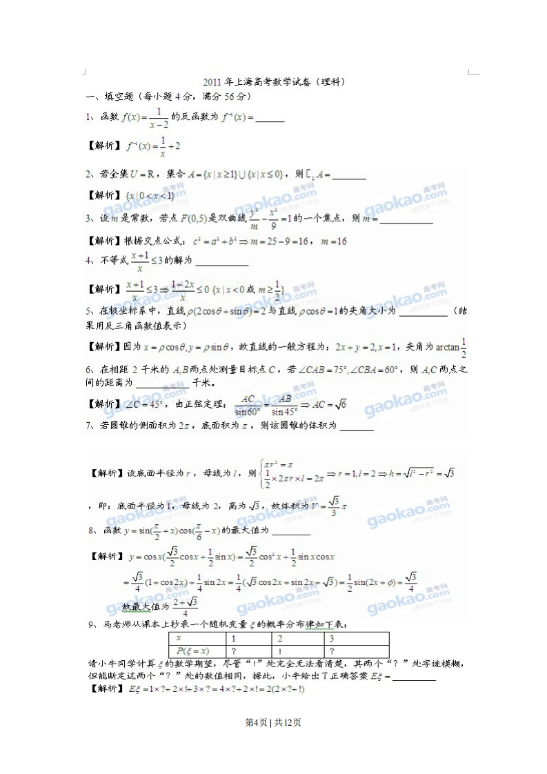 2011年上海高考数学试题(理科)答案及解析一、填空题1、L+2:2、{x100,b>0时,任意x1,x2∈R,0三a(2-2)<0,3"<3,b>0=b(3-3)<0,·f(x)-f(x)<0,函数f(x)在R上是增函数.当a<0,b<0时,同理,函数f(x)在R上是减函数。2f(x+1)-f(x)=a.2+2b·3>0当a<0,b>0时,26,则r>logs←品:当a>0,b<0时,<-a2h则1③选择A(0,1),B(0,0),C(0,0),D(2,0)。2={(x,y)川x≤0,y≤0}U{(x,y)ly=x,02}3Cr--A2.5-10DB01第3页|共12页
