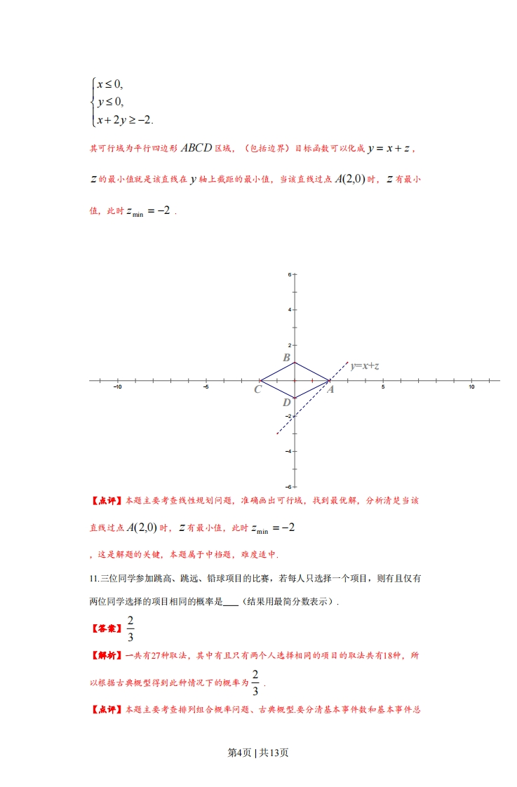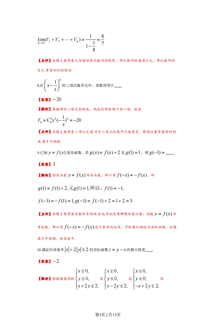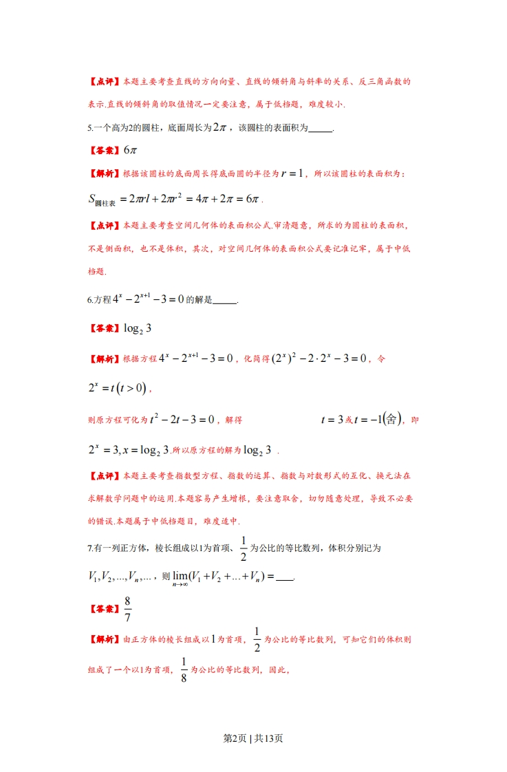 2012上海高考数学试题(文科)答案与解析一、填空题(本大题共有14题,满分56分)1.计算:3-i=(为虚数单位).1+i【卷素】1-2i【解折】3-1.(3-01-=1-211+i(1+i)1-)【点评】本题着重考查复数的除法运算,首先将分于、分每同乘以分每的头辄复数,净分章失数化即可。2.若集合A={x|2x-1>0},B={x|x<1,则A∩B=【解折】由桌合A可得:x>2,由集合B可得:K经<1,所以,A门B={【点评】本题考查桌合的概念和性质的运用,同时考查了一元一次不普式和绝对值不普的解法,解决此是问题,首先分清来合的元素的构成,热后,情助于数轴可得。sin x23.函数f(x)的最小正周期是-1cosx【答策】π1【年折】非精是释:f)=s血xc0sx+2=25n2x+2【点评】本题主要考查行列式的基本运算、三角函数的周期性、二倍角公式考钢中明确要求掌提二阶行列式的运算性质,属于容易题,难度较小4.若=(②,D是直线'的一个方向向量,则的颜斜角的大小为一(结果用反三角函数值表示)·2 ctan元1【答蒙】【解新】设直钱的领斜角为a,则ana=2a=arctan2第1页|共13页【点评】本题主要考查直钱的方向向量、直钱的领斜角与斜率的关系、反三角函数的表示.直线的领斜角的取值情况一定要注意,属于低档题,难度较小5.一个高为2的圆柱,底面周长为2π,该圆柱的表面积为一【答兼】6π【解斯】根据该圆柱的底面周长得底面圆的半径为P=1,所以该圆柱的表面积为:S圆柱表=20l+2m2=4π+2π=6π.【点评】本题主要考查空间几何体的表面积公式.审清题意,所求的为圆柱的表面积,不是侧面积,也不是体积,其次,对空间几何体的表面积公式要记准记牢,属于中低档题6.方程4-2x+1-3=0的解是【卷業】l0g23【解斯】根据方程4-21-3=0,化简得(2x)2-2·2x-3=0,令2=1(t>0)则原方程可化为12-21-3=0,解得1=3或1=-1(舍),即2=3,x=l0g23.所以原方程的解为l0g23·【燕评】本题主要考查指数型方程、指数的运算、指数与对数形式的互化、换元法在求解数学问题中的运用,本题容易产生增根,要注意取会,切勿随意处理,导致不必要的错误.本题属于中低档题目,难度适中7.有一列正方体,棱长组成以1为首项、二为公比的等比数列,体积分别记为,'2,,'a,,则lim+3+.+a)=一号【解斯】由正方体的棱长组成以1为首项,一为公比的等比数列,可知它们的体积则1组成了一个以1为首项,二为公比的等比数列,国此,8第2页|共13页img++…+a)=1=8171-8【点评】本题主要考查无穷递缩等比数列的极限、等比数列的通项公式、等比数列的定义考查知识较综合8.在二项式展开式中,常数项等于一【答策】-20【解斯】根据所给二项式的构成,构成的常数项只有一项,就是T,=Cg(9=-20【旅评】本题主要考查二项式定理,对于二项式的展开式要清楚,特别注意常数项的构成.属于中档题9.已知y=f(x)是奇函数,若g(x)=f(x)+2且g(0)=1,则g(-1)=一【卷兼】3【解斯】因为函数y=∫(x)为奇西数,所以有f(一x)=一f(x),即g(1)=f(1)+2,又g(1)=1所以,f①)=-1,f(-1)=-f(1)=1,g(-1)=f(-1)+2=1+2=3.【燕评】本题主要考查西数的奇偶性在运用此性质解题时要注意:西数y=∫(x)为奇函数,所以有∫(一x)=一f(x)这个条件的运用,平时要加强这方画的训练,本题属于中档题,难度适中10.满足约束条件:+2≤2的目标函数z=y-x的最小值是【答蒙】-2x≥0,x≥0,x≤0,【解析】根据题意得到y≥0,或{y≤0,或y≥0,或x+2y≤2;x-2y≤2;-x+2y≤2:第3页|共13页