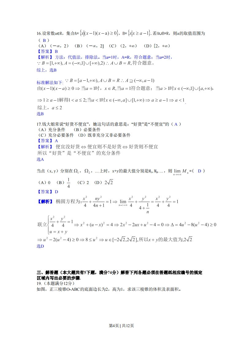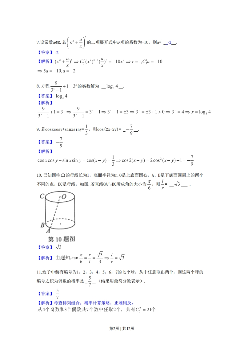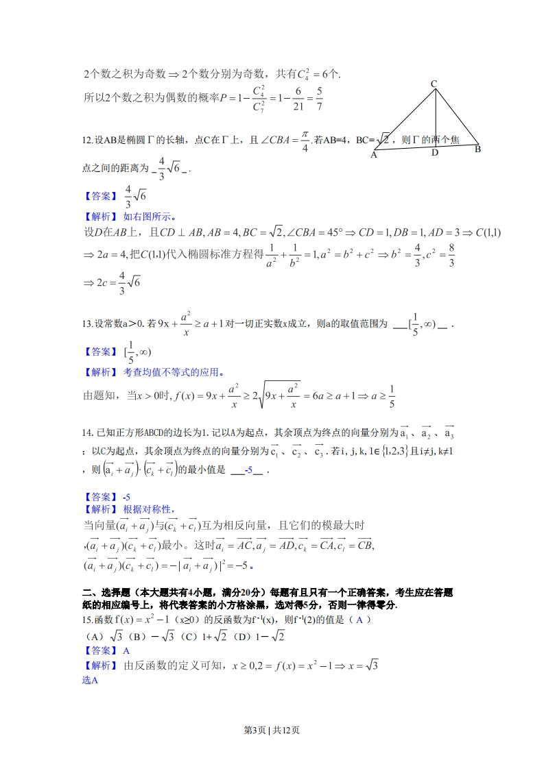 2013年全国普通高等学校招生统一考试上海数学试卷(文史类)考生注意:1.答卷前,务必用钢笔或圆珠笔在答题纸正面清楚地填写姓名、准考证号,并将核对后的条形码贴在指定位置上,在答题纸反面清楚地填写姓名2.本试卷共有23道试题,满分150分.考试时间120分钟.一、填空题(本大题共有14题,满分56分)考生应在答题纸相应编号的空格内直接填写结果,每个空格填对得4分,否则一律得零分,1.不等式<0的解为_(0,)一2x-1【答案】(0,。【解析】x(2x-)<0→x∈(0,22.在等差数列{an}中,若a+a2+a+a,=30,则a+a=15【答案】15【解析】a1+a2+a3+a4=2(a2+a3)=30→a2+a3=153.设meR,m+m-2+(m2-1)i是纯虚数,其中i是虚数单位,则F一【答案】2m2+m-2=0【解析】m2+m-2+(m2-1)i是纯虚数三→1m=-2m2-1≠0,则y1【答案】1【解析】已知-202对1联立上式,解得x=2,y=1,5.己知△ABC的内角A、B、C所对的边分别是a、b、c.若a2+ab+b2-c2=0,则角C的大小是【答案】2元3【解析】a2+ab+b2-c2=0→cosC=a2+b2-c2=二2ab26.某学校高一年级男生人数占该年级学生人数的40%.在一次考试中,男、女生平均分数分别是75、80,则这次考试该年级学生平均分数为78【答案】78【解析】平均成绩=4075+60.80=78100100第1页|共12页7.设常数aER若x2+4的二项展开式中x项的系数为-10,则a=_-2_【答案】2【解析】(x2+4)5→C5(x2)-r(色y=-10x2→r=1,Ca=-10→5a=-10,a=-298.方程3x-1+1=3*的实数解为_l0g,4一·【答案】log34【解析】9+1=3"→93-1=3x-1→3-1=±3→3"=±3+1>0→3=4→x=10g343-19.若cosxcosy+sinxsiny=3,则cos(2x-2y)=-g-7【答案】一【解析】cosxcosy+sin xsin y=cos(x-y)==cos2(x-y)=2cos'(x-y)-1=-7310.己知圆柱2的母线长为1,底面半径为r,0是上底面圆心,A、B是下底面圆周上的两个不同的点,BC是母线,如图.若直线OA与BC所成角的大小为交,则=一V5一64第10题图【答案】√5【解折】由题知,am二-5=5.1-561311.盒子中装有编号为1,2,3,4,5,6,7的七个球,从中任意取出两个,则这两个球的编号之积为偶数的概率是-弓-(结果用最简分数表示),【答案】5【解析】考查排列组合:概率计算策略:正难则反。从4个奇数和3个偶数共7个数中任取2个,共有C2=21个第2页|共12页2个数之积为奇数三2个数分别为奇数,共有C?=6个所以2个数之积为偶数的概率P=1-C三-1-6-C?121=712.设AB是椭圆T的长轴,点C在T上,且∠CBA=T.若AB=4,BC=,则T的南个焦D点之间的距商为号6-【答案】6【解析】如右图所示。设D在AB上,且CD⊥AB,AB=4,BC=√2,∠CBA=45°→CD=1,DB=1,AD=3→C(1,1)三2a=4把C代入椭圆标准方程得+存京=1,a2=b2+c2→62=子,c23→2c=46313.设常数a>0.若9x+“≥a+1对一切正实数x成立,则a的取值范围为,0)一【答案】[,o)【解析】考查均值不等式的应用。由题知,当x>0时,f)=9x+a22,9x+6a2a+1→a2514.已知正方形ABCD的边长为1.记以A为起点,其余顶点为终点的向量分别为a1、a2、a?:以C为起点,其余顶点为终点的向量分别为C、c2、C3.若i,j,k,1∈L,2,3}且ij,k1,则瓦,+a)+c)的最小值是一5_·【答案】5【解析】根据对称性,当向量(a,+a,)与(c+c)互为相反向量,且它们的模最大时(a,+a,)c+c)最小。这时a,=AC,a,=AD,c4=CA,C,=CB,(a+a,)(ck+c)=-|a+a:)=-5.二、选择题(本大题共有4小题,满分20分)每题有且只有一个正确答案,考生应在答题纸的相应编号上,将代表答案的小方格涂黑,选对得5分,否则一律得零分.15.函数f(x)=x2-1(x之0)的反函数为f(x),则f-(2)的值是(A)(A)V3(B)-V3(C)1+V2(D)1-√2【答案】A【解析】由反函数的定义可知,x≥0,2=f(x)=x2-1→x=√3选A第3页|共12页