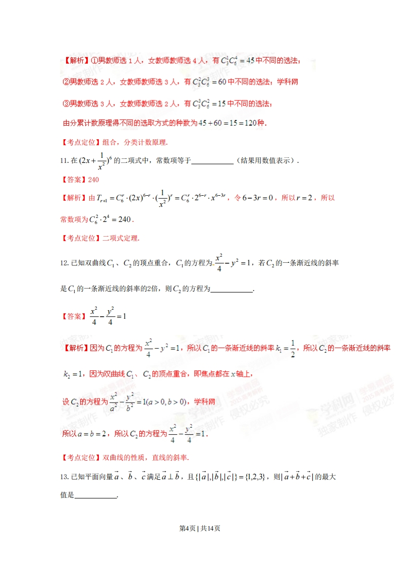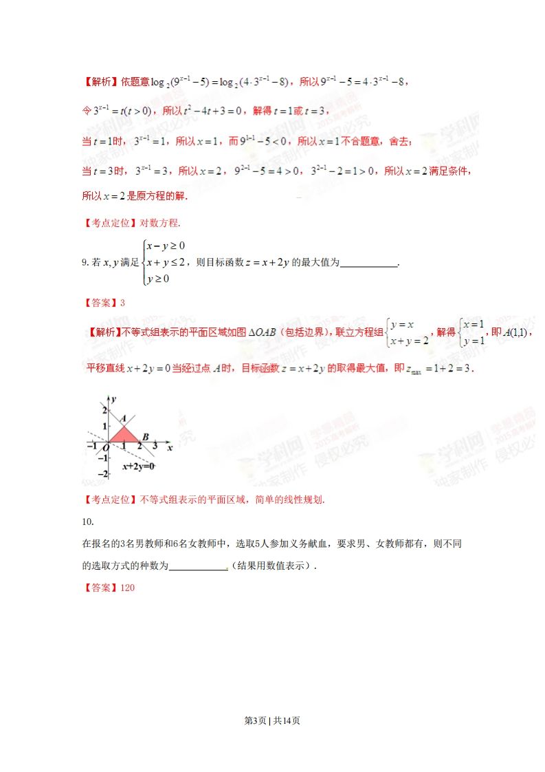 2015年上海市文科试题一,填空题(本大题共14小题,满分56分)考生应在答题纸相应编号的空格内直接填写结果,每个空格填对得4分,否则一律零分)1.函数f(x)=1-3sin2x的最小正周期为【答案】.π折】因为2sin2x=1-cos2x,所以f)=1-号0-cos2x)=-2c0s2x,所以函数f(x)的最小正周期为2π=π,2【考点定位】函数的周期,二倍角的余弦公式.2.设全集U=R.若集合A={1,2,3,4},B={x|2≤x<3},则A∩(CwB)=【答案】{1,4}【解析】因为B={x2≤x<3},所以CB={xx<2或x≥3},又因为A={123,4},所以A∩(CB)={14}.学科网【考点定位】集合的运算.3.若复数z满足3z+z=1+i,其中i是虚数单位,则z=11【答案】二+二42【解析】设z=a+bi(a,b∈R),则z=a-bi,因为3z+z=1+i,14a=1Q=-所以3(a+b)+a-bi=1+i,即4a+2bi=1+i,所以261'即/1b=211所以z=2【考点定位】复数的概念,复数的运算4.设f-((x)为fx=2x+,的反函数,则f-(2)=2【答案】-3第1页1共14页【解析】因为()为fx)=,x的反函数,,x=2,解得x=2x+12x+13所以f八2)=-33【考点定位】反函数,函数的值,5.若线性方程组的增广矩阵为23G)为∫x=3解为01.c2y=5则c-6=【答案】16X=3【解析】由题意是方程组2x+3y=G的解,所以9=21所以y=5y=C2C3=5G-c2=21-5=16.【考点定位】增广矩阵,线性方程组的解法,6.若正三棱柱的所有棱长均为a,且其体积为16√5,则a=【答案】4【解析】依题意,-xaxax2×a=165,解得a=4.【考点定位】等边三角形的性质,正三棱柱的性质.7.抛物线y2=2px(p>0)上的动点Q到焦点的距离的最小值为1,则p=【答案】2【解析】依题意,点Q为坐标原点,所以巳=1,即p=2.2【考点定位】抛物线的性质,最值.8.方程10g2(9-5)=1og2(3-2)+2的解为【答案】2第2页1共14页【解析】依题意1og2(9-1-5)=1og2(431-8),所以9-5=4-3-8,令31=t(t>0),所以t2-4t+3=0,解得t=1或t=3,当t=1时,3-=1,所以x=1,而9-1-5<0,所以x=1不合题意,舍去:当t=3时,31=3,所以x=2,9-5=4>0,32-1-2=1>0,所以x=2满足条件,所以x=2是原方程的解.【考点定位】对数方程.x-y209.若x,y满足x+y≤2,则目标函数z=x+2y的最大值为y≥0【答案】3V=xx=1【解析】不等式组表示的平面区域如图△OAB(包括边界),联立方程组(+y2'解得即A11)y=1平移直线x+2y=0当经过点A时,目标函数z=x+2y的取得最大值,即2m=1+2=3.0151+2y=0侵权必纯家制作侵权必【考点定位】不等式组表示的平面区域,简单的线性规划.10.在报名的3名男教师和6名女教师中,选取5人参加义务献血,要求男、女教师都有,则不同的选取方式的种数为」。(结果用数值表示),【答案】120第3页|共14页