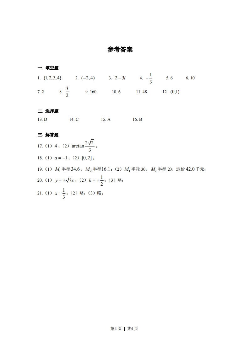 2017年上海市春季高考数学试卷2017.1一.填空题(本大题共12题,满分54分,第16题每题4分,第7~12题每题5分)1.设集合A={1,2,3},集合B={3,4},则AUB=:2.不等式x-1<3的解集为3.若复数z满足2z-1=3+6i(i是虚数单位),则z=:4若cosa=3,则sn(a-=5若关于x、y的方程组+2y=4无解,则实数a=3x+y=66.若等差数列{an}的前5项的和为25,则41+45=7.若P、Q是圆x2+y2-2x+4y+4=0上的动点,则川PQ的最大值为8.已知数列{a}的通项公式为a,=3”,则lim马+a+a++a2=a9.若(x+的二项展开式的各项系数之和为729,则该展开式中常数项的值为10.设椭圆号+广=1的左、右焦点分别为F、F,点P在该椭圆上,则使得△F5P是2等腰三角形的点P的个数是11.设a、a2、…、a为1、2、3、4、5、6的一个排列,则满足|a-a2+a-a+|a-a6|=3的不同排列的个数为12.设a、b∈R,若函数f(x)=x+口+b在区间(L,2)上有两个不同的零点,则f)的取值范围为」二选择题(本大题共4题,每题5分,共20分)13.函数f(x)=(x-1)2的单调递增区间是()A.[0,+o)B.[1,+o)C.(-0,0]D.(-0,1]14.设aeR,“a>0”是“L>0”的()条件aA.充分非必要B.必要非充分C.充要D.既非充分也非必要15.过正方体中心的平面截正方体所得的截面中,不可能的图形是()A.三角形B.长方形C.对角线不相等的菱形D.六边形第1页|共4页16.如图所示,正八边形A,A2AAAA4,A的边长为2,若P为该正八边形边上的动点,则AA·AP的取值范围为()A.[0,8+6V2]B.[-2W5,8+6WD]C.[-8-6v2,2W2]D.[-8-6W2,8+6W2]三解答题(本大题共5题,共14+14+14+16+18=76分)17.如图,长方体ABCD-ABCD中,AB=BC=2,AA=3:(1)求四棱锥A-ABCD的体积:D(2)求异面直线AC与DD所成角的大小:A18.设a∈R,函数f(x)=2+a2*+1(1)求a的值,使得f(x)为奇函数:(2)若f)<0+2对任意x∈R成立,求a的取值范围:219.某景区欲建造两条圆形观景步道M,、M,(宽度忽略不计),如图所示,己知AB⊥AC,AB=AC=AD=60(单位:米),要求圆M,与AB、AD分别相切于点B、D,圆M,与AC、AD分别相切于点C、D:(1)若∠BAD=60°,求圆M1、M2的半径(结果精确到0.1米)(2)若观景步道M1与M2的造价分别为每米0.8千元与每米0.9千元,如何设计圆MM,的大小,使总造价最低?最低总造价是多少?(结果精确到0.1千元)M第2页|共4页0已知双建线「r-茶=16>0,直线1:y=在+mm0,1与「交于PQ两点,P'为P关于y轴的对称点,直线PQ与y轴交于点N(O,m):(1)若点(2,0)是Γ的一个焦点,求Γ的渐近线方程:(2)若6=1,点P的坐标为(-0),且T-P西,求长的值:(3)若m=2,求n关于b的表达式:21.已知函数f()=1o81-x1+x(1)解方程f(x)=1:(2)设xc(l,0.ae0+o,证明:e(-l,且/--f)=-f白:a-xQ-x(3)设数列,}中,玉∈(-1,4=←)3二,nN,求5的取值范围,使3-x得x≥xn对任意n∈N”成立:第3页|共4页