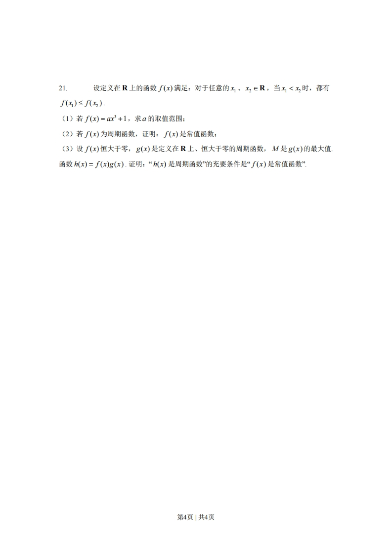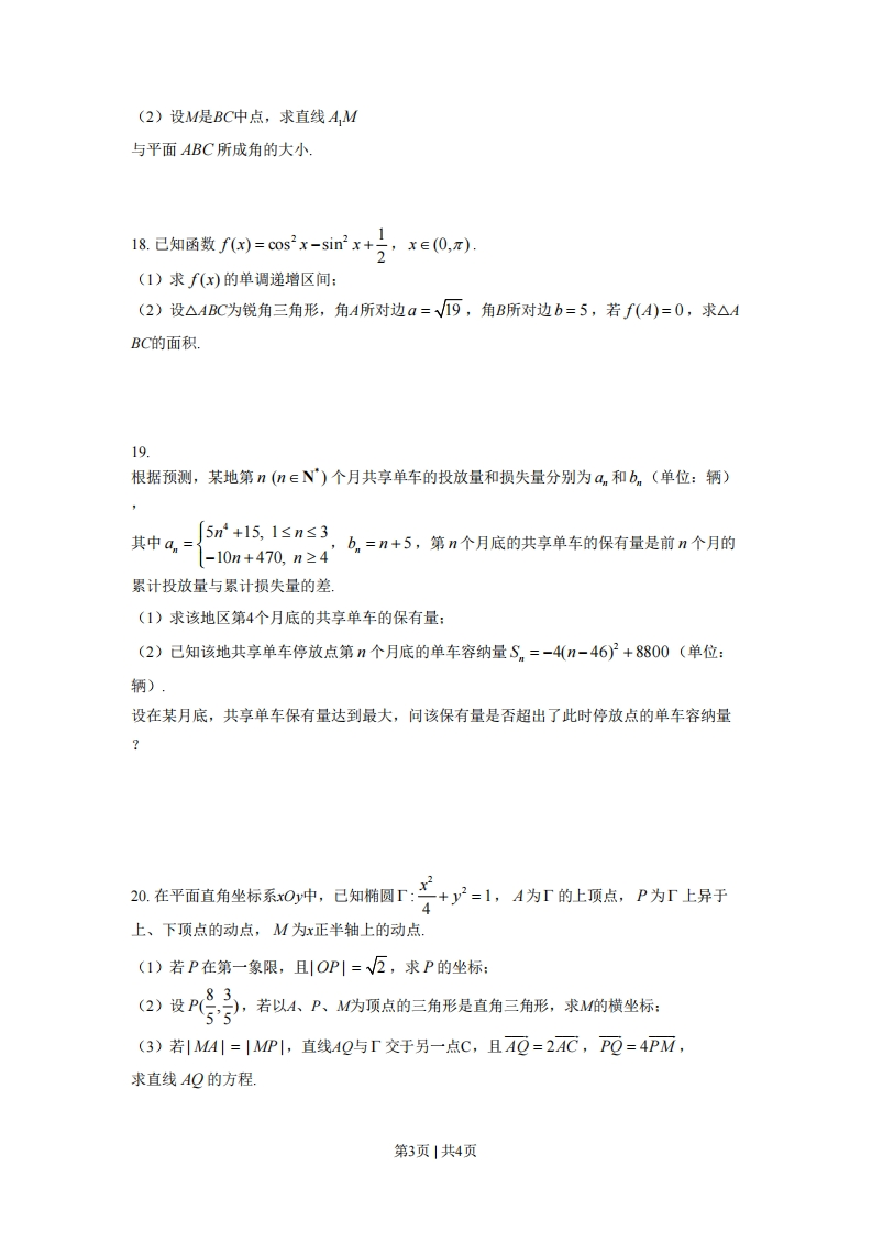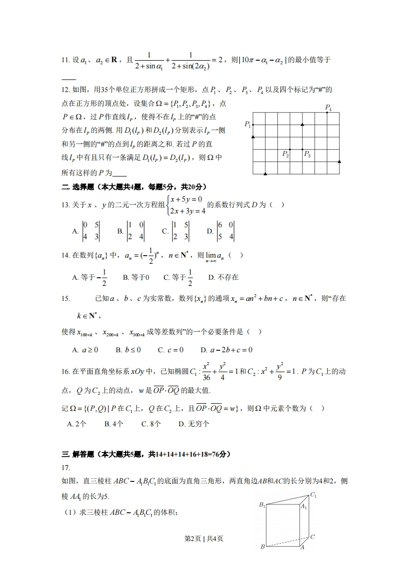 绝密★启用前2017年普通高等学校招生全国统一考试(上海卷)数学试卷(满分150分,考试时间120分钟)1、考生注意2、1.本场考试时间120分钟,试卷共4页,满分150分,答题纸共2页.3、2.作答前,在答题纸正面填写姓名、准考证号,反面填写姓名,将核对后的条形码贴在答思纸指定位置,4、3.所有作答务必填涂或书写在答题纸上与试卷题号对应的区域,不得错位.在试卷上作答一律不得分.5、4.用2B铅笔作答选择题,用黑色字迹钢笔、水笔或圆珠笔作答非选择题.一.填空愿(本大思共12题,满分54分,第16题每思4分,第7~12题每题5分)1.己知集合A={1,2,3,4,,集合B={3,4,5},则A∩B=2.若排列数Pm=6×5×4,则m=3.不等式-1>1的解集为424.己知球的体积为36π,则该球主视图的面积等于D5.已知复数:满足:+2=0,则1=1=AD6设双曲线其上9尔=1(b>0)的焦点为F、5,P为该双曲线上的一点,若|PE|=5,则|PF|=7.如图,以长方体ABCD-AB,C,D的顶点D为坐标原点,过D的三条棱所在的直线为坐标轴,建立空间直角坐标系,若DB的坐标为(4,3,2),则AC,的坐标为8.定义在(0,+o)上的函数y=f(x)的反函数为y=f(x),若g(x)=[3"-1,x≤0f(x),x>0奇函数,则f(x)=2的解为9.已知四个函数:①y=-x:②y=-1:③y=x:④y=x从中任选2个,则事件“所选2个函数的图像有且仅有一个公共点”的概率为10.己知数列{an}和{bn},其中an=n2,n∈N,{b,}的项是互不相等的正整数,若对于任意m∈N,{,}的第a,项等于{a,}的第b,项,则g(bb.b,.)=Ig(bb,bb)第1页|共4页11.设4、a2∈R,且=2,则|10π-%-心2|的最小值等于2+sina 2+sin(22)12.如图,用35个单位正方形拼成一个矩形,点P、P、P、P以及四个标记为“#的点在正方形的顶点处,设集合2={B,,P,P},点P∈2,过P作直线Ip,使得不在Ip上的“#的点分布在ln的两侧.用D()和D,(lp)分别表示lp一侧和另一侧的“#的点到I,的距离之和.若过P的直线lp中有且只有一条满足D(,)=D2(),则2中P所有这样的P为」二选择题(本大思共4题,每题5分,共20分)13.关于x、y的二元一次方程组x+5y=0的系数行列式D为()2x+3y=414.在数列{an}中,an=(-二)”,n∈N,则lima()A等于-B.等于0C.等于D.不存在15.己知a、b、c为实常数,数列{x,}的通项x,=am2+bn+c,n∈N,则“存在k∈N',使得xm+t、x20mt、3m+t成等差数列”的一个必要条件是()A.a20B.bs0 C.c=0 D.a-2b+c=016在平面直角坐标系x0中,已知椭圆G名+-1和G产+少=1.P为C上的动9点,Q为C2上的动点,w是OP.OQ的最大值,记2={(P,Q)川P在C上,Q在C2上,且OP.OQ=w},则2中元素个数为()A.2个B.4个C.8个D.无穷个三解答题(本大题共5题,共14+14+14+16+18=76分)17.如图,直三棱柱ABC-AB,C的底面为直角三角形,两直角边AB和4C的长分别为4和2,侧棱A4的长为5(1)求三棱柱ABC-AB,C的体积:第2页|共4页(2)设M是BC中点,求直线AM与平面ABC所成角的大小18已知函数f)=osx-sin2x+3,xe0,x)(1)求f(x)的单调递增区间:(2)设△ABC为锐角三角形,角A所对边a=V√19,角B所对边b=5,若f(A)=0,求△ABC的面积.19.根据预测,某地第n(n∈N)个月共享单车的投放量和损失量分别为a,和b,(单位:辆)其中an=5n+15,1≤n≤3bn=n+5,第n个月底的共享单车的保有量是前n个月的-10n+470,n≥4'累计投放量与累计损失量的差,(1)求该地区第4个月底的共享单车的保有量:(2)己知该地共享单车停放点第n个月底的单车容纳量S,=-4n-46)2+8800(单位:辆).设在某月底,共享单车保有量达到最大,问该保有量是否超出了此时停放点的单车容纳量20.在平面直角坐标系xO中,已知椭圆T:+广=1,A为r的上顶点,P为r上异于4上、下顶点的动点,M为x正半轴上的动点.(1)若P在第一象限,且OP|=√2,求P的坐标:83(2》设P(,若以4、PM为顶点的三角形是直角三角形,求M的横坐标:(3)若|MA|=|MP|,直线AQ与T交于另一点C,且AO=2AC,P=4PM,求直线AQ的方程,第3页|共4页