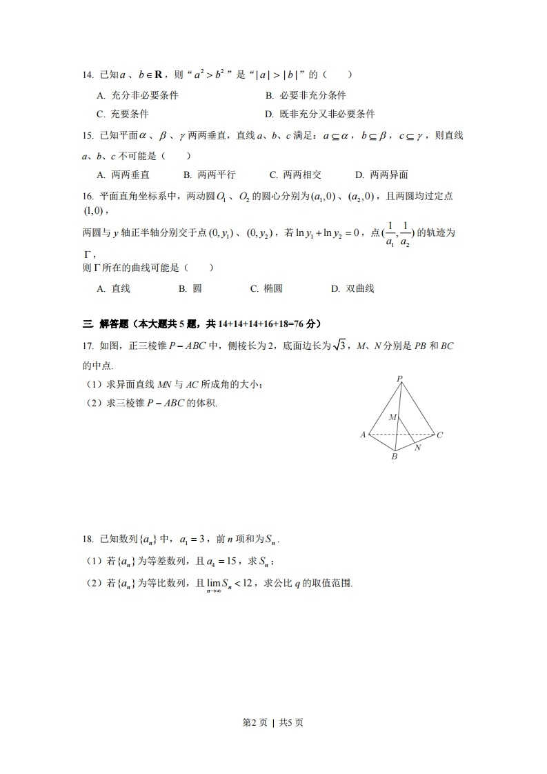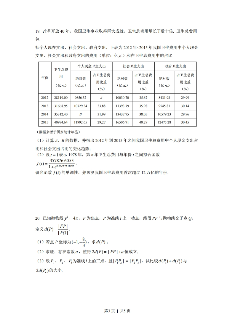 2019年上海市春季高考数学试卷2019.01一.填空题(本大题共12题,满分54分,第16题每题4分,第7~12题每题5分)1.己知集合A={1,2,3,4,5},B={3,5,6},则A∩B=_2.计算:limn2-3n+1n→wn2-4n+13.不等式x+1川<5的解集为4.函数f(x)=x2(x>0)的反函数为5.设i为虚数单位,3迈-i=6+5i,则川z|的值为[2x+2y=-16.己知二元线性方程组有无穷多解,则实数a=」4x+a'y=a7.在(x+广)的二项展开式中,常数项的值为√x8.在△ABC中,AC=3,3sinA=2sinB,且cosC=,则AB=49.首届中国国际进口博览会在上海举行,某高校拟派4人参与连续5天的志愿者活动,其中甲连续参加2天,其余每人各参加1天,问有多少种不同的安排种数(结果用数值表示)10.如图,正方形OABC的边长为a(a>1),函数y=3x2交AB于点Q,函数y=x÷与BC交于点P,当|AQ|+|CPI最小时,a的值为】1.已知P为椭圆父+上=1上任意一点,Q与P关于x轴42对称,E、F为椭圆的左右焦点,若有FPFP≤1,则向量FP与F,Q的夹角范围为12.已知t∈R,集合A=[t,t+U[t+4,t+9],0生A,若存在正数元,对任意a∈A,都有2∈A,则t的值为」二选择题(本大题共4题,年题5分,共20分)13.下列函数中,值域为[0,+o)的是()A.y=2B.y=xC.y=tanxD.y=cosx第1页|共5页14.己知a、b∈R,则“a2>b2”是“|a|>|b|”的()A.充分非必要条件B.必要非充分条件C.充要条件D.既非充分又非必要条件15.己知平面a、B、y两两垂直,直线a、b、c满足:asa,bSB,csy,则直线a、b、c不可能是()A.两两垂直B.两两平行C.两两相交D.两两异面16.平面直角坐标系中,两动圆O、O2的圆心分别为(a,0)、(a2,0),且两圆均过定点1,0),11两圆与y轴正半轴分别交于点(0,)、(0,2),若n片+n2=0,点(一,一)的轨迹为aar,则「所在的曲线可能是()A.直线B.圆C.椭圆D.双曲线三解答题(本大题共5愿,共14+14+14+16+18=76分)17.如图,正三棱锥P-ABC中,侧棱长为2,底面边长为V5,M、N分别是PB和BC的中点。(1)求异面直线MN与AC所成角的大小:(2)求三棱锥P-ABC的体积.18.己知数列{an}中,a1=3,前n项和为Sn(1)若{an}为等差数列,且a=15,求Sn:(2)若{an}为等比数列,且limS<12,求公比q的取值范围.月cD第2页|共5页19.改革开放40年,我国卫生事业取得巨大成就,卫生总费用增长了数十倍.卫生总费用包括个人现在支出、社会支出、政府支出,下表为2012年~2015年我国卫生费用中个人现金支出、社会支出和政府支出的费用(单位:亿元)和在卫生总费用中的占比个人现金卫生支出社会卫生支出政府卫生支出卫生总费年份用占卫生总费占卫生总费占卫生总费绝对数绝对数绝对数用比重用比重用比重(亿元(亿元)(亿元)(亿元)(%)(%)(%)201228119.009656.32A10030.7035.678431.9829.99201331668.9510729.3433.8811393.7935.989545.8130.14201435312.40B31.9913437.7538.0510579.2329.96201540974.6411992.6529.2716506.7140.2912475.2830.45(数据来源于国家统计年鉴)(1)计算A、B的数据,并指出2012年到2015年之间我国卫生总费用中个人现金支出占比和社会支出占比的变化趋势:(2)设t=1表示1978年,第n年卫生总费用与年份1之间拟合函数357876.6053f(t)=1+ei420-01367研究函数f(t)的单调性,并预测我国卫生总费用首次超过12万亿的年份.20.己知抛物线y2=4x,F为焦点,P为准线1上一动点,线段PF与抛物线交于点Q,定义dP)=IFPIIFOI(1)若点P坐标为(-1-8,求d(P):(2)求证:存在常数a,使得2d(P)=|FP|+a恒成立:(3)设P、P、P为准线I上的三点,且IPPI=IPPI,试比较d(P)+d(P)与2d(B)的大小第3页|共5页