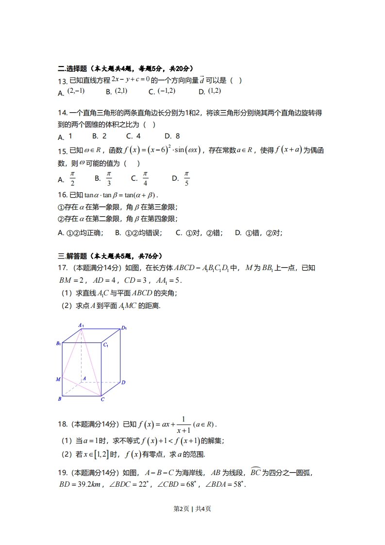 0,若a=4,)与轴交点为4,1创方油线L,在L上任意一点P,总存在一点Q(P异于A)使得AP⊥AQ且AP=AQ,则4=第1页1共4页二选择题(本大题共4题,每题5分,共20分)13.已知直线方程2x-y+c=0的一个方向向量d可以是()A.(2,-1)B.(2,1)C.(-1,2)D.(1,2)14.一个直角三角形的两条直角边长分别为1和2,将该三角形分别绕其两个直角边旋转得到的两个圆锥的体积之比为()A.1B.2C.4D.815.已知oeR,函数f(x)=(x-6)sin(ox),存在常数a∈R,使得f(x+a)为偶函数,则0可能的值为()A月B.号C牙D.16.已知tana·tanB=tan(a+)①存在α在第一象限,角B在第三象限;②存在α在第二象限,角B在第四象限;A.①②均正确;B.①②均错误;C.①对,②错;D.①错,②对:三解答题(本大题共5题,共76分)17.(本题满分14分)如图,在长方体ABCD-AB,CD中,M为BB上一点,已知BM=2,AD=4,CD=3,AA,=5.(1)求直线A,C与平面ABCD的夹角:(2)求点A到平面AMC的距离,18.(本题满分14分)已知f()=+(ae网.x+1(1)当a=1时,求不等式f(x)+1