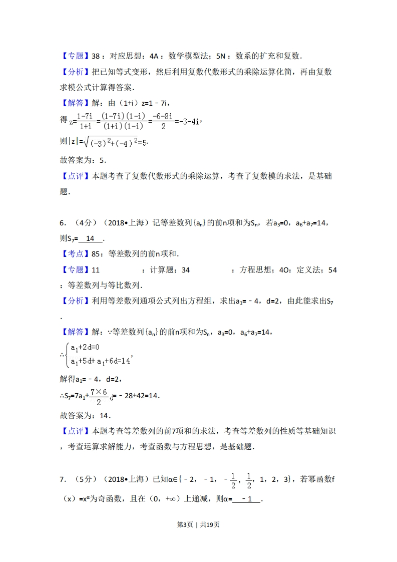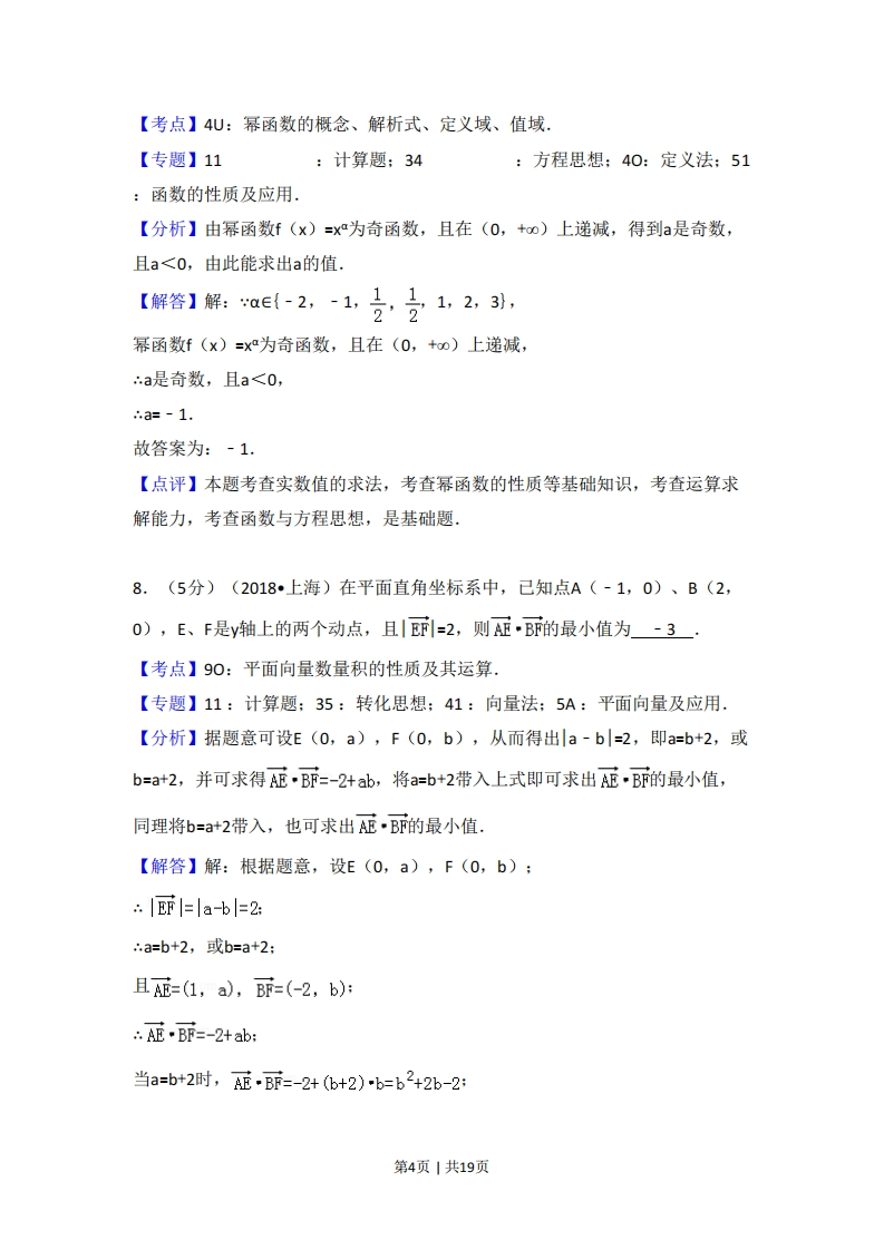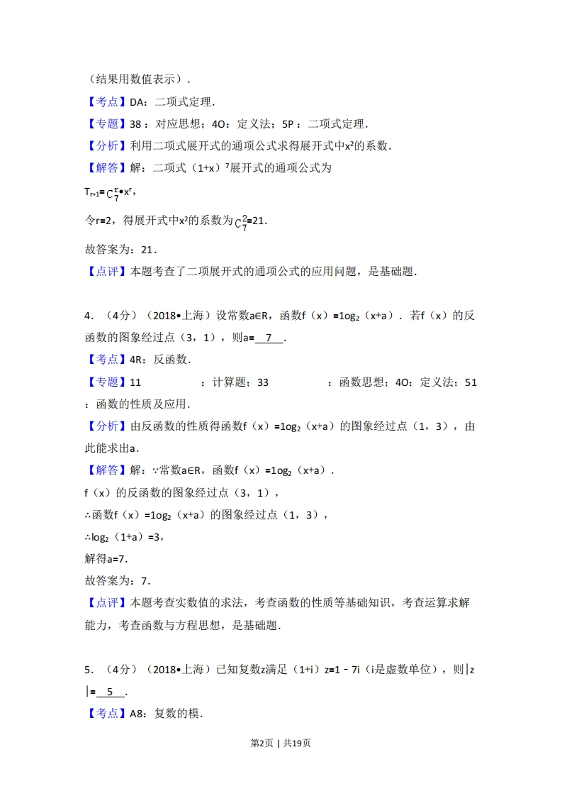 2018年上海市高考数学试卷事考答案与试题佩析一、填空题(本大题共有12题,满分54分,第1~6题每题4分,第7~12题每题5分)考生应在答题纸的相应位置直接填写结果,1.(4分)(2018上海)行列式41的值为1825【考点】OM:二阶行列式的定义.【专题】11:计算题:49:综合法:5R:矩阵和变换,【分析】直接利用行列式的定义,计算求解即可.【解答】解:行列式414x5-2×1=18.25故答案为:18.【点评】本题考查行列式的定义,运算法则的应用,是基本知识的考查.2.(4分)(2018上海)双曲线芝2-y-1的渐近线方程为士号4【考点】KC:双曲线的性质.【专题】11:计算题【分析】先确定双曲线的焦点所在坐标轴,再确定双曲线的实轴长和虚轴长,最后确定双曲线的渐近线方程,C解答】解:~双曲线-y21的a=2,b=1,焦点在x轴而双曲线x2y2a211的渐近线方程为y=bx双曲线号-y2=1的渐近线方程为y=号。故答案为:V加号【点评】本题考察了双曲线的标准方程,双曲线的几何意义,特别是双曲线的渐近线方程,解题时要注意先定位,再定量的解题思想3.(4分)(2018·上海)在(1+×)7的二项展开式中,×2项的系数为21第1页1共19页(结果用数值表示).【考点】DA:二项式定理.【专题】38:对应思想:40:定义法:5P:二项式定理【分析】利用二项式展开式的通项公式求得展开式中x的系数.【解答】解:二项式(1+x)7展开式的通项公式为Tr1=C◆X,令r=2,得展开式中x2的系数为C=21.故答案为:21.【点评】本题考查了二项展开式的通项公式的应用问题,是基础题.4.(4分)(2018·上海)设常数a∈R,函数f(x)=1og2(x+a)·若f(x)的反函数的图象经过点(3,1),则a=7【考点】4R:反函数.【专题】11:计算题:33:函数思想:40:定义法:51:函数的性质及应用【分析】由反函数的性质得函数f(x)=1og2(x+a)的图象经过点(1,3),由此能求出a.【解答】解:常数a∈R,函数f(x)=1og2(x+a).f(x)的反函数的图象经过点(3,1),∴函数f(x)=1og2(x+a)的图象经过点(1,3),log2(1+a)=3,解得a=7.故答案为:7.【点评】本题考查实数值的求法,考查函数的性质等基础知识,考查运算求解能力,考查函数与方程思想,是基础题,5.(4分)(2018·上海)已知复数z满足(1+i)=1-7i(i是虚数单位),则川z=5-【考点】A8:复数的模,第2页|共19页【专题】38:对应思想:4A:数学模型法:5N:数系的扩充和复数.【分析】把已知等式变形,然后利用复数代数形式的乘除运算化简,再由复数求模公式计算得答案【解答】解:由(1+i)z=1-7i,得-8681则z=V(-3)2+(-4)2=5故答案为:5.【点评】本题考查了复数代数形式的乘除运算,考查了复数模的求法,是基础题.6.(4分)(2018·上海)记等差数列{an}的前n项和为Sn,若a3=0,a6+a7=14,则S7=14【考点】85:等差数列的前n项和.【专题】11:计算题:34:方程思想:40:定义法:54::等差数列与等比数列【分析】利用等差数列通项公式列出方程组,求出a1=-4,d=2,由此能求出S,【解答】解:等差数列{an}的前n项和为Sn,a3=0,a6ta=14,a1t20a1+5d+a+6d=14'解得a1=-4,d=2,2°F28+42=14.S,=7a1+7故答案为:14.【点评】本题考查等差数列的前7项和的求法,考查等差数列的性质等基础知识,考查运算求解能力,考查函数与方程思想,是基础题,7.(5分)(2018上海)已知ae{-2,-1,-分1,2,3引,若幂函数(x)=xa为奇函数,且在(0,+oo)上递减,则a=-1第3页1共19页