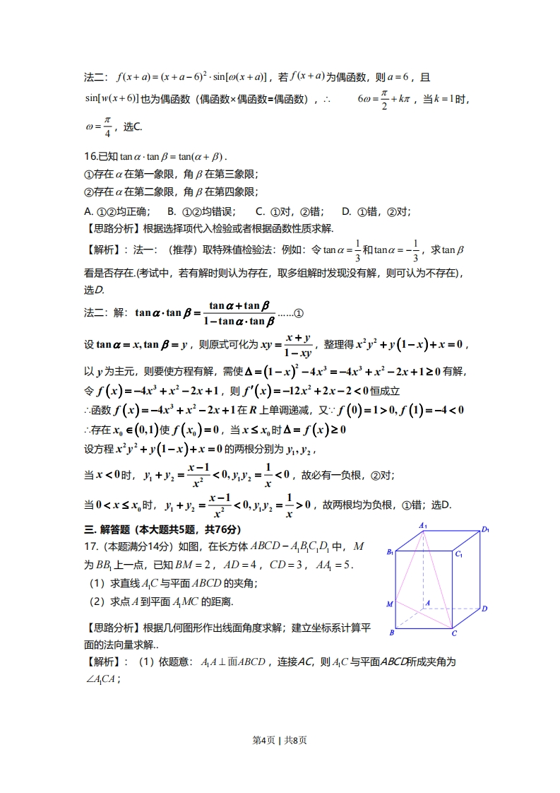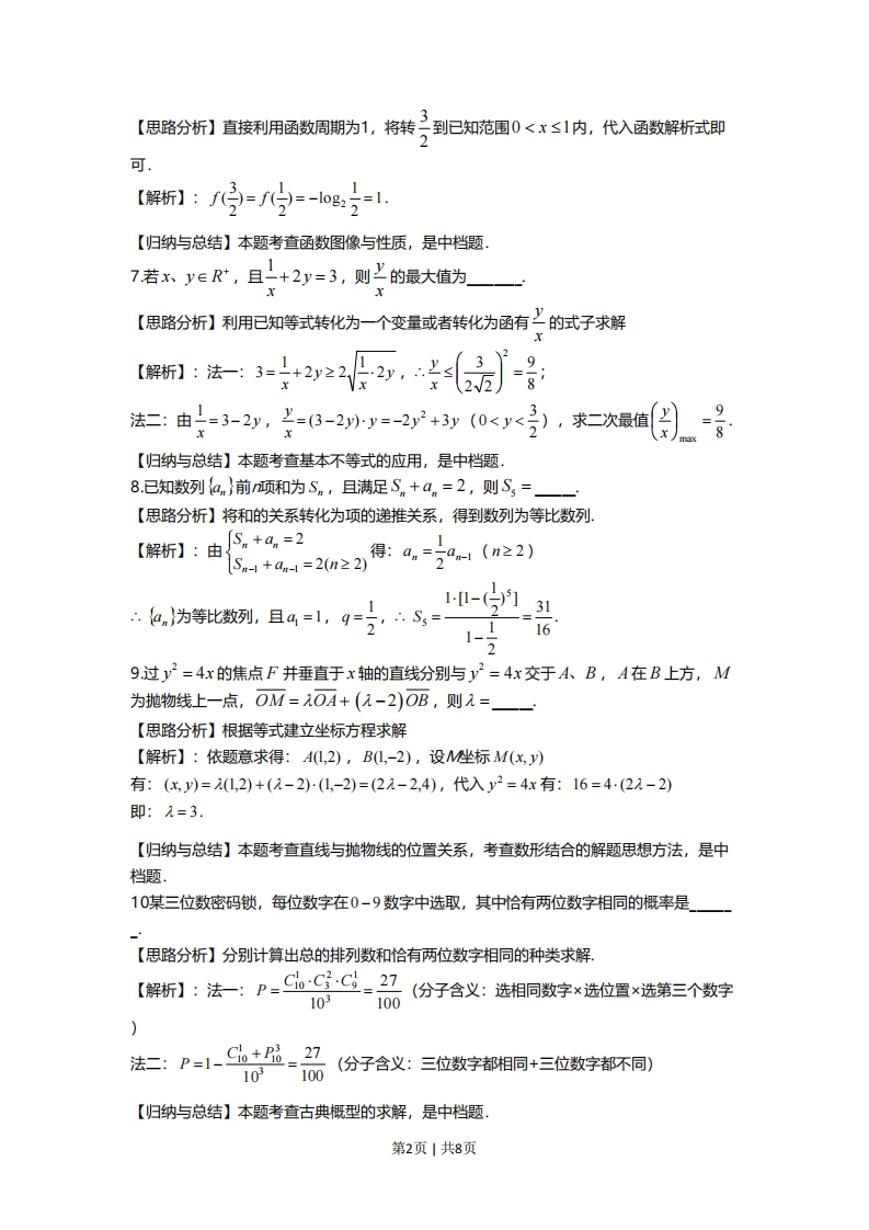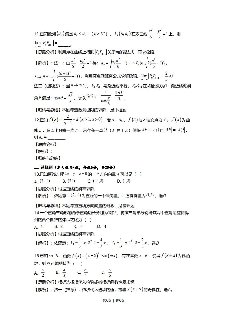 上海市2019届秋季高考数学考试卷◆考答隶与就题解斯一、选择题:(本大题共12题,1-6题每题4分,7-12题每题5分,共54分)1.已知集合A=(-0,3)B=(2,+0),则A∩B=【思路分析】然后根据交集定义得结果【解析】:根据交集概念,得出:(2,3)【归纳与总结】本题主要考查集合的基本运算,比较基础2.已知:∈C且满足上-5=1,求:=【思路分析】解复数方程即可求解结果5-i51【解析】:二=5+i,2=5+i(5+i05-)2626【归纳与总结】本题主要考查复数的基本运算,比较基础3.已知向量a=(1,0,2),b=(2,1,0),则a与b的夹角为【思路分析】根据夹角运算公式cos0=a.b求解【解析】:cos8=a.b三555【归纳与总结】本题主要考查空间向量数量积,比较基础4.已知二项式(2x+1),则展开式中含x2项的系数为【思路分析】根据二项式展开式通项公式求出取得含项的的项,再求系数,【解析】:T+1=C(2x)-"=C'.25-r·x令5-r=2,则r=3,x2系数为C22=40【归纳与总结】本题主要考查项式展开式通项公式的应用,比较基础,x≥05.已知x满足y≥0,求z=2x-3y的最小值为x+y≤2【思路分析】由约束条件作出可行域,化目标函数为直线方程的斜截式,数形结合得到最优解,把最优解的坐标代入目标函数得答案【解析】:线性规划作图:后求出边界点代入求最值,当x=0,y=2时,2min=-6。【归纳与总结】本题考查简单的线性规划,考查数形结合的解题思想方法,是中档题6.已知函数f(x)周期为1,且当0La>0),若a=a,f()与x轴皎点为4,f()为曲线L,在L上任意一点P,总存在一点Q(P异于A)使得AP⊥AQ且AP=AQ,则4=【思路分析】【解析】:【归纳与总结】二.选择题(本大题共4题,年题5分,共20分)13.已知直线方程2x-y+c=0的一个方向向量d可以是()】A.(2,-)B.(2,1)C.(-1,2)D.(1,2)【思路分析】根据直线的斜率求解【解析】:依题意:(2,-)为直线的一个法向量,∴.方向向量为(1,2),选D【归纳与总结】本题考查直线方向向量的概念,是基础题,14.一个直角三角形的两条直角边长分别为1和2,将该三角形分别绕其两个直角边旋转得到的两个圆锥的体积之比为()】A.1B.2C.4D.8【思路分析】根据直线的斜率求解。【解折】:依题意:=写21=号,⅓--P-2-,选8433315.已知o∈R,函数f(x)=(x-6)·sin(ox),存在常数a∈R,使得f(x+a)为偶函数,则0可能的值为()πA.2【思路分析】根据选择项代入检验或者根据函数性质求解【解析】:法一(推荐):依次代入选项的值,检验∫(x+α)的奇偶性,选C;第3页1共8页