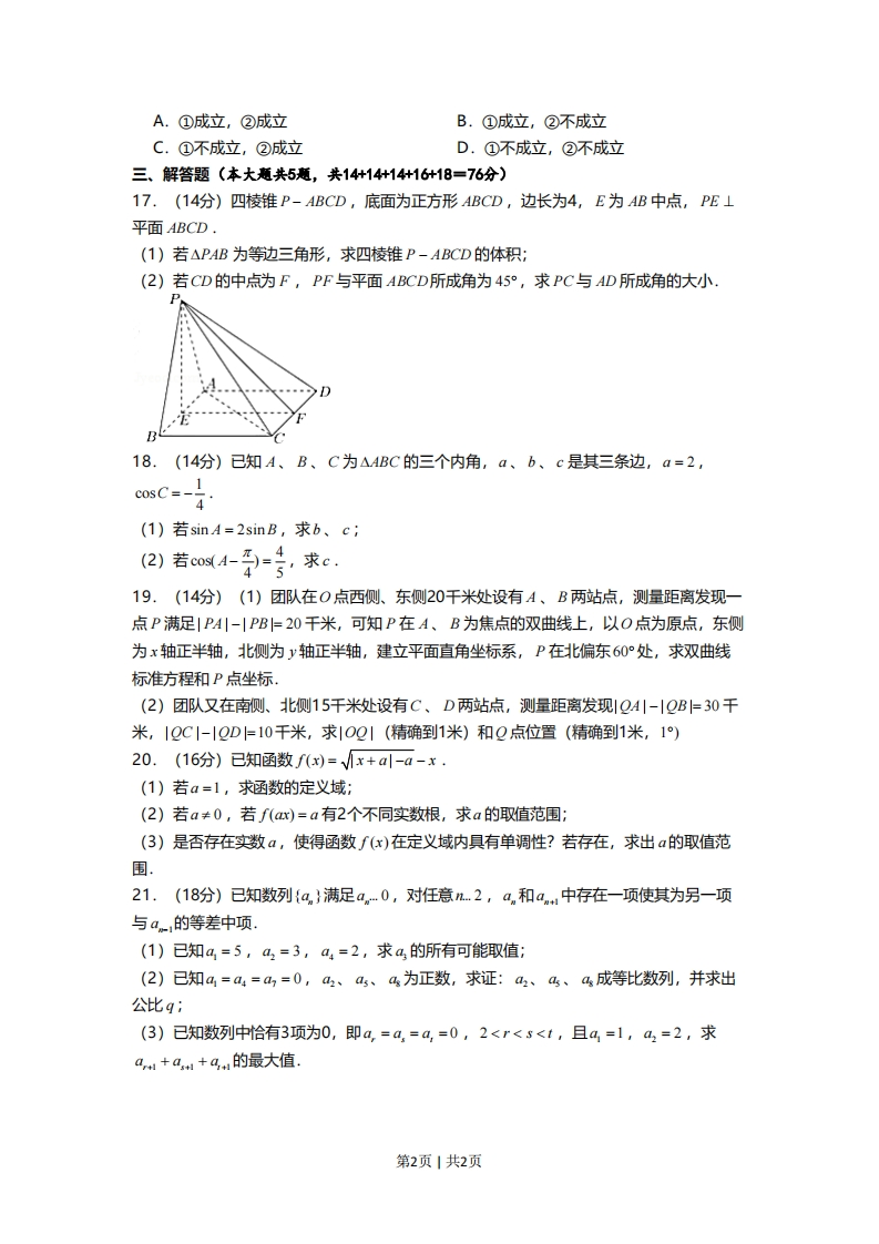 0,存在实数p,使得对任意neN*,cos(n0+p)<3则0的最小值是2二、选择题(本大题共4题,每题5分,共20分)13.下列函数中,在定义域内存在反函数的是(A.f(x)=x2B.f(x)=sinxC.f(x)=2D.f(x)=114.已知集合A={x|x>-1,x∈R,B={x|x2-x-20,x∈R,则下列关系中,正确的是()A.ACBB.dA∈dBC.A∩B=OD.A B=R15.已知函数y=f(x)的定义域为R,下列是f(x)无最大值的充分条件是()A.f(x)为偶函数且关于点(L,1)对称B.f(x)为偶函数且关于直线x=1对称C.f(x)为奇函数且关于点L,1)对称D.f(x)为奇函数且关于直线x=1对称16.在△ABC中,D为BC中点,E为AD中点,则以下结论:①存在△ABC,使得AB.C正=0;②存在三角形△4BC,使得CE/1(CB+CA);它们的成立情况是()第1页1共2页A.①成立,②成立B.①成立,②不成立C.①不成立,②成立D.①不成立,②不成立三、解答题(本大题共5题,共14+14+14+16+18=76分)17.(14分)四棱锥P-ABCD,底面为正方形ABCD,边长为4,E为AB中点,PE⊥平面ABCD·(1)若△PAB为等边三角形,求四棱锥P-ABCD的体积;(2)若CD的中点为F,PF与平面ABCD所成角为45°,求PC与AD所成角的大小PDB18.(14分)已知A、B、C为△ABC的三个内角,a、b、c是其三条边,a=2,osC-号(1)若sinA=2sinB,求b、c;2)若o4-孕-=号,求c419.(14分)(1)团队在0点西侧、东侧20千米处设有A、B两站点,测量距离发现一点P满足IPA|-|PB=20干米,可知P在A、B为焦点的双曲线上,以O点为原点,东侧为x轴正半轴,北侧为y轴正半轴,建立平面直角坐标系,P在北偏东60°处,求双曲线标准方程和P点坐标.(2)团队又在南侧、北侧15干米处设有C、D两站点,测量距离发现QA|-|QB=30干米,1QC|-1QD=10千米,求1OQ1(精确到1米)和Q点位置(精确到1米,1)20.(16分)已知函数f(x)=Mx+a-a-x.(1)若a=1,求函数的定义域;(2)若a≠0,若f(a)=a有2个不同实数根,求a的取值范围;(3)是否存在实数a,使得函数f(x)在定义域内具有单调性?若存在,求出a的取值范围.21.(18分)已知数列{a,}满足a-0,对任意n2,a,和a,中存在一项使其为另一项与a-的等差中项(1)已知a,=5,42=3,a4=2,求4的所有可能取值;(2)已知4=a4=4,=0,2、a、4为正数,求证:42、4、4成等比数列,并求出公比g;(3)已知数列中恰有3项为0,即a,=a,=a,=0,2