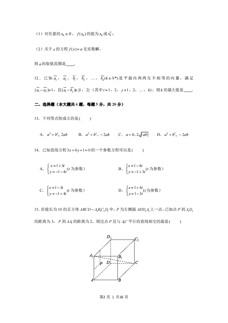 2020年全国高考数学真题试卷及解析(上海卷)一、填空题(本大题共有12题,满分54分,第1-6题每题4分,第7-12题每题5分)1.己知集合A={1,2,4},集合B={2,4,5},则4∩B=一2.计算:limn+18403n-13.己知复数:=1-2i(i为虚数单位),则|=一4.己知函数f(x)=x3,f(x)是f(x)的反函数,则f"(x)=一x+y-2.05.已知x、y满足{x+2y-3n0,则z=y-2x的最大值为_..01 a b6.己知行列式2cd=6,则a b3007.己知有四个数1,2,a,b,这四个数的中位数是3,平均数是4,则ab=一8.已知数列{a,}是公差不为零的等差数列,且4+4。=4,则马+马+…+凸=一ao9.从6个人挑选4个人去值班,每人值班一天,第一天安排1个人,第二天安排1个人,第三天安排2个人,则共有种安排情况.10.已知椭圆C:亡+上=1的右焦点为F,直线1经过椭圆右焦点F,交椭圆C于P、Q43两点(点P在第二象限),若点Q关于x轴对称点为Q,且满足PQ⊥FQ,求直线I的方程是一11.设a∈R,,若存在定义域为R的函数f(x)同时满足下列两个条件:第1页1共16页(1)对任意的x∈R,f(xo)的值为x或x后:(2)关于x的方程f(x)=a无实数解,则a的取值范围是一·12.己知a,G,瓦,瓦,,(k∈N)是平面内两两互不相等的向量,满足|a-42=1,且|a-be1,2}(其中i=1,2,j=1,2,…,k),则k的最大值是二、选择题(本大题共4题,每题5分,共20分)13.下列等式恒成立的是()A.a2+b2 2abB.a2+b2.-2ab C.a+b..2.ablD.a2+b2。-2ab14.己知直线方程3x+4y+1=0的一个参数方程可以是()x=1+31x=1-41A.y=-1-41为参数)B.少=-1+3为参数)Cx=1-3tx=1+4v=一1+“为参数)D.(t为参数)y=1-315.在棱长为10的正方体ABCD-A,B,C,D中,P为左侧面ADD,A上一点,已知点P到AD,的距离为3,P到A4的距离为2,则过点P且与AC平行的直线相交的面是()D第2页|共16页A.AABBB.BBCCC.CC DDD.ABCD16.命题p:存在a∈R且a≠0,对于任意的x∈R,使得f(x+a)0恒成立:命题g2:f(x)单调递增,存在x。<0使得f(x。)=0,则下列说法正确的是()A.只有q,是p的充分条件B.只有g2是p的充分条件C.9,92都是p的充分条件D.9,g都不是p的充分条件三、解答题(本大题共5题,共14+14+14+16+18=76分)17.(14分)己知ABCD是边长为1的正方形,正方形ABCD绕AB旋转形成一个圆柱.(1)求该圆柱的表面积:(2)正方形ABCD绕AB逆时针旋转T至ABC,D,求线段CD与平面ABCD所成的角.CDD18.(14分)己知函数f(x)=sinox,o>0.(①))的周期是4,求0,并求)=的解集:(2)已知a=l,g)=户()+5f-/行-,xe0,,求g()的值域.第3页|共16页