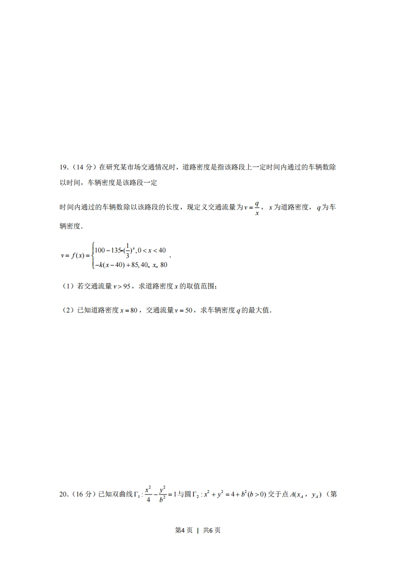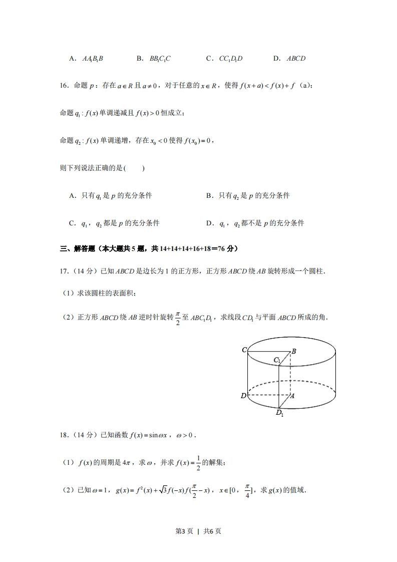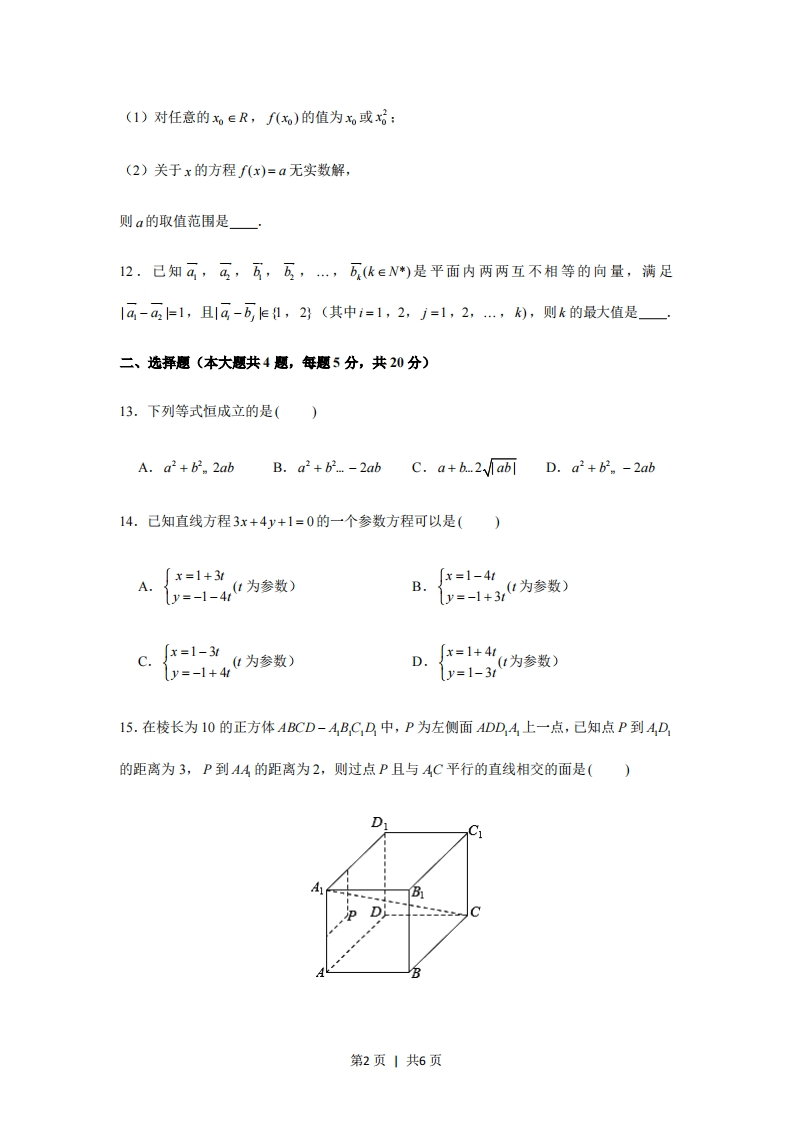2020年全国高考数学真题试卷及解析(上海卷)一、填空题(本大题共有12题,满分54分,第1-6题每题4分,第7-12题每题5分)1.己知集合A={1,2,4},集合B={2,4,5},则4∩B=一2.计算:limn+18403n-13.己知复数:=1-2i(i为虚数单位),则|=一4.己知函数f(x)=x3,f(x)是f(x)的反函数,则f"(x)=一x+y-2.05.已知x、y满足{x+2y-3n0,则z=y-2x的最大值为_..01 a b6.己知行列式2cd=6,则a b3007.己知有四个数1,2,a,b,这四个数的中位数是3,平均数是4,则ab=一8.已知数列{a,}是公差不为零的等差数列,且4+4。=4,则马+马+…+凸=一ao9.从6个人挑选4个人去值班,每人值班一天,第一天安排1个人,第二天安排1个人,第三天安排2个人,则共有种安排情况.10.已知椭圆C:亡+上=1的右焦点为F,直线1经过椭圆右焦点F,交椭圆C于P、Q43两点(点P在第二象限),若点Q关于x轴对称点为Q”,且满足PQ⊥FQ,求直线I的方程是一11.设a∈R,,若存在定义域为R的函数f(x)同时满足下列两个条件:第1页|共6页(1)对任意的x∈R,f(xo)的值为x或x后:(2)关于x的方程f(x)=a无实数解,则a的取值范围是一:12.己知a,G,瓦,瓦,,(k∈N)是平面内两两互不相等的向量,满足|a-42=1,且|a-be1,2}(其中i=1,2,j=1,2,…,k),则k的最大值是二、选择题(本大题共4题,每题5分,共20分)13.下列等式恒成立的是()A.a2+b2 2abB.a2+b2.-2ab C.a+b.2.ablD.a2+b。-2ab14.己知直线方程3x+4y+1=0的一个参数方程可以是()x=1+31x=1-41A.y=-1-41为参数)B.少=-1+3为参数)C.x=1-3tx=1+4v=一1+“为参数)D.y=1-3为参数)15.在棱长为10的正方体ABCD-A,B,C,D中,P为左侧面ADD,A上一点,已知点P到AD,的距离为3,P到A4的距离为2,则过点P且与AC平行的直线相交的面是()D第2页丨共6页A.AABBB.BBCCC.CC DDD.ABCD16.命题p:存在a∈R且a≠0,对于任意的x∈R,使得f(x+a)0恒成立:命题g2:f(x)单调递增,存在x。<0使得f(x。)=0,则下列说法正确的是()A.只有q,是p的充分条件B.只有g2是p的充分条件C.9,92都是p的充分条件D.9,g都不是p的充分条件三、解答题(本大题共5题,共14+14+14+16+18=76分)17.(14分)己知ABCD是边长为1的正方形,正方形ABCD绕AB旋转形成一个圆柱.(1)求该圆柱的表面积:(2)正方形ABCD绕AB逆时针旋转T至ABC,D,求线段CD与平面ABCD所成的角.CDD18.(14分)己知函数f(x)=sinox,o>0.(①))的周期是4,求0,并求)=的解集:(2)已知a=l,g)=户()+5f-/行-,xe0,,求g()的值域.第3页丨共6页