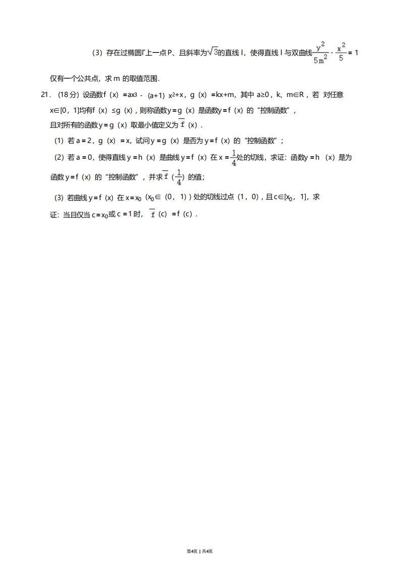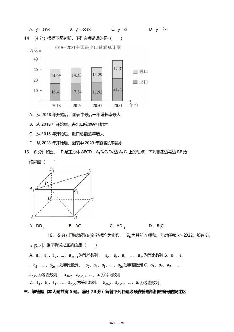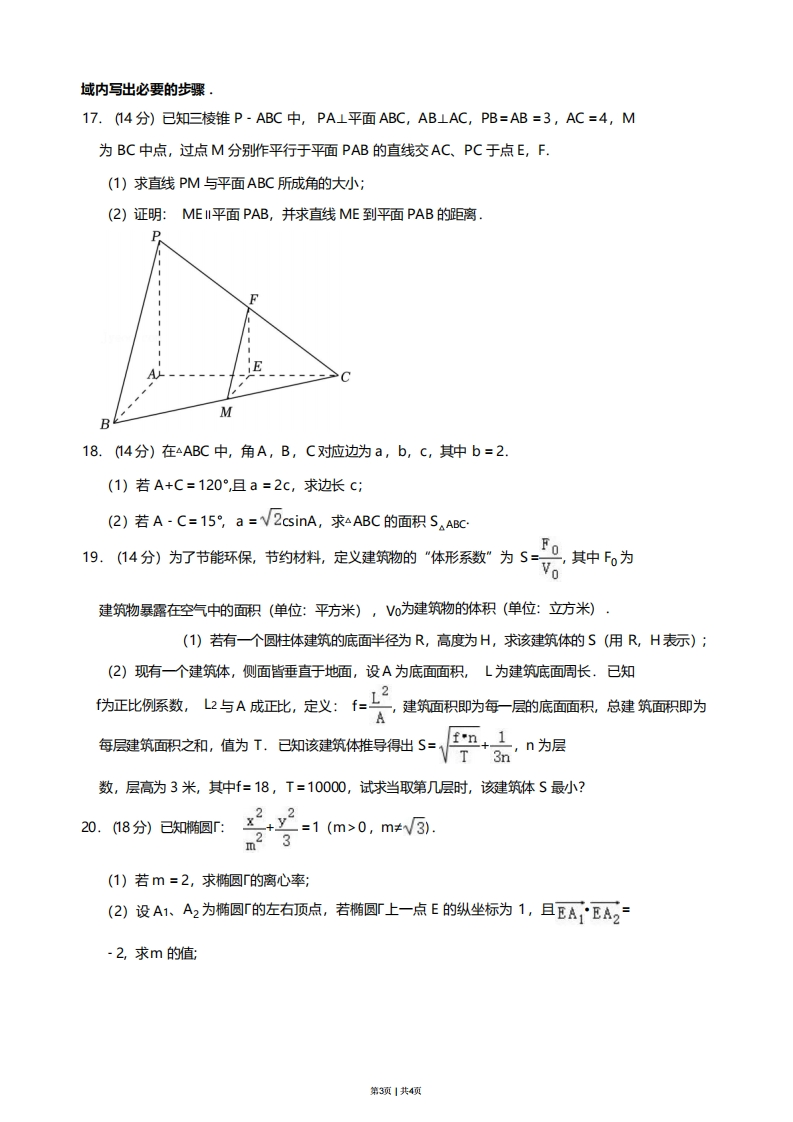 2023年上海市春季高考数学试卷一、填空题(本大题共有12题,满分54分)考生应在答题纸相应编号的空格内直接填写结果,第1题至第6题每个空格填对得4分,第7题至第12题每个空格填对得5分,否则一律得零分】1.4分)已知集合A={1,2),B=1,a,且A=B,则a=2.4分)已知向量a=3,4),b=(1,2),则a-2b=3.4分)若不等式x·1川≤2,则实数x的取值范围为4.4分)已知圆C的一般方程为2+2x+y2=0,则圆C的半径为5.4分)已知事件A发生的概率为P(A)=0.5,则它的对立事件A发生的概率P(A)、6.4分)已知正实数a、b满足a+4b=1,则ab的最大值为7.5分)某校抽取100名学生测身高,其中身高最大值为186cm,最小值为154cm,根据身高数据绘制频率组距分布直方图,组距为5,且第一组下限为153.5,则组数为8.5分)设(1-2x)4=a0+a1x+a2x2+a3X3+ax4,则a0+a4=1og2(x+1),x09.(5分)已知函数f(x)=2·x+1,且g(x)=,则方程g(x)=f(-x),x<02的解为10.5分)已知有4名男生6名女生,现从10人中任选3人,则恰有1名男生2名女生的概率为11.5分)设z1,2∈C且z1=iz2满足业1~1=1,则1~2的取值范围为12.5分)已知空间向量0,0元,0都是单位向量,且0A10成,010元,00d的夹角为60°,若P为空间任意一点,且0丽=1,满足.00s0丽.0丽≤0丽0A,则0丽,00的最大值为二、选择题(本大题共有4题,满分18分)每题有且只有一个正确答案,考生应在答题纸的相应编号上,将代表答案的小方格涂黑,第13题至第14题选对得4分,第15题至第16题选对得5分,否测一律得零分.13,4分)下列函数是偶函数的是()第1页1共4项A.y=sinxB.y=cosxC.y=x3D.y=2x14.(4分)根据下图判断,下列选项错误的是()2018-2021中国进出口总额总计图万亿+403017.3口进口14.0914.3314.2920口出口1017.9321.7316.417.242018201920202021年份A.从2018年开始后,图表中最后一年增长率最大B.从2018年开始后,进出口总额逐年增大C.从2018年开始后,进口总额逐年增大D.从2018年开始后,图表中2020年的增长率最小15.5分)如图,P是正方体ABCD-A,B,C1D1边A1C1上的动点,下列哪条边与边BP始终异面()DPAB-CA.DD1B.ACC.AD1D.B.C16.5分)已知数列an的各项均为实数,Sn为其前n项和,若对任意k>2022,都有Sk>Sk+1l,则下列说法正确的是()A.a1,a3,a5,…,a2n1为等差数列,2,a4,6,,a2n为等批数列B.a1,3,a5,,a2n.1为等比数列,a2,46,…,2n为等差数咧C.a1,2,ag,…,a202为等差数列,a202,a2023,…,4为等批数列D.a1,2,a3,,a202为等比数咧,a202,a2023:,为等差数列三、解答题(本大题共有5题,满粉78分)解答下列各题必须在答题纸相应编号的规定区第2项1共4项域内写出必要的步骤17.14分)已知三棱锥P-ABC中,PA⊥平面ABC,AB⊥AC,PB=AB=3,AC=4,M为BC中点,过点M分别作平行于平面PAB的直线交AC、PC于点E,F.(1)求直线PM与平面ABC所成角的大小:(2)证明:MEI平面PAB,并求直线ME到平面PAB的距离.AL-B18.14分)在△ABC中,角A,B,C对应边为a,b,C,其中b=2.(1)若A+C=120°,且a=2c,求边长c;(2)若A-C=15°,a=√2 csinA,求aABC的面积SAABC.19.(14分)为了节能环保,节约材料,定义建筑物的“"体形系数”为S=其中Fo为建筑物暴露在空气中的面积(单位:平方米),V0为建筑物的体积(单位:立方米)(1)若有一个圆柱体建筑的底面半径为R,高度为H,求该建筑体的S(用R,H表示);(2)现有一个建筑体,侧面皆垂直于地面,设A为底面面积,L为建筑底面周长.已知伪正比系数,上与A成比,定义:f仁子,建筑面积即为每一层的底面面积,总建筑面职即为A每层建筑面积之和,值为T.已知该建筑体推导得出S=Em+1,n为层T3n数,层高为3米,其中f=18,T=10000,试求当取第几层时,建筑体S最小?20.18分)已知椭圆「:x2+y2-1(m>0,m*W3):m23(1)若m=2,求椭圆「的离心率;(2)设A1、A2为椭圆「的左右顶点,若椭圆「上一点E的纵坐标为1,且EA·EA2·2,求m的值第3项1共4项