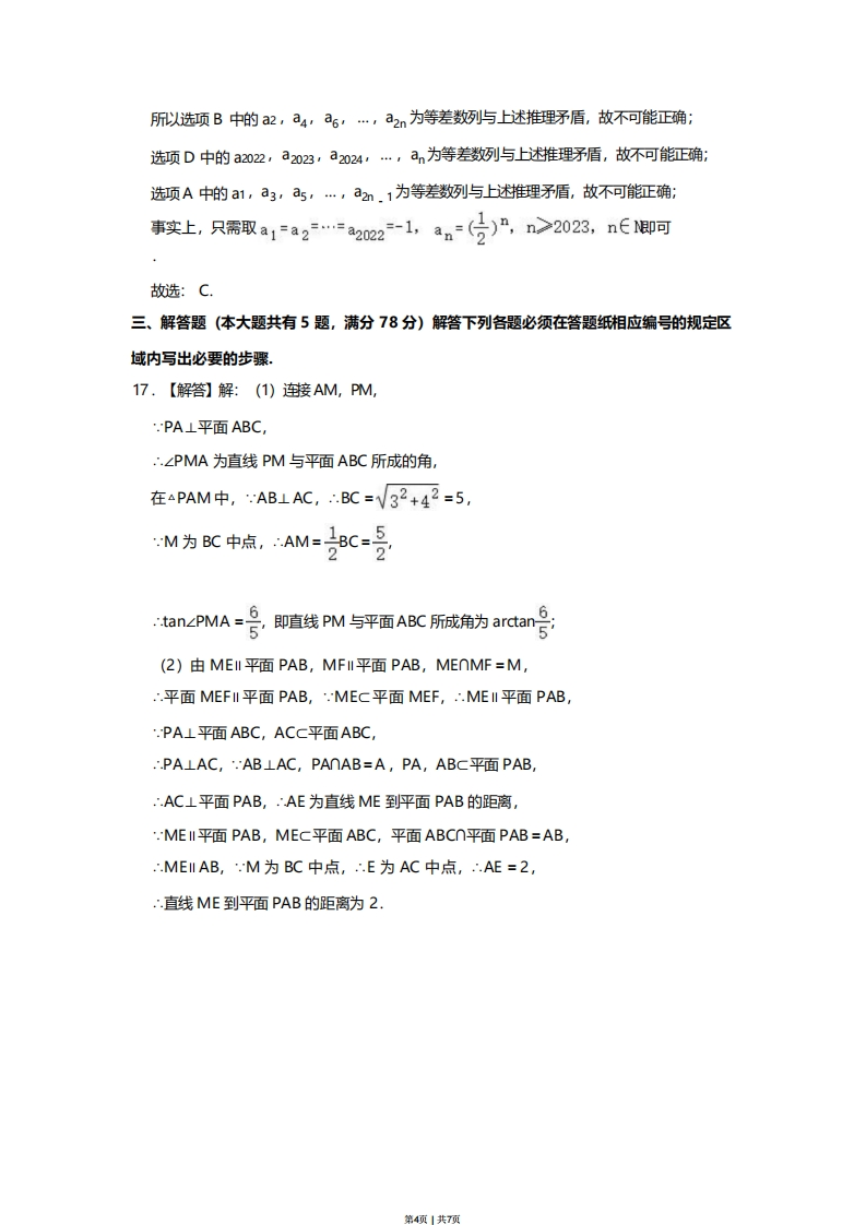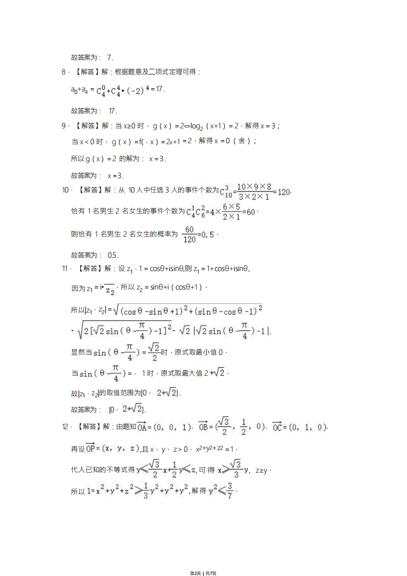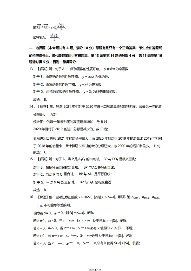 2023年上海市春季高考数学试卷参考答案与试题解析一、填空题(本大题共有12题,满分54分)考生应在答题纸相应编号的空格内直接填写结果,第1题至第6题每个空格填对得4分,第7题至第12题每个空格填对得5分,否则一律得零分.1.【解答】解:集合A={1,2},B={1,,且A=B,则a=2故答案为:2.2.【解答】解:因为向量a=3,4),b=(1,2),所以a-2b=(3-2×1,4-2×2)=(1,0).故答案为:(1,0)3.【解答】解:因为k-1≤2,所以-2≤x·1≤2,所以-1≤x≤3,故答案为:【-1,3引.4.【解答】解:根据圆C的一般方程为x2+2x+y2=0,可得圆C的标准方程为(x+1)2+y2=1,故圆C的圆心为(0,-1),半径为1,故答案为:1.5.【解答】解:由题意知P(A)+P(A)=1,所以P(A)=1-P(A)=0.5,故答案为:056.解浴]解正数ab凝a4b=1,则动=×a4<}×(2)2六当且赠a=b时等号成立故答案为:167.【解答】解:极差为186-154=32,组距为5,且第一组下限为153.5,32=64,故组数为7组,第1页1共7项故答案为:78·【解答】解:根据题意及二项式定理可得:+a4=c9+c4(-2)4=17.故答案为:7.9·【解答】解:当x≥0时·g(x)=2=l0g2(x+1)=2·解得X=3;当×<0时·g(x)=f(·×)=2+1=2·解得×=0(舍):所以g(x)=2的解为:X=3.故答案为:X=3.0【紧】察:从0人中选3人的#个数大c品-0是120恰有1名男生2名女生的事件个数为C以C子46×5=602×1则恰有1名男生2名女生的概率为601200.5.故答案为:051·【解答】解:设z1·1=cos0+isine,则Z1=1+cos0+isin6,因为2☑=z2·所以名=sin9+H(cos8+1)·所以4Z-√(cos6-sin9+1)2+(sin日-cos8-1)2V2[V2ain()-1].V2IV2sin()-1l.显然当n(9父)-受时原式取最小准02当sin(日年)1时·原式取最大值2+W②故☑·22的取值范围为0·2+√21故答案为:0·2√21.2.【得1察由照类0丽-0,0,1)0丽=号,克0以元-0,1,0)再设0=(x,y,z),且x·y·z>0·x2+y2+卫=1·代人已知的不等式洞人号人,可得>9,g所以1=2+y2+22>72+y2y2,据得y2<号第2项1共7页故0师0d=y<四故答案为:7二、选择题(本大题共有4题,满分18分)每题有且只有一个正确答案,考生应在答题纸的相应编号上,将代表答案的小方格涂黑,第13题至第14题选对得4分,第15题至第16题选对得5分,否则一律得零分.13.【解答】解:对于A,由正弦函数的性质可知,y=siv为奇函数;对于B,由正弦函数的性质可知,y=c0sx为偶函数:对于C,由幂函数的性质可知,y=x3为奇函数:对于D,指数函数的性质可知,y=2x为非奇非偶函数,故选:B.14,【解答】解:显然2021年相对于2020年进出口额增量增加特别明显,故最后一年的增长率最大,A对:统计图中的每一年条形图的高度逐年增加,故B对:2020年相对于2019的进口总额是减少的,故C错;显然进出口总额2021年的增长率最大,而2020年相对于2019年的增量比2019年相对于2018年的增量小,且计算增长率时前者的分母还大,故2020年的增长率最小,D对,故选:C15.【解答】解:对于A,当P是AC1的中点时,BP与DD1是相胶直线;对圩B,根据异面直线的定义知,BP与AC是异面直线;对圩C,当点P与C1重合时,BP与AD,是平行直线:对于D,当点P与C1重合时,BP与B,C是相交直线,故选:B.16.【解答】解:由对任意正整数k>2022,都有Sk>Sk+1,可以知道a2022,a2033,a2024,an不可能为等差数列,因为若d=0,an=0,则S=Sk+1,矛盾:若d=0,an<0,当n→+o∞,Sn一-o,k使得Sk+1>Sk,矛盾:若d=0,an>0,当n一+∞,Sn→+∞,必有k使得Sk+1>Sk,矛盾;若d>0,当n→+o,an一+o∞,Sn→+oo必有k使得Sk+1>Sk,矛盾;若d<0,当n一+∞,an→·∞,Sn一-∞,必有k使得Sk+1>S,矛盾第3项1共7页