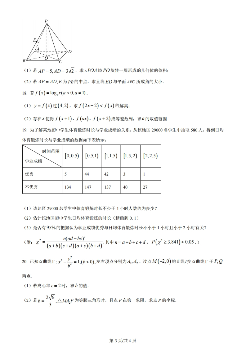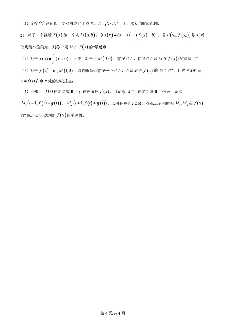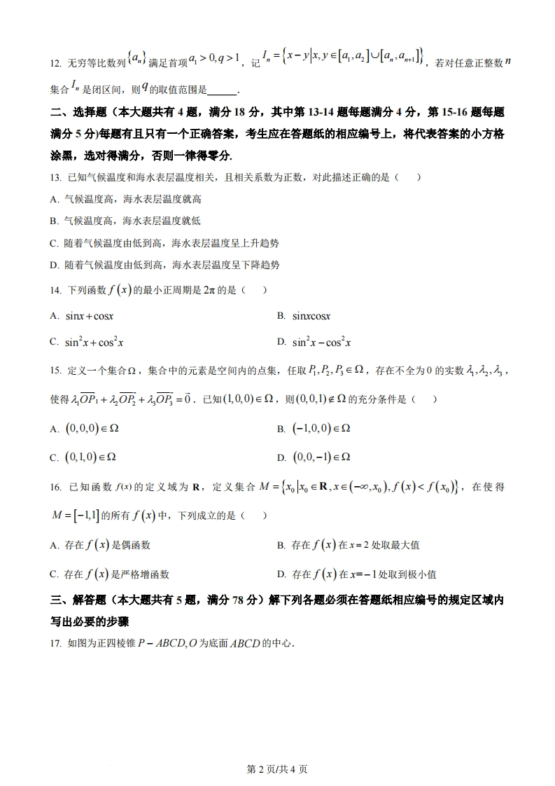 2024年上海市高考数学试卷(网络回忆版)2024.06一、填空题(本大题共有12题,满分54分.其中第1-6题每题4分,第7-12题每题满分5分)考生应在答题纸相应编号的空格内直接填写结果1.设全集0=1234,5},集合4=2,4),则A=2.己知-则f(3)=3.已知x∈R则不等式x-2x-3<0的解集为4,已知f(x)=r+a,x∈R,且f()是奇函数,则a=5.已知keR,ā=(25),5=(6个,且a/i,则k的值为6.在(x+)“的二项展开式中,若各项系数和为32,则?项的系数为」7.已知抛物线y=4x上有一点P到准线的距离为9,那么点P到x轴的距离为8.某校举办科学竞技比赛,有4、B、C3种题库,A题库有5000道题,B题库有4000道题,C题库有3000道题.小申己完成所有题,他A题库的正确率是0.92,B题库的正确率是0.86,C题库的正确率是0.2.现他从所有的题中随机选一题,正确率是一=+2-m(meR)9.己知虚数:,其实部为1,且二则实数m为10.设集合A中的元素皆为无重复数字的三位正整数,且元素中任意两者之积皆为偶数,求集合中元素个数的最大值一·11.己知点B在点C正北方向,点D在点C的正东方向,BC=CD,存在点A满足∠BAC=16.5°,∠DAC=37°,则∠BCA=_(精确到0.1度)第1页共4页12.无穷等比数列{a满足首项4>0g>1,记,={x-y∈[a,4小U[a,a]}若对任意正整数n集合m是闭区间,则9的取值范围是二、选择题(本大题共有4题,满分18分,其中第13-14题每题满分4分,第15-16题每题满分5分)每题有且只有一个正确答案,考生应在答题纸的相应编号上,将代表答案的小方格涂黑,选对得满分,否则一律得零分13.己知气候温度和海水表层温度相关,且相关系数为正数,对此描述正确的是()A.气候温度高,海水表层温度就高B.气候温度高,海水表层温度就低C.随着气候温度由低到高,海水表层温度呈上升趋势D.随着气候温度由低到高,海水表层温度呈下降趋势14.下列函数f(x)的最小正周期是2π的是()A.sinx+cosxB.sinxcosxC.sinx+cosxD.sin'x-cosx15.定义一个集合2,集合中的元素是空间内的点集,任取,乃,P∈2,存在不全为0的实数入,入2,入,使得元,OP1+元OE+元OP=0.己知(1,0,0)∈2,则(0,0,1)廷2的充分条件是()A.(0,0,0)∈2B.(-1,0,0)∈2c.(0,1,0)∈2D.(0,0,-1)∈216.已知函数fx)的定义域为R,定义集合M={x∈R,x∈(-o,),f(x)0,a≠1).(1)y=f(x)过(4,2),求f(2x-2)0,左右顶点分别为4,4,过点M-2.0)的直线/交双线r于P0两点。(1)若离心率e=2时,求b的值.2)若6=26,△M4,P为等腰三角形时,且点P在第一象限,求点P的坐标第3页共4页