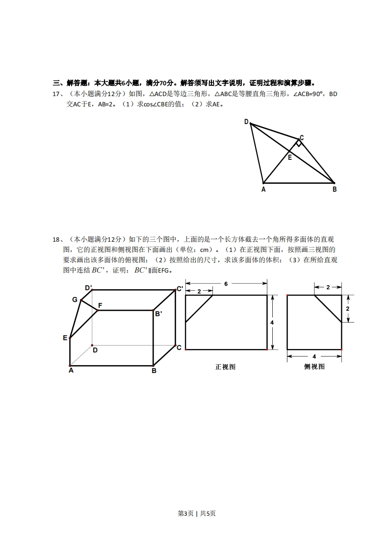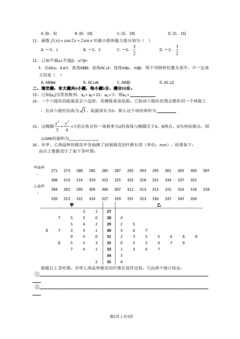 2008年普通高等学校统一考试(海南卷)数学(文科)一、选择题:本大题共12小题,每小题5分,满分60分。在每小题给出的四个选项中,只有一项是符合题目要求的。1、己知集合M={x(x+2(x-1)<0,N={xx+1<0},则M∩N=()开始A.(-1,1)B.(-2,1)C.(-2,-1))D.(1,2)2、双曲线二-上=1的焦距为()输入a,b,c102A.3V2B.4V2c.3V5D.4V5X=a3已知复数:=1-1,则子7()b>xA.2B.-2C.2i D.-2i4、设f(x)=xlnx,若f(x)=2,则x=()A.e2B.ec.In2D.In225、己知平面向量a=(1,-3),b=(4,-2),否几a+b与a垂直,则元是()A.-1B.1C.-2D.2输出x6、右面的程序框图,如果输入三个实数a、b、c,要求输出这三个数中最大的数,那么在空白的判断框中,应该填入下面四个选项中的()结束A.C>xB.x>cC.c>bD.b>c7、己知a1>4,>a3>0,则使得(1-ax)2<1(i=1,2,3)都成立的x取值范围是()A(0,)B.0,2)c.(0,1)2D.(0,二)a41aa8、设等比数列{a,}的公比q=2,前n项和为S。,则三=()a.1517A.2B.4c.2D.29、平面向量a,b共线的充要条件是()A.a,b方向相同B.a,b两向量中至少有一个为零向量C.3ER,b=iaD.存在不全为零的实数,入2,,a+元b=010、点P(x,y)在直线4x3y0上,且满足一14s一y≤7,则点P到坐标原点距离的取值范围是()第1页1共5页A.0,5]B.[0,10]C.[5,10]D.[5,15]11、函数f(x)=cos2x+2sinx的最小值和最大值分别为()3A.-3,1B.-2,2c.-3,D.-2,12、己知平面a1平面B,a∩=,点AEa,AI,直线ABI山,直线AC,直线mlla,m邮,则下列四种位置关系中,不一定成立的是()A.ABIImB.AC⊥mC.ABIlBD.AC⊥p二、填空题:本大题共4小题,每小题5分,满分20分。13、己知{an}为等差数列,a3+ag=22,a6=7,则a5=14、一个六棱柱的底面是正六边形,其侧棱垂直底面。己知该六棱柱的顶点都在同一个球面上,且该六棱柱的高为√3,底面周长为3,那么这个球的体积为」15、过稀圆号+少=1的右焦点作一条斜率为2的直线与椭圆交于A、B两点,0为坐标原点,则54△OAB的面积为16、从甲、乙两品种的棉花中各抽测了25根棉花的纤维长度(单位:mm),结果如下:由以上数据设计了如下茎叶图:甲品种271273280285285287292294295301303303307308310314319323325325328331334337352乙品种284292295304306307312313315315316318318320322322324327329331333336337343356甲乙312750285422925331307940316885533202247941336>3432356根据以上茎叶图,对甲乙两品种棉花的纤维长度作比较,写出两个统计结论:①②第2页|共5页三、解答题:本大题共6小题,满分70分。解答须写出文字说明,证明过程和演算步骤。17、(本小题满分12分)如图,△ACD是等边三角形,△ABC是等腰直角三角形,∠ACB=90°,BD交AC于E,AB=2。(1)求coS∠CBE的值:(2)求AE.EB18、(本小题满分12分)如下的三个图中,上面的是一个长方体截去一个角所得多面体的直观图,它的正视图和侧视图在下面画出(单位:cm)。(1)在正视图下面,按照画三视图的要求画出该多面体的俯视图:(2)按照给出的尺寸,求该多面体的体积:(3)在所给直观图中连结BC',证明:BC'I面EFG。D2—2GF2B4ED4B正视图侧视图第3页|共5页