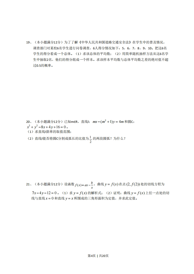 2008年普通高等学校统一考试(海南卷)数学(文科)一、选择题:本大题共12小题,每小题5分,满分60分。在每小题给出的四个选项中,只有一项是符合题目要求的。1、己知集合M={x(x+2(x-1)<0,N={xx+1<0},则M∩N=()开始A.(-1,1)B.(-2,1)C.(-2,-1))D.(1,2)2、双曲线二-上=1的焦距为()输入a,b,c102A.3V2B.4V2c.3V5D.4V5X=a3已知复数:=1-1,则子7()b>xA.2B.-2C.2i D.-2i4、设f(x)=xlnx,若f(x)=2,则x=()A.e2B.ec.In2D.In225、己知平面向量a=(1,-3),b=(4,-2),否几a+b与a垂直,则元是()A.-1B.1C.-2D.2输出x6、右面的程序框图,如果输入三个实数a、b、c,要求输出这三个数中最大的数,那么在空白的判断框中,应该填入下面四个选项中的()结束A.C>xB.x>cC.c>bD.b>c7、己知a1>4,>a3>0,则使得(1-ax)2<1(i=1,2,3)都成立的x取值范围是()A(0,)B.0,2)c.(0,1)2D.(0,二)a41aa8、设等比数列{a,}的公比q=2,前n项和为S。,则三=()a.1517A.2B.4c.2D.29、平面向量a,b共线的充要条件是()A.a,b方向相同B.a,b两向量中至少有一个为零向量C.3ER,b=iaD.存在不全为零的实数,入2,,a+元b=010、点P(x,y)在直线4x3y0上,且满足一14s一y≤7,则点P到坐标原点距离的取值范围是()第1页1共20页A.0,5]B.[0,10]C.[5,10]D.[5,15]11、函数f(x)=cos2x+2sinx的最小值和最大值分别为()3A.-3,1B.-2,2c.-3,D.-2,12、己知平面a1平面B,a∩=,点AEa,AI,直线ABI山,直线AC,直线mlla,m邮,则下列四种位置关系中,不一定成立的是()A.ABIImB.AC⊥mC.ABIlBD.AC⊥p二、填空题:本大题共4小题,每小题5分,满分20分。13、己知{an}为等差数列,ag+ag=22,a6=7,则a5=14、一个六棱柱的底面是正六边形,其侧棱垂直底面。己知该六棱柱的顶点都在同一个球面上,且该六棱柱的高为√3,底面周长为3,那么这个球的体积为」15、过稀圆号+少=1的右焦点作一条斜率为2的直线与椭圆交于A、B两点,0为坐标原点,则54△OAB的面积为16、从甲、乙两品种的棉花中各抽测了25根棉花的纤维长度(单位:mm),结果如下:由以上数据设计了如下茎叶图:甲品种271273280285285287292294295301303303307308310314319323325325328331334337352乙品种284292295304306307312313315315316318318320322322324327329331333336337343356甲d312750285422925331307940316885533202247941336>3432356根据以上茎叶图,对甲乙两品种棉花的纤维长度作比较,写出两个统计结论:①②第2页1共20页三、解答题:本大题共6小题,满分70分。解答须写出文字说明,证明过程和演算步骤。17、(本小题满分12分)如图,△ACD是等边三角形,△ABC是等腰直角三角形,∠ACB=90°,BD交AC于E,AB=2。(1)求coS∠CBE的值:(2)求AE.EB18、(本小题满分12分)如下的三个图中,上面的是一个长方体截去一个角所得多面体的直观图,它的正视图和侧视图在下面画出(单位:cm)。(1)在正视图下面,按照画三视图的要求画出该多面体的俯视图:(2)按照给出的尺寸,求该多面体的体积:(3)在所给直观图中连结BC',证明:BC'I面EFG。D一2—2GF2B4ED4B正视图侧视图第3页1共20页
