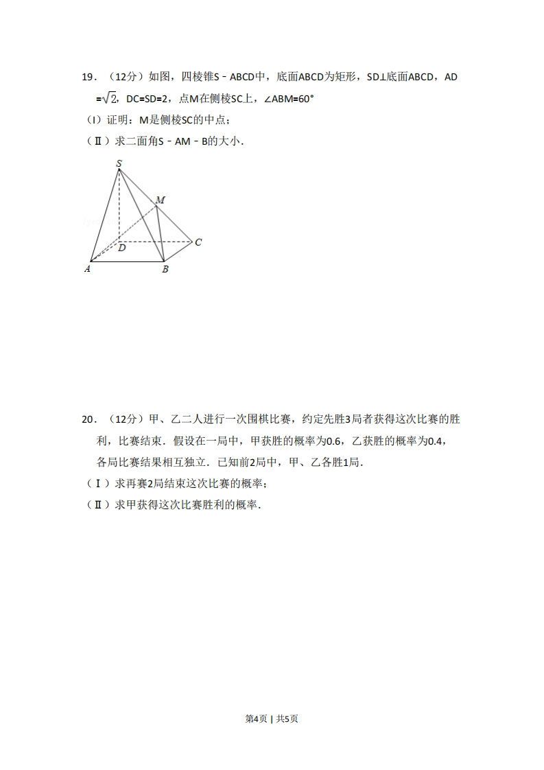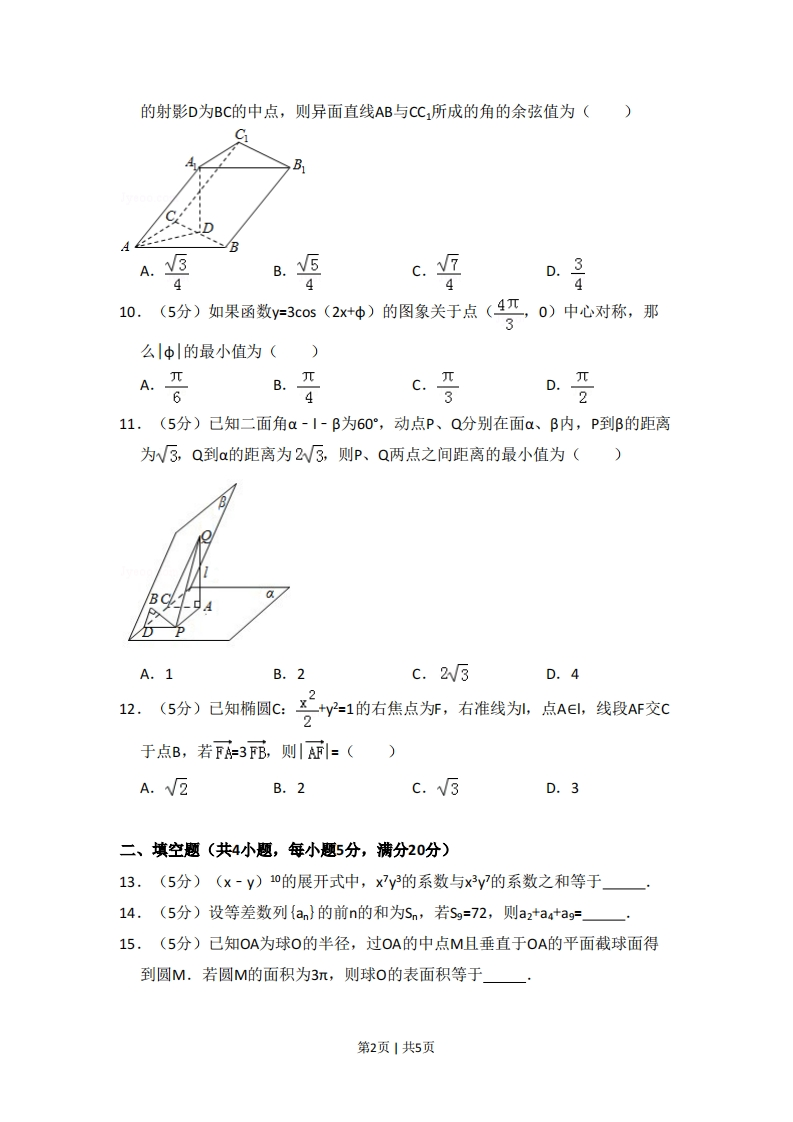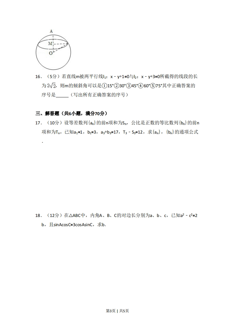 1}B.{x006>0的新我与花物间,则该双曲线的离心率为()A.3B.2c.√5D.66.(5分)已知函数f(x)的反函数为g(x)=1+2gx(x>0),则f(1)+g(1)=()A.0B.1C.2D.47.(5分)甲组有5名男同学,3名女同学:乙组有6名男同学、2名女同学.若从甲、乙两组中各选出2名同学,则选出的4人中恰有1名女同学的不同选法共有()A.150种B.180种C.300种D.345种8.(5分)设非零向量a、c满足al=6ll,a+6=c则()A.150B.120C.60°D.30°9.(5分)已知三棱柱ABC-A1B1C1的侧棱与底面边长都相等,A1在底面ABC上第1页1共5页的射影D为BC的中点,则异面直线AB与CC所成的角的余弦值为()C、DBA.V3B.c.⑦D.344410.(5分)如果函数y=3cos(2x+中)的图象关于点(4,0)中心对称,那么中的最小值为()A晋8.rc晋晋11.(5分)已知二面角a-I-B为60°,动点P、Q分别在面a、B内,P到B的距离为W3,Q到α的距离为2W3,则P、Q两点之间距离的最小值为()A.1B.2c.2W3D.422.(5分)已知椭圆C:yP=1的右焦点为F,右准线为点AE山,线段AF交C于点B,若FA3B,则川A=()A.√2B.2c.√3D.3二、填空题(共4小题,每小题5分,满分20分)13.(5分)(×-y)0的展开式中,xy的系数与xy的系数之和等于一14.(5分)设等差数列{an}的前n的和为Sn,若Sg=72,则a2ta4+ag=15.(5分)已知OA为球0的半径,过OA的中点M且垂直于OA的平面截球面得到圆M,若圆M的面积为3π,则球O的表面积等于第2页1共5页AM16.(5分)若直线m被两平行线11:×-y+1=0与2:×-y+3=0所截得的线段的长为2W2,则m的倾斜角可以是①15②30°③45④60⑤75其中正确答案的序号是(写出所有正确答案的序号)三、解答题(共6小题,满分70分)17.(10分)设等差数列{an}的前n项和为Sn,公比是正数的等比数列{bn}的前n项和为Tn,已知a1=1,b1=3,a3+b3=17,T3-S3=12,求{an},{bn}的通项公式18.(12分)在△ABC中,内角A、B、C的对边长分别为a、b、c,已知a2-c2=2b,且sinAcosC=3 cosAsinC,求b.第3页1共5页