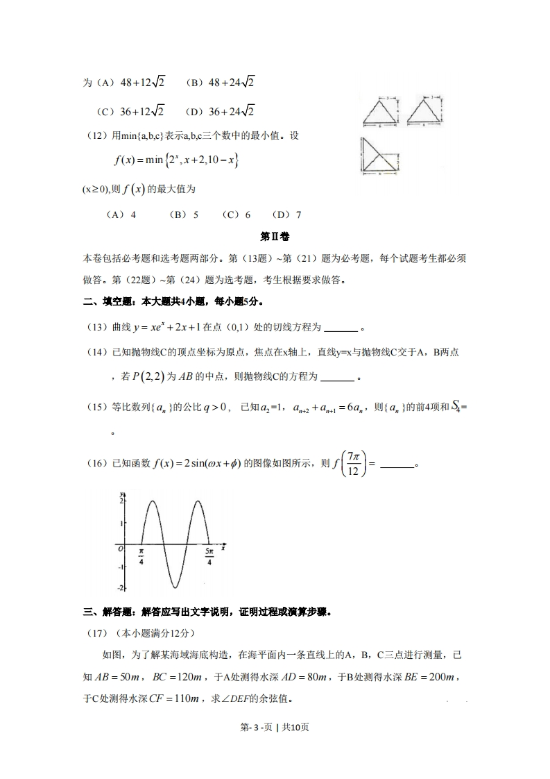 2009年普通高等学校招生全国统一考试(海南卷)数学(文史类)一、选择题:(本大题共12题,每小题5分,在每小题给出的四个选项中,中有一项是符合题目要求的。(1)已知集合A={13,5,7,9},B={0,3,6,9,12},则A∩B=(A){3,5}(B){3,6}(©{3,7}D){3,9}(2)复数3+22-3i(A)1(B)-1(C)i (D)-i(3)对变量x,y有观测数据(x,片)(i=1,2,,10),得散点图1:对变量山,v有观测数据(4,片)(=1,2,,10),得散点图2.由这两个散点图可以判断。602002013436十方方字名方古图2(A)变量x与y正相关,u与v正相关(B)变量x与y正相关,u与v负相关(C)变量x与y负相关,u与v正相关(D)变量x与y负相关,u与v负相关(4)有四个关于三角函数的命题:A:3x∈R,sin222p2:3x,yE R,sin(x-y)=sinx-siny乃:xe[0,y1-cos2x2.=sinx p sinx=cosyxy=2其中假命题的是第-1-页1共10页(A)P,P4(B)P2,P4(3)P,P3(4)P2,P3(5)己知圆C:(x+)2+(y-1)2=1,圆C2与圆C1关于直线x-y-1=0对称,则圆C2的方程为(A)(x+2)2+(y-2)2=1(B)(x-2)2+(y+2)2=1(C)(x+2)2+(y+2)2=1(D)(x-2)2+(y-2)2=1[2x+y24,(6)设x,y满足x-y≥1,则z=x+yx-2y≤2,(A)有最小值2,最大值3(B)有最小值2,无最大值(C)有最大值3,无最小值(D)既无最小值,也无最大值(7)己知a=(-3,2),b=(-1,0),向量a+b与a-2b垂直,则实数元的值为(c)-1(D)166(8)等比数列{an}的前n项和为Sn,已知am-1+am1-a=0,S2m-1=38,则m=(A)38(B)20(C)10(D)9(9)如图,正方体ABCD-AB,C,D的棱线长为1,线段1BD上有两个动点E,P,且BF=2则下列结论中错误的是(A)AC⊥BE(B)EF∥平面ABCD(C)三棱锥A-BEF的体积为定值(D)△AEF的面积与△BEF的面积相等(10)如果执行右边的程序框图,输入x=-2,h=0.5,那么输出的各个数的和等于(A)3(B)3.5(C)4(D)4.5(11)一个棱锥的三视图如图,则该棱锥的全面积(单位:c2)第-2-页1共10页为(A)48+12V2(B)48+24√2(C)36+12√5(D)36+24V2(12)用min{a,b,c}表示a,b,c三个数中的最小值。设fx)=min{2*,x+2,10-x入(x≥0),则f(x)的最大值为(A)4(B)5(C)6(D)7第Ⅱ卷本卷包括必考题和选考题两部分。第(13题)~第(21)题为必考题,每个试题考生都必须做答。第(22题)~第(24)题为选考题,考生根据要求做答。二、填空题:本大题共4小题,每小题5分。(13)曲线y=x+2x+1在点(0,1)处的切线方程为(14)己知抛物线C的顶点坐标为原点,焦点在x轴上,直线y=X与抛物线C交于A,B两点,若P(2,2)为AB的中点,则抛物线C的方程为一·(15)等比数列{an}的公比g>0,,已知a,=l,a2+a1=6an,则{an}的前4项和S=(16)已知函数f(x)=2sin(ox+)的图像如图所示,12三、解答题:解答应写出文字说明,证明过程或演算步骤。(17)(本小题满分12分)如图,为了解某海域海底构造,在海平面内一条直线上的A,B,C三点进行测量,己知AB=50m,BC=120m,于A处测得水深AD=80m,于B处测得水深BE=200m,于C处测得水深CF=110m,求∠DEF的余弦值。第-3-页1共10页