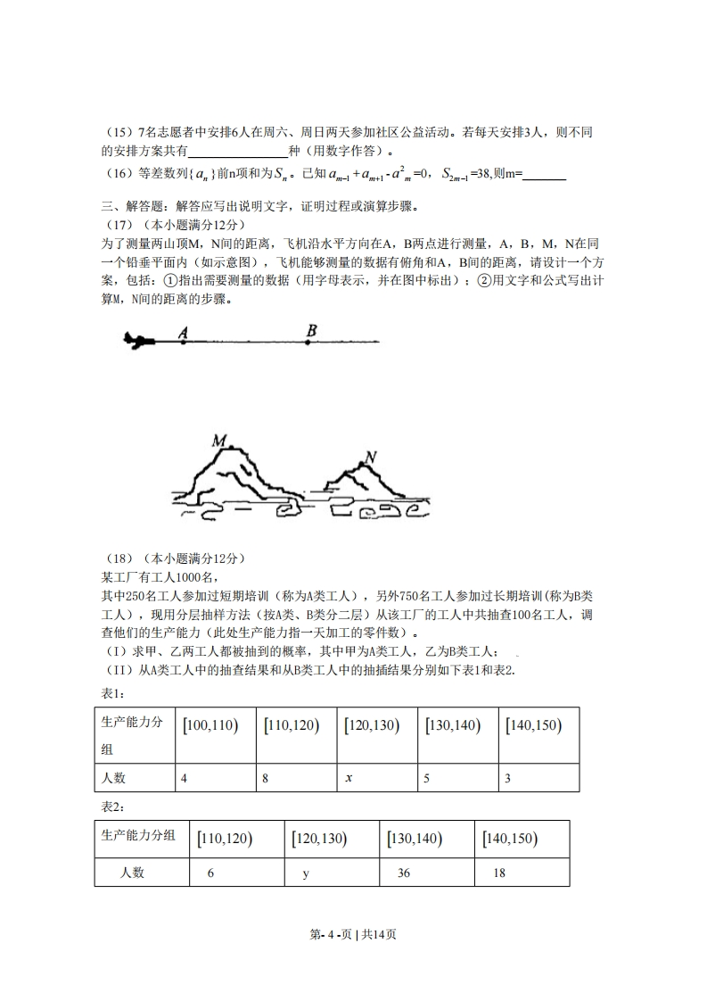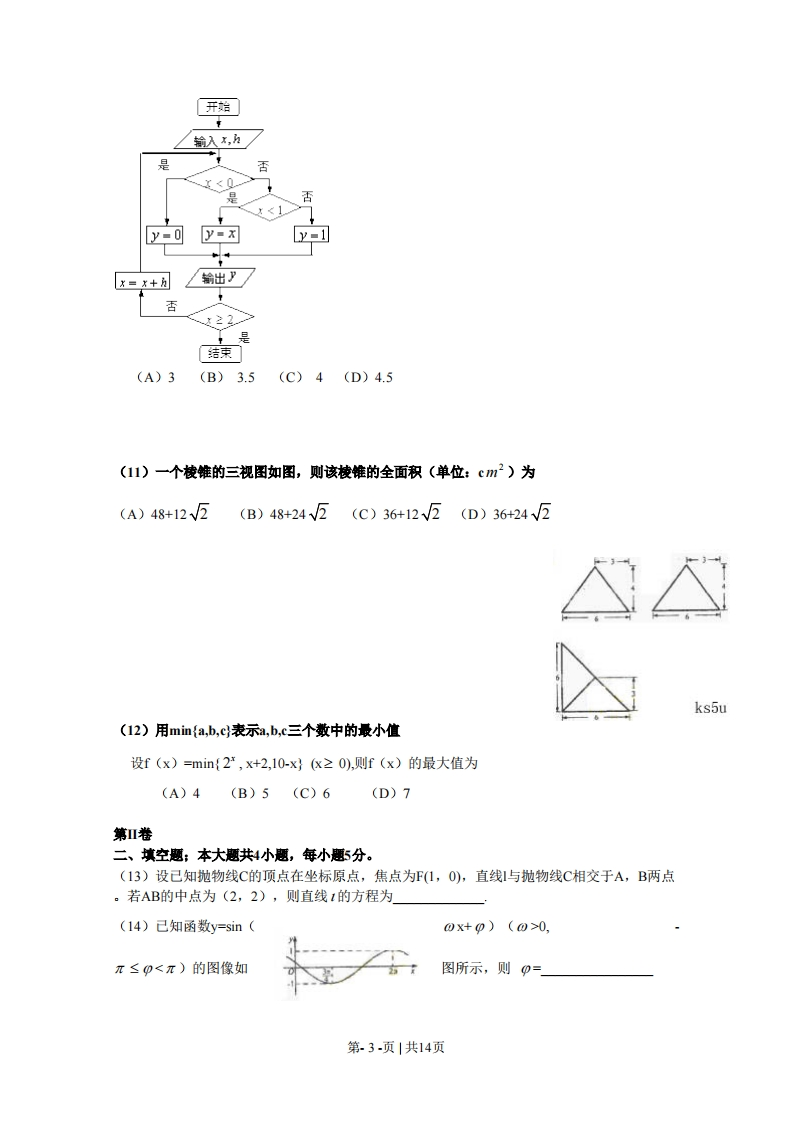 2009年普通高等学校招生全国统一考试(海南卷)数学(理工农医类)第I卷一,选择题:(本大题共12题,每小题5分,在每小题给出的四个选项中,中有一项是符合题目要求的。(1)己知集合A=1,3,5,7,9},B={0,3,6,9,12},则A∩CwB=(A){1,5,7}B){3,5,7}(©1,3,9}D){1,2,3}2)复数3+213-2i2-3i2+3i(A)0(B)2(C)-2i(D)2(3)对变量x,y有观测数据理力争(x,片)(=1,2,,10),得散点图1:对变量u,V有观测数据(4,)(=1,2,…,10),得散点图2.由这两个散点图可以判断。v2520401530104100十主34方60十之寸本古才。图2ks5u(A)变量x与y正相关,u与v正相关(B)变量x与y正相关,u与v负相关(C)变量x与y负相关,u与v正相关(D)变量x与y负相关,u与v负相关(4)双曲线42x2 y2=1的焦点到渐近线的距离为(A)2V5(B)2(c)5(D)1(5)有四个关于三角函数的命题::xER.sin+cos2p2:3x yER,sin(x-y)=sinx-siny221-cos 2xps:xe[0,]2P:sinx-cosy-→xty=72第.1-页|共14页其中假命题的是(A)P,Pa (B)P2,Pa (C)P,P3 (D)P2,Pa2x+y24(6)设xy满足x-y2-1,则z=x+yx-2y≤2(A)有最小值2,最大值3(B)有最小值2,无最大值(C)有最大值3,无最小值(D)既无最小值,也无最大值(7)等比数列{an}的前n项和为sSn,且4a,2a2,a3成等差数列。若a,=1,则s,=(A)7(B)8(C)15(D)16(8)如图,正方体ABCD-A,B,CD的棱线长为1,线段BBD上有两个动点E,F,且EF=,则下列结论中2错误的是(A)AC⊥BE(B)EFI/平面ABCD(C)三棱锥A-BEF的体积为定值(D)异面直线AE,BF所成的角为定值ks5u(9)已知O,N,P在A4BC所在平面内,且DA=OB=DC,NA+B+NC=0,且PA·PB=PB·PC=PC·PA,则点O,N,P依次是△ABC的(A)重心外心垂心(B)重心外心内心(C)外心重心垂心(D)外心重心内心(注:三角形的三条高线交于一点,此点为三角型的垂心)(10)如果执行右边的程序框图,输入x=-2,h=0.5,那么输出的各个数的合等于第.2-页|共14页开始输入x,h否←0是x<1y=可y-xy-1X=x+方输出卫☑否22是结束(A)3(B)3.5(C)4(D)4.5(11)一个棱锥的三视图如图,则该棱锥的全面积(单位:cm2)为(A)48+12V5(B)48+24V5(C)36+12V2(D)36+24V2ks5u(12)用min{a,b,c表示a,b,c三个数中的最小值设f(x)=min{2,x+2,10-x}(x≥0),则f(x)的最大值为(A)4(B)5(C)6(D)7第Ⅱ卷二、填空题;本大题共4小题,每小题5分。(13)设己知抛物线C的顶点在坐标原点,焦点为F(1,0),直线1与抛物线C相交于A,B两点。若AB的中点为(2,2),则直线1的方程为(14)己知函数y=sin(0x+p)(0>0,π≤p<π)的图像如图所示,则0=」第.3-页|共14页