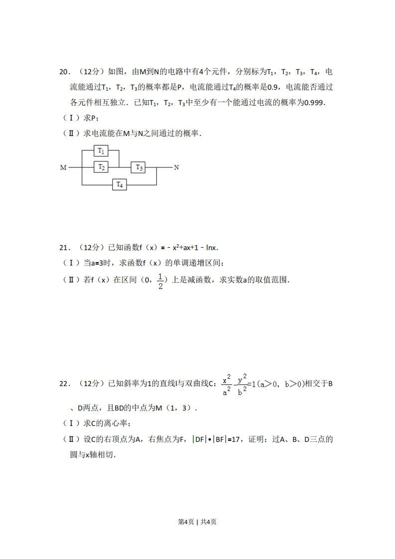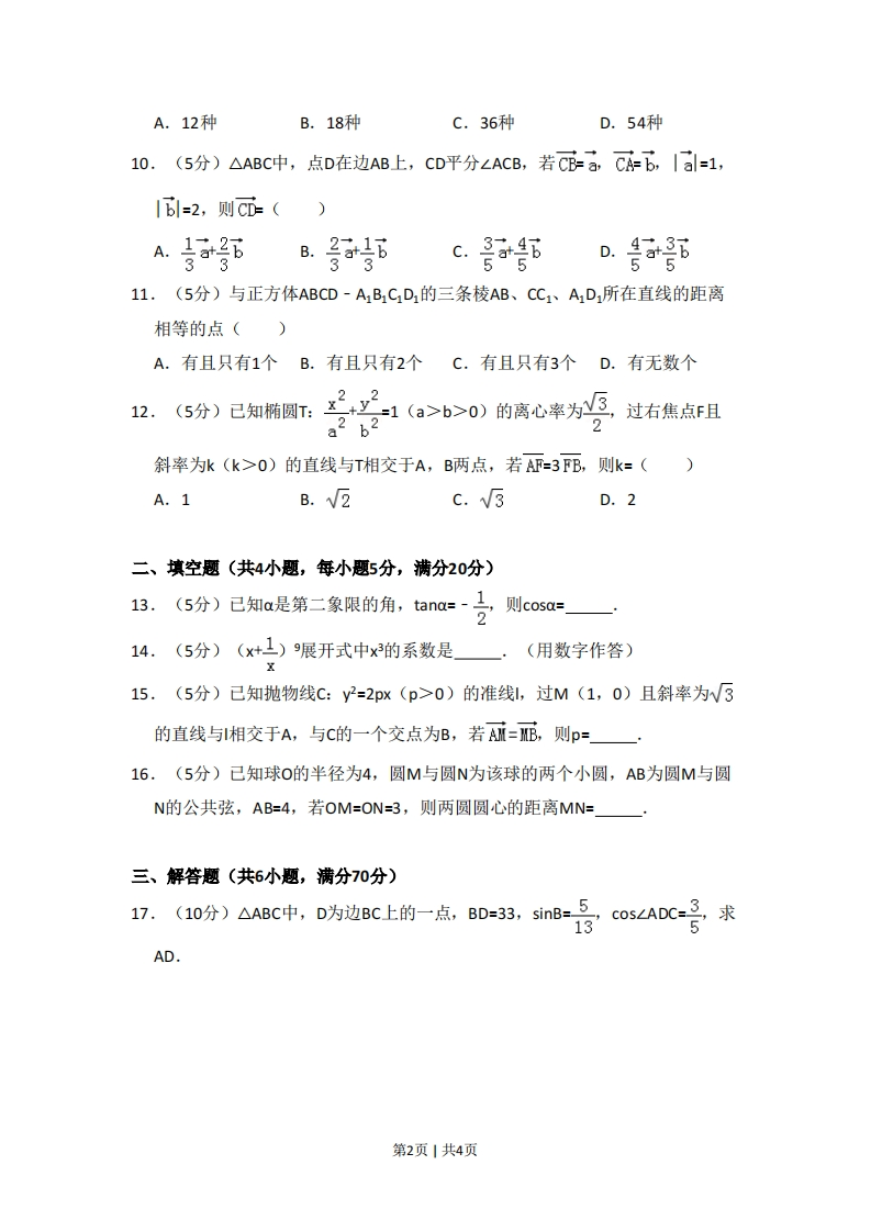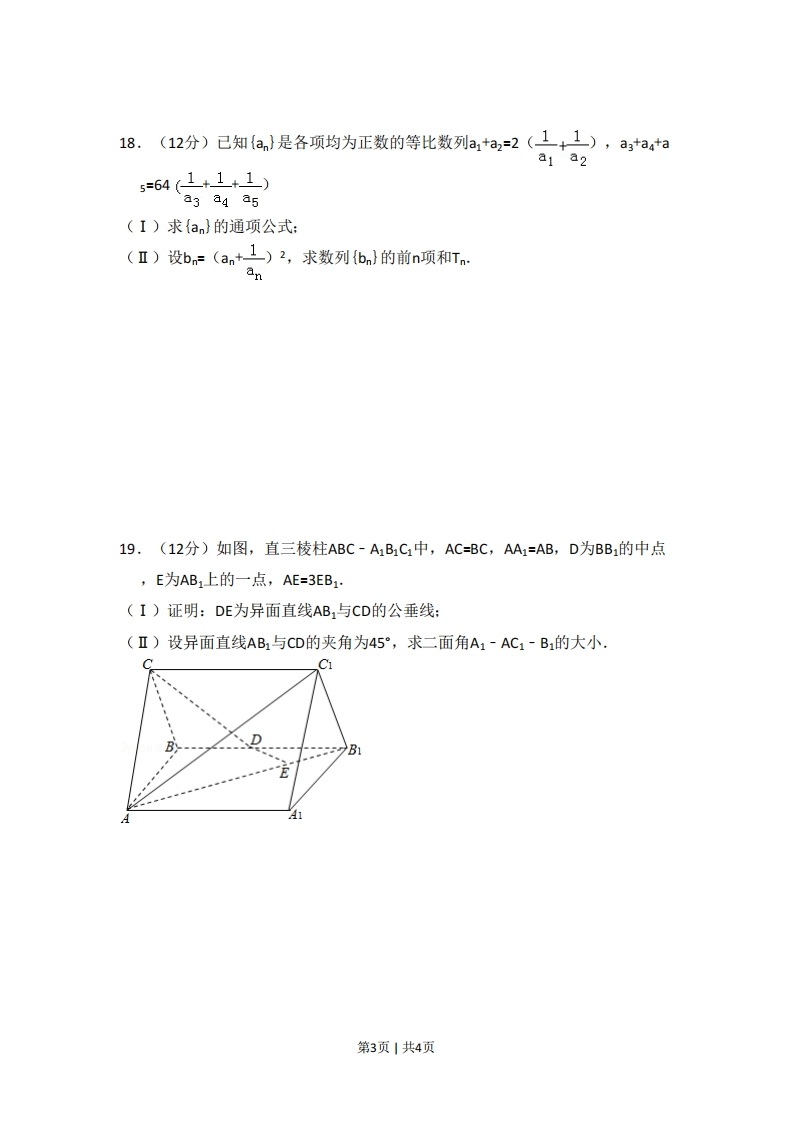 2010年全国统一高考数学试卷(文科)(大纲版Ⅱ)一、选择题(共12小题,每小题5分,满分60分)1.(5分)设全集U={xEN.x<6},集合A={1,3},B={3,5},则Cu(AUB)=()A.{1,4}B.{1,5}C.{2,4}D.{2,5}2.(5分)不等式x3<0的解集为()x+2A.{x|-23}D.{xx>3}3.(5分)已知sina=2,则cos(r-2a)=()A.-⑤B.-1c.1D.334.(5分)函数y1+1nx-1)(x>1)的反函数是(A.y=e2x-1-1(x>0)B.y=e2x-1+1(x>0)C.y=e2x-1-1(x∈R)D.y=e2x-1+1 (xER)x-15.(5分)若变量x,y满足约束条件{y>x,则z=2x+y的最大值为()3x+2y≤5A.1B.2C.3D.46.(5分)如果等差数列{an}中,a3+a+a=12,那么a1+a2++a7=()A.14B.21C.28D.357.(5分)若曲线y=x2+ax+b在点(1,b)处的切线方程是x-y+1=0,则(A.a=1,b=2B.a=-1,b=2C.a=1,b=-2D.a=-1,b=-28.(5分)已知三棱锥S-ABC中,底面ABC为边长等于2的等边三角形,SA垂直于底面ABC,SA=3,那么直线AB与平面SBC所成角的正弦值为()A.V34B.54c吗D9.(5分)将标号为1,2,3,4,5,6的6张卡片放入3个不同的信封中,若每个信封放2张,其中标号为1,2的卡片放入同一信封,则不同的方法共有(第1页1共4页A.12种B.18种C.36种D.54种10.(5分)△ABC中,点D在边AB上,CD平分LACB,若C=a,C=b,|al=1,16=2,则C⑦()A号B.2a16C.3a4bD.4a3633555511.(5分)与正方体ABCD-A1B1C1D的三条棱AB、CC1、A1D1所在直线的距离相等的点()A.有且只有1个B.有且只有2个C.有且只有3个D.有无数个12.(5分)已知椭圆T:号y1(a>b>0)的离心率为5,过右焦点F且a2 b22斜率为k(k>O)的直线与T相交于A,B两点,若AF=3FB,则k=()A.1B.√2c.3D.2二、填空题(共4小题,每小题5分,满分20分)1B。(5分)已知a是第二象限的角,ana=之则cosa=14.(5分)(x+1)9展开式中x的系数是(用数字作答)15.(5分)已知抛物线C:y2=2px(p>0)的准线l,过M(1,0)且斜率为W3的直线与引相交于A,与C的一个交点为B,若=屈,则P=16,(5分)已知球0的半径为4,圆M与圆N为该球的两个小圆,AB为圆M与圆N的公共弦,AB=4,若OM=ON=3,则两圆圆心的距离MN=,三、解答题(共6小题,满分70分)分)△ABC中,D为边BC上的一点,BD=33,sinB=,名,cos乙5AD.第2页1共4页18.(12分)已知{a,}是各项均为正数的等比数列a,+a2=2(1+1),a*n+妇a1 a25=64(1+1+1)a3 ad a5(I)求{an}的通项公式:(Ⅱ)设b(a+1)2,求数列b}的前n项和Tnan19.(12分)如图,直三棱柱ABC-A1B1C1中,AC=BC,AA1=AB,D为BB1的中点,E为AB1上的一点,AE=3EB1:(I)证明:DE为异面直线AB1与CD的公垂线:(Ⅱ)设异面直线AB1与CD的夹角为45°,求二面角A1-AC1-B1的大小.、DB-----5B1E第3页1共4页