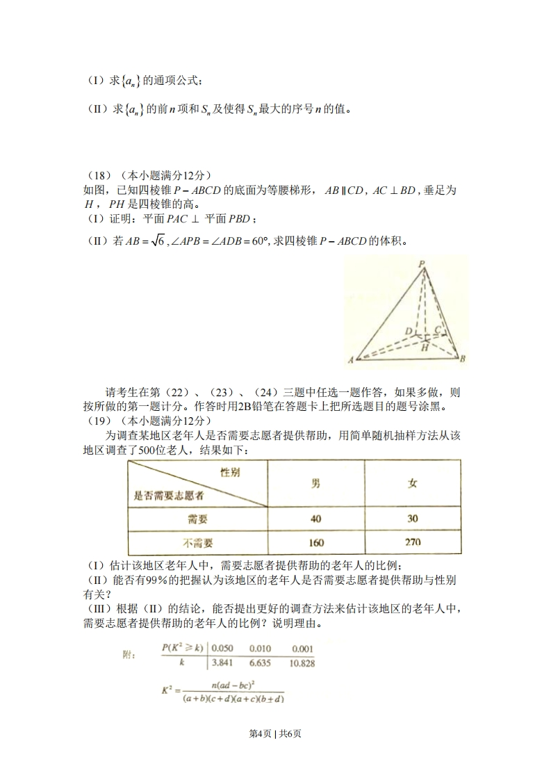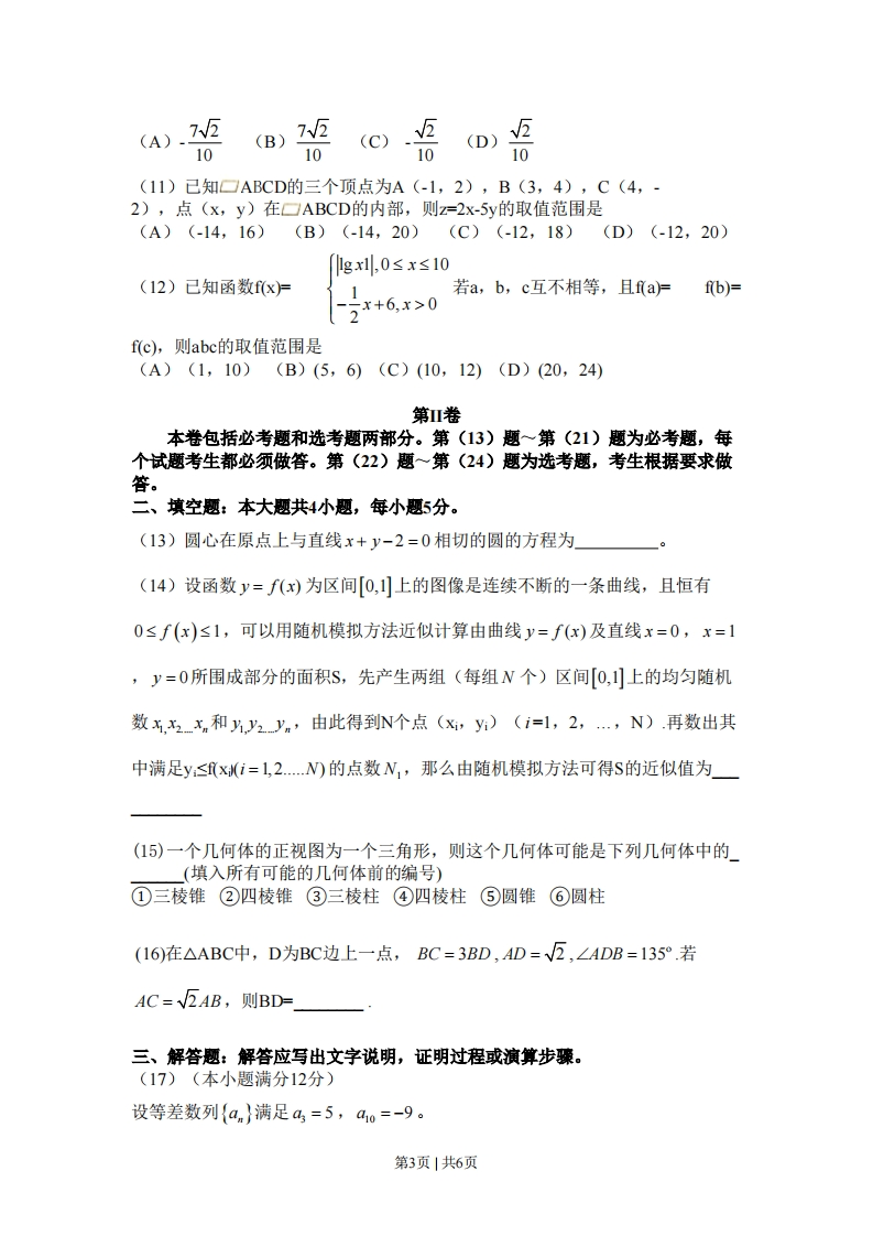 2010年普通高等学校招生全国统一考试(海南卷)文科数学参考公式:样本数据x,2…xn的标准差锥体体积公式S=月【x-+(名-2+…+(x,-x其中x为样本平均数其中S为底面面积,h为高柱体体积公式球的表面积,体积公式V=ShSP-R其中S为底面面积,h为高其中R为球的半径第I卷一、选择题:本大题共12小题,每小题5分,在每小题给出的四个选项中,只有一项是符合题目要求的。(1)已知集合A=x≤2,x∈R,B=x|V≤4,x∈ZI,则AnB=(A)(0,2)(B)[0,2](C)0,2(D)0,1,2(2)a,b为平面向量,已知a=(4,3),2a+b=(3,18),则a,b夹角的余弦值等于(A)8(B)-865(c)1665(D)-165(3)己知复数z=5+i1-5’则1z|=(B)1(C)1(D)2(4)曲线y=x2-2x+1在点(1,0)处的切线方程为(A)y=x-1(B)y=-x+1(C)y=2x-2(D)y=-2x+2(5)中心在原点,焦点在x轴上的双曲线的一条渐近线经过点(4,2),则它的离心率为(A)√6(B)√5第1页1共6页(C)6(D)522(6)如图,质点p在半径为2的圆周上逆时针运动,其初始位置为P。(√2,-√互),角速度为1,那么点p到x轴距离d关于时间t的函数图像大致为B3(D)(7)设长方体的长、宽、高分别为2a、a、a,其顶点都在一个球面上,则该球的表面积为(A)3πa2(B)6πa2(C)12πa2(D)24πa2(8)如果执行右面的框图,输入N=5,则输出的数等于开始(A)54输入N(B)5k=1,S=0(C)65SmS+(+1)k=k+1(D)5-6是k0}=输出S(A){x<-2或x>4}(B)结束{x<0减x>4}(C){xk<0减x>6}(D){xr<-2或x>2a是第一象限的角,则sina+孕=4(10)若sina=-第2页1共6页(A).72(B)7V21010(c).E(D)1010(11)已知☐ABCD的三个顶点为A(-1,2),B(3,4),C(4,-2),点(x,y)在口ABCD的内部,则z=2x-5y的取值范围是(A)(-14,16)(B)(-14,20)(C)(-12,18)(D)(-12,20)gx,0≤x≤10(12)已知函数f(x)尸1若a,b,c互不相等,且fa=fb)=x+6,x>02f(c),则abc的取值范围是(A)(1,10)(B)(5,6)(C)(10,12)(D)(20,24)第卷本卷包括必考题和选考题两部分。第(13)题~第(21)题为必考题,每个试题考生都必须做答。第(22)题~第(24)题为选考题,考生根据要求做答。二、填空题:本大题共4小题,每小题5分。(13)圆心在原点上与直线x+y-2=0相切的圆的方程为(14)设函数y=f(x)为区间[0,1上的图像是连续不断的一条曲线,且恒有0≤f(x)≤1,可以用随机模拟方法近似计算由曲线y=f(x)及直线x=0,x=1,y=0所围成部分的面积S,先产生两组(每组N个)区间[0,上的均匀随机数x,2-xn和片,y2yn,由此得到N个点(X,y)(i=1,2,,N).再数出其中满足y≤x(i=1,2N)的点数N1,那么由随机模拟方法可得S的近似值为(15)一个几何体的正视图为一个三角形,则这个几何体可能是下列几何体中的(填入所有可能的几何体前的编号)①三棱锥②四棱锥③三棱柱④四棱柱⑤圆锥⑥圆柱(16)在△ABC中,D为BC边上一点,BC=3BD,AD=√2,∠ADB=135°.若AC=N2AB,则BD=三、解答题:解答应写出文字说明,证明过程或演算步骤。(17)(本小题满分12分)设等差数列{an}满足4=5,ao=-9。第3页|共6页