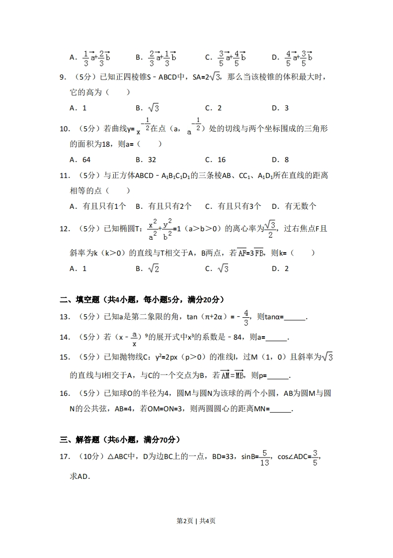 2010年全国统一高考数学试卷(理科)(大纲版Ⅱ)一、选择题(共12小题,每小题5分,满分60分)1.(5分)复数(3-主)2=()1+iA.-3-4iB.-3+41C.3-4iD.3+4i2.(5分)函数y-1+1nx-1)(x>1)的反函数是(A.y=e2x-1-1(x>0)B.y=e2x-1+1(x>0)C.y=e2x-1-1 (xER)D.y=e2x-1+1 (xER)x-13.(5分)若变量x,y满足约束条件{yx,则z=2xy的最大值为(3x+2y5)A.1B.2C.3D.44.(5分)如果等差数列{an}中,a3+a4+as=12,那么a1+a2t+a7=()A.14B.21C.28D.355.(5分)不等式x-x-6>0的解集为()x-1A.{xx<-2,或x>3}B.{xx<-2,或13}D.{x-2b>0)的离心率为点,过右焦点且a2 b22斜率为k(k>0)的直线与T相交于A,B两点,若AF=3FB,则k=()A.1B.V2c.√3D.2二、填空题(共4小题,每小题5分,满分20分)13.(5分)已知a是第二象限的角,tan(r+2a)-号则tana=一314.(5分)若(×-三)9的展开式中x3的系数是-84,则a=·15.(5分)已知抛物线C:y2=2px(p>0)的准线,过M(1,0)且斜率为W3的直线与相交于A,与C的一个交点为B,若A=B,则p=一16.(5分)已知球0的半径为4,圆M与圆N为该球的两个小圆,AB为圆M与圆N的公共弦,AB=4,若OM=ON=3,则两圆圆心的距离MN=一三、解答题(共6小题,满分70分)7、(10分)△ABC中,D为边BC上的一点,BD=33,s$nB=3,cos∠A0C:5求AD.第2页1共4页18.(12分)已知数列{an}的前n项和Sn=(n2+n)3n.「I)求1Snn;(1)证明:ata2t+a>3n1222n219.(12分)如图,直三棱柱ABC-A1B1C1中,AC=BC,AA1=AB,D为BB1的中点,E为AB1上的一点,AE=3EB1.(I)证明:DE为异面直线AB1与CD的公垂线:(Ⅱ)设异面直线AB1与CD的夹角为45°,求二面角A1-AC1-B:的大小.DBB1A120.(12分)如图,由M到N的电路中有4个元件,分别标为T1,T2,T3,T4,电流能通过T1,T2,T3的概率都是P,电流能通过T,的概率是0.9,电流能否通过各元件相互独立.已知T1,T2,T3中至少有一个能通过电流的概率为0.999(I)求P:(Ⅱ)求电流能在M与N之间通过的概率.第3页1共4页