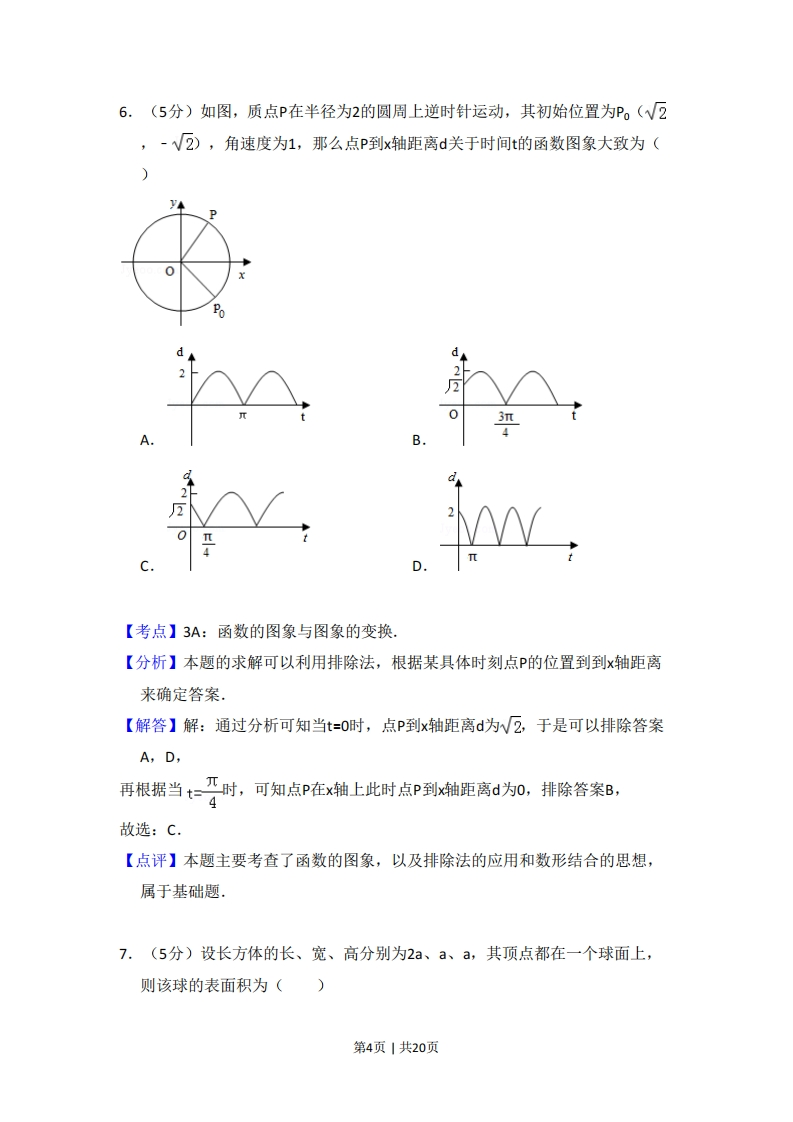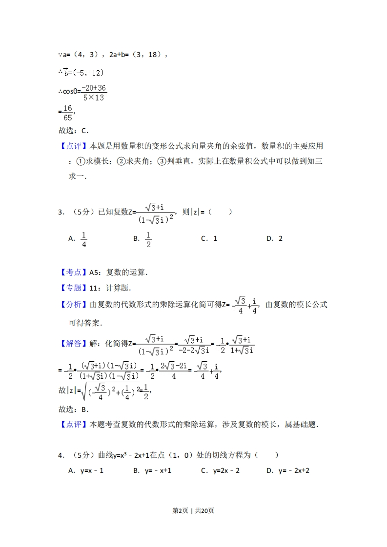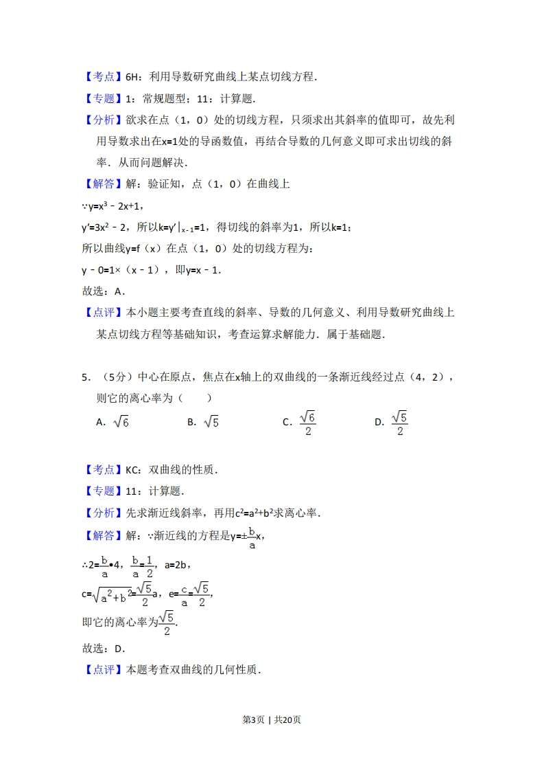 2010年全国统一高考数学试卷(文科)(新课标)事考答案与试题佩折一、选择题:本大题共12小题,每小题5分,在每小题给出的四个选项中,只有一项是符合题目要求的.1.(5分)已知集合A={xlxs2,xER},B={x√≤4,xeZ},则AnB=(A.(0,2)B.[0,2]C.{0,2}D.{0,1,2【考点】1E:交集及其运算,【专题】11:计算题【分析】由题意可得A={x-2≤≤2},B={0,1,2,3,4,5,6,7,8,9,10,11,12,13,14,15,16},从而可求【解答】解:A={xx≤2}={x-2≤x≤2B={x≤4,xeZ}={0,1,2,3,4,5,6,7,8,9,10,11,12,13,14,15,16则A∩B={0,1,2}故选:D.【点评】本题主要考查了集合的交集的求解,解题的关键是准确求解A,B,属于基础试题2.(5分)平面向量a,6已知示(4,3),2a+=(3,18),则a,夹角的余弦值等于()A需B.865c号D.1665【考点】9S:数量积表示两个向量的夹角.【分析】先设出b的坐标,根据a=(4,3),2a+b=(3,18),求出坐标,根据数量积的坐标公式的变形公式,求出两个向量的夹角的余弦【解答】解:设b=(x,y),第1页1共20页a=(4,3),2a+b=(3,18),6=(-5,12)∴c0s6=-20+365×13-16651故选:C【点评】本题是用数量积的变形公式求向量夹角的余弦值,数量积的主要应用:①求模长:②求夹角:③判垂直,实际上在数量积公式中可以做到知三求一,3.(5分)已知复数2:3+i(1V5i)2则川z=()A.1C.1D.2【考点】A5:复数的运算.【专题】11:计算题,【分析】由复数的代数形式的乘除运算化简可得Z:5,一,由复数的模长公式44可得答案,【解答】解:化简得z:,⑤+柱。:√3+i上.3+i(1-√3i)2-2-2√3i21+W3i=1.Wt)1-5).1.23-215L2(1+W3i)1-3i)244+4故1√)2+)22故选:B.【点评】本题考查复数的代数形式的乘除运算,涉及复数的模长,属基础题.4.(5分)曲线y=x3-2x+1在点(1,0)处的切线方程为()A.y=x-1B.y=-x+1C.y=2x-2D.y=-2x+2第2页|共20页【考点】6H:利用导数研究曲线上某点切线方程.【专题】1:常规题型:11:计算题,【分析】欲求在点(1,0)处的切线方程,只须求出其斜率的值即可,故先利用导数求出在x=1处的导函数值,再结合导数的几何意义即可求出切线的斜率.从而问题解决【解答】解:验证知,点(1,0)在曲线上y=x3-2x+1,y=3x2-2,所以k=yx-1=1,得切线的斜率为1,所以k=1:所以曲线y=f(x)在点(1,0)处的切线方程为:y-0=1×(x-1),即y=x-1.故选:A.【点评】本小题主要考查直线的斜率、导数的几何意义、利用导数研究曲线上某点切线方程等基础知识,考查运算求解能力,属于基础题.5.(5分)中心在原点,焦点在x轴上的双曲线的一条渐近线经过点(4,2),则它的离心率为()A.√6B.√5c.6D.⑤22【考点】KC:双曲线的性质.【专题】11:计算题.【分析】先求渐近线斜率,再用c2=a2+b2求离心率.【解答】解:渐近线的方程是y=吐bx,a2=b.4,b=1,a=2b,aa 2c-Va2+biV5a.e-c_V5a 2即它的离心率为⑤故选:D.【点评】本题考查双曲线的几何性质.第3页|共20页