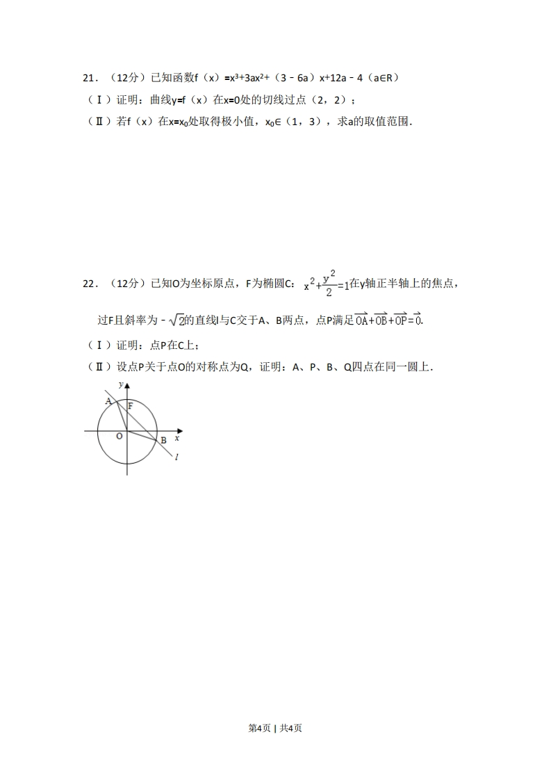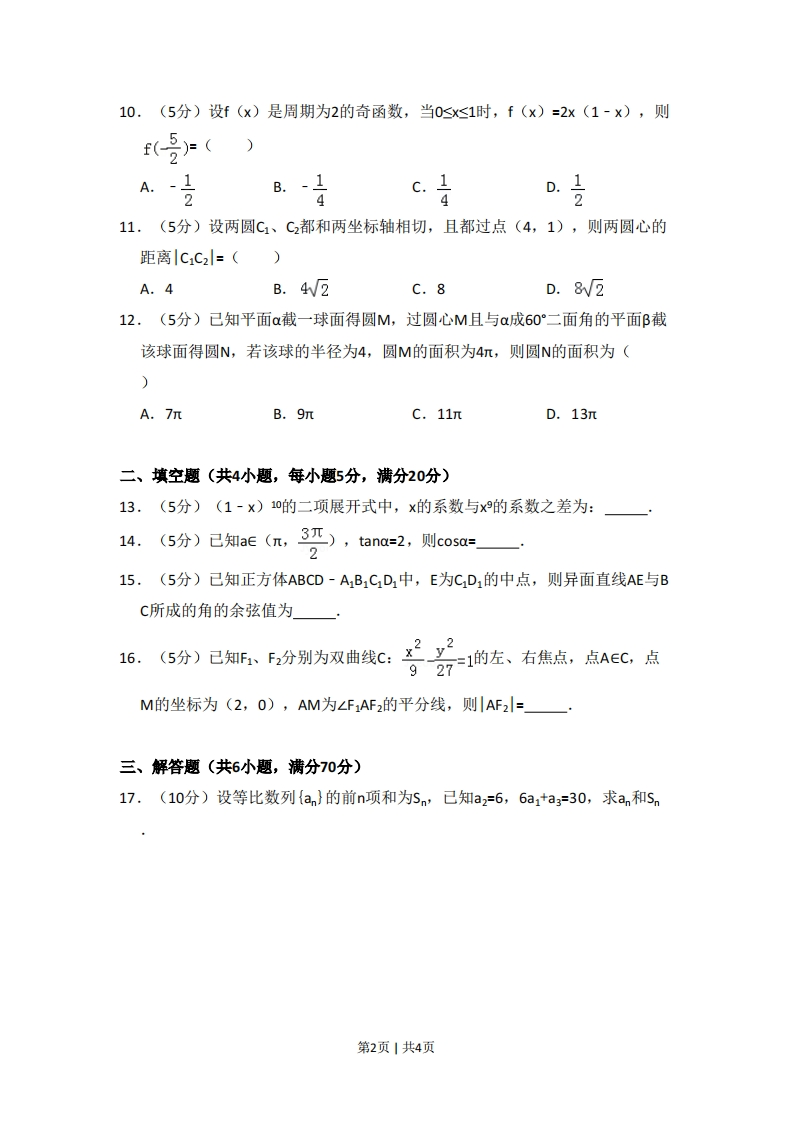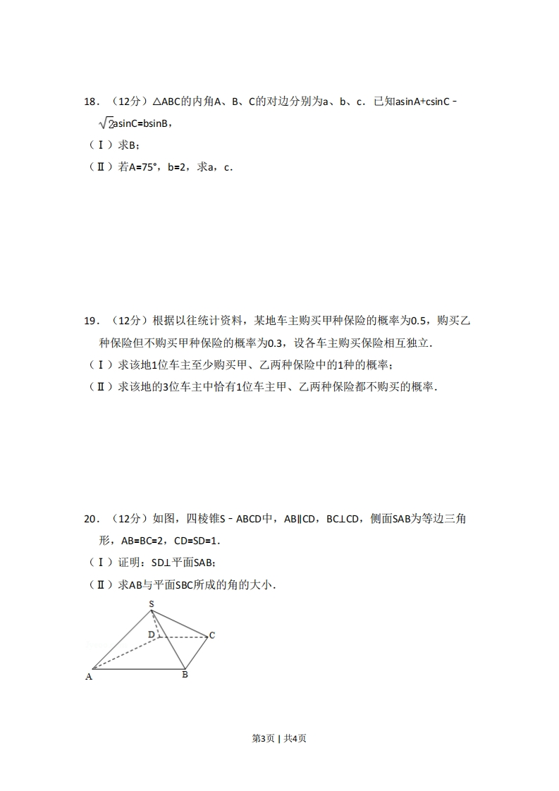 2011年全国统一高考数学试卷(文科)(大纲版)一、选择题(共12小题,每小题5分,满分60分)1.(5分)设集合U={1,2,3,4},M={1,2,3},N={2,3,4},则Cu(MnN)=()A.{1,2}B.{2,3}C.{2,4}D.{1,4}2.(5分)函数y=2Wx(x20)的反函数为()A.y=2(XeR)B.y-(eo)C.y=4x2(x∈R)D.y=4x2(x20)43.(5分)设向量a、b满足1a=bl=1,a=-1,2=()A.√2B.√3c.、5D.√7xty<64.(5分)若变量x、y满足约束条件x-3y<-2,则z=2x+3y的最小值为(x>1)A.17B.14c.5D.35.(5分)下面四个条件中,使a>b成立的充分而不必要的条件是()A.a>b+1B.a>b-1C.a2>b2D.a3>b36.(5分)设Sn为等差数列{an}的前n项和,若a1=1,公差d=2,Sk2-S=24,则k=()A.8B.7C.6D.57.(5分)设函数f(x)=cOSwX(ω>0),将y=f(x)的图象向右平移工个单位长度后,所得的图象与原图象重合,则ω的最小值等于()A号B.3C.6D.98.(5分)已知直二面角a-I-B,点Aa,AC⊥I,C为垂足,点B∈B,BD⊥I,D为垂足,若AB=2,AC=BD=1,则CD=()A.2B.√3c.√2D.19.(5分)4位同学每人从甲、乙、丙3门课程中选修1门,则恰有2人选修课程甲的不同选法共有()A.12种B.24种C.30种D.36种第1页1共4页10.(5分)设f(x)是周期为2的奇函数,当0sx≤1时,f(x)=2x(1-x),则(2)=()A.-1B.-12C.D.44211.(5分)设两圆C1、C2都和两坐标轴相切,且都过点(4,1),则两圆心的距离C1C2=()A.4B.42C.8D.8√212.(5分)已知平面a截一球面得圆M,过圆心M且与a成60°二面角的平面B截该球面得圆N,若该球的半径为4,圆M的面积为4r,则圆N的面积为()A.7πB.9ntC.11πD.13元二、填空题(共4小题,每小题5分,满分20分)13.(5分)(1-x)10的二项展开式中,x的系数与x的系数之差为:14.(5分)已知ae(m,3T),ana=2,则cosa=一15.(5分)已知正方体ABCD-AB1C1D1中,E为CD:的中点,则异面直线AE与BC所成的角的余弦值为一·6《S分)尼知分别为双曲线C:号的左、右焦点,点AEC,点M的坐标为(2,O),AM为LFAF2的平分线,则|AF2=一·三、解答题(共6小题,满分70分)17.(10分)设等比数列{an}的前n项和为Sn,已知a=6,6a1+a=30,求an和Sn第2页1共4页18,(12分)△ABC的内角A、B、C的对边分别为a、b、c.已知asinA+csinC-√2 asinC=bsinB,(I)求B:(Ⅱ)若A=75°,b=2,求a,c.19.(12分)根据以往统计资料,某地车主购买甲种保险的概率为0.5,购买乙种保险但不购买甲种保险的概率为0.3,设各车主购买保险相互独立.(I)求该地1位车主至少购买甲、乙两种保险中的1种的概率:(Ⅱ)求该地的3位车主中恰有1位车主甲、乙两种保险都不购买的概率.20.(12分)如图,四棱锥S-ABCD中,ABIICD,BC⊥CD,侧面SAB为等边三角形,AB=BC=2,CD=SD=1.(I)证明:SDL平面SAB:(Ⅱ)求AB与平面SBC所成的角的大小,D第3页1共4页