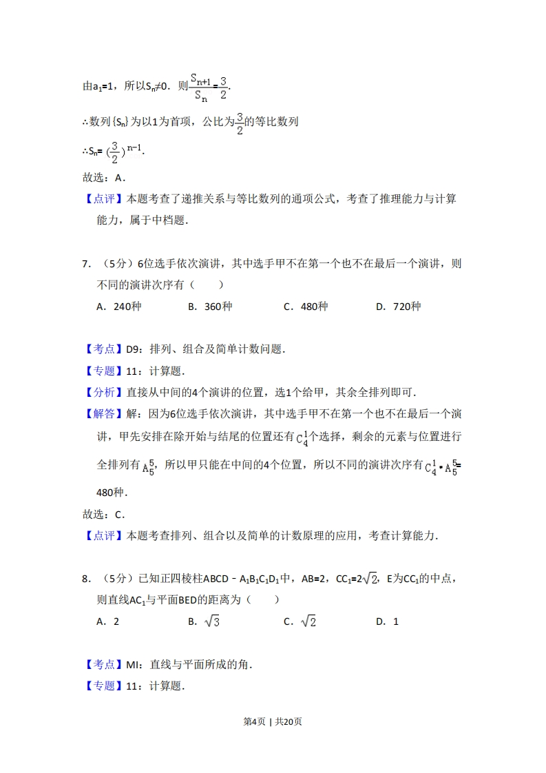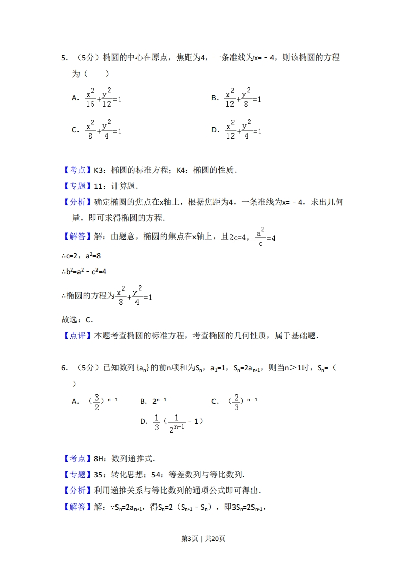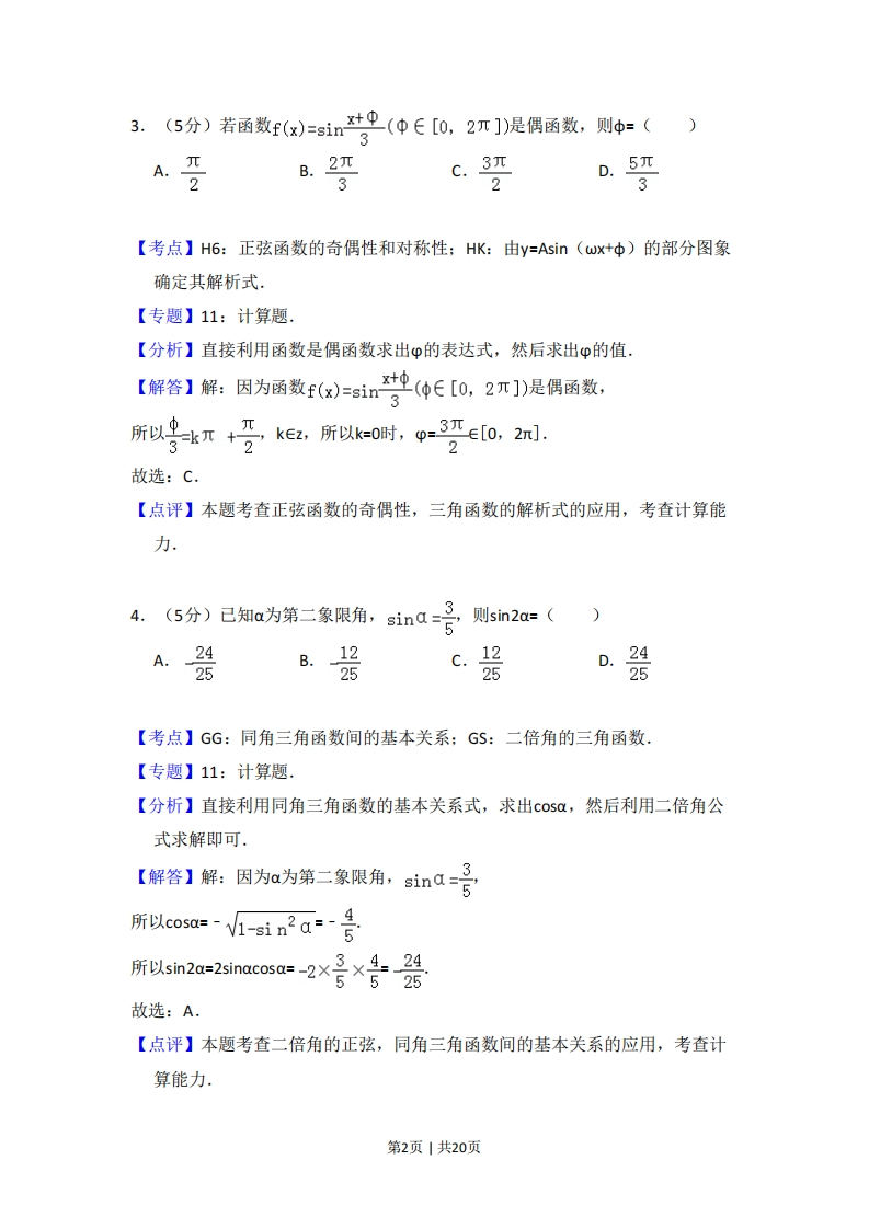 2012年全国统一高考数学试卷(文科)(大纲版)事考答案与试题佩析一,选择题1.(5分)已知集合A={xx是平行四边形},B={xx是矩形},C={xx是正方形},D={xx是菱形},则()A.ACBB.CCBC.DECD.ACD【考点】1E:交集及其运算,【专题】11:计算题,【分析】直接利用四边形的关系,判断选项即可.【解答】解:因为菱形是平行四边形的特殊情形,所以DCA,矩形与正方形是平行四边形的特殊情形,所以BCA,CCA,正方形是矩形,所以C二B.故选:B.【点评】本题考查集合的基本运算,几何图形之间的关系,基础题.2.(5分)函数yVx+1(x-1)的反函数是()A.y=x2-1(x20)B.y=x2-1(X21)C.y=x2+1(X20)D.y=x2+1(X21)【考点】4R:反函数.【专题】11:计算题.【分析】直接利用反函数的求法求解即可·【解答】解:因为函数y√x+1(x-1),解得x=y2-1,所以函数y√x+1(x-1)的反函数是y=x2-1(x心0).故选:A.【点评】本题考查函数的反函数的求法,考查计算能力第1页1共20页3.(5分)若函数f(x)=sin3(中∈0,2π])是偶函数,则中=()A号B.2πc.3πD.5π323【考点】H6:正弦函数的奇偶性和对称性:HK:由y=Asin(wx+中)的部分图象确定其解析式.【专题】11:计算题.【分析】直接利用函数是偶函数求出φ的表达式,然后求出φ的值.【解答】解:因为函数()=6i(φ∈【0,2元])是偶函数,所以号kT+受ke2,所以k-o时,9=3Teo,2m.2故选:C.【点评】本题考查正弦函数的奇偶性,三角函数的解析式的应用,考查计算能力34.(5分)已知a为第二象限角,sina=合,则sin2a=()5A.2425B.12c.12D.24252525【考点】GG:同角三角函数间的基本关系:GS:二倍角的三角函数.【专题】11:计算题,【分析】直接利用同角三角函数的基本关系式,求出cosa,然后利用二倍角公式求解即可【解答】解:因为a为第二象限角,sina=亏所以cosa=-V1-si n2a=-4.5所以sin2a=2 2sinacosa=--2×2×4245525故选:A.【点评】本题考查二倍角的正弦,同角三角函数间的基本关系的应用,考查计算能力.第2页|共20页5.(5分)椭圆的中心在原点,焦距为4,一条准线为x=-4,则该椭圆的方程为()A.32y216121B..y12+81.y2.1【考点】K3:椭圆的标准方程;K4:椭圆的性质.【专题】11:计算题.【分析】确定椭圆的焦点在x轴上,根据焦距为4,一条准线为x=-4,求出几何量,即可求得椭圆的方程【解答】解:由题意,椭圆的焦点在x轴上,且2c=4,a=4cc=2,a2=8b2=a2-c2=4八陌圆的方程为名+,故选:C.【点评】本题考查椭圆的标准方程,考查椭圆的几何性质,属于基础题.6.(5分)已知数列{an}的前n项和为Sn,a1=1,Sn=2an1,则当n>1时,n=()A.(3)n-1B.2n-1C.(2)n-13D.1(1一-1)32r1【考点】8H:数列递推式.【专题】35:转化思想:54:等差数列与等比数列.【分析】利用递推关系与等比数列的通项公式即可得出,【解答】解:Sn=2an1,得Sn=2(Sn1-Sn),即3Sn=2Sn1,第3页|共20页