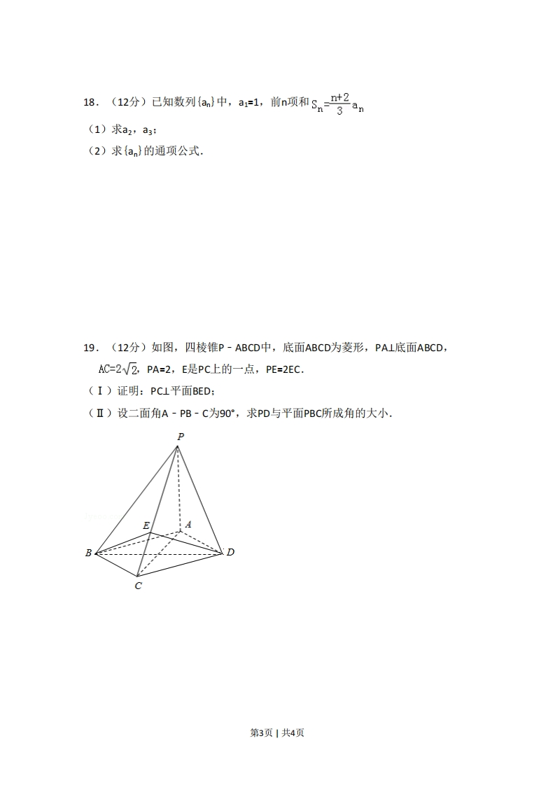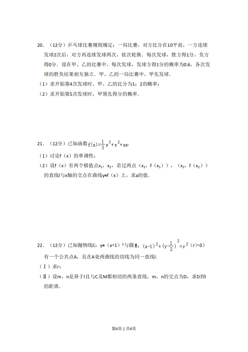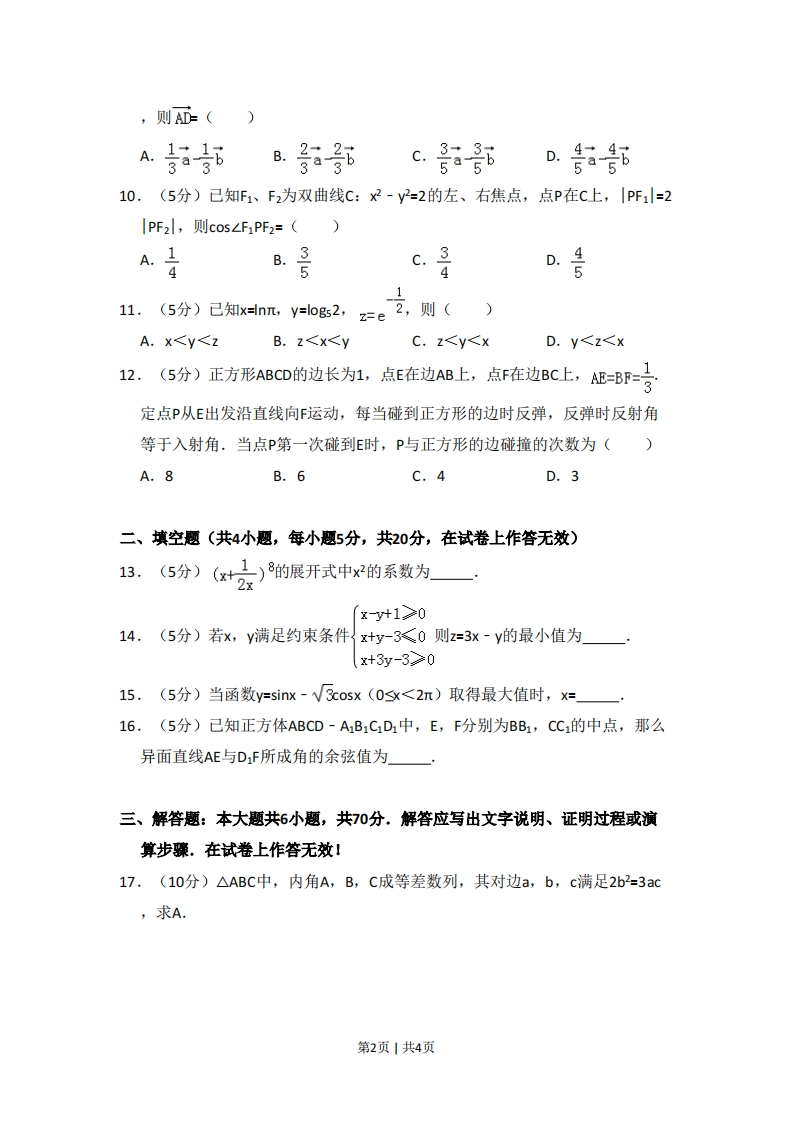 2012年全国统一高考数学试卷(文科)(大纲版)一。选择题1.(5分)已知集合A={xx是平行四边形},B={xx是矩形),C={xx是正方形},D={xx是菱形},则()A.ACBB.CCBC.DECD.ACD2.(5分)函数y√x+1(x-1)的反函数是()A.y=x2-1(X20)B.y=x2-1(X21)C.y=x2+1(x②0)D.y=x2+1(X21)3.(5分)若函数E(x)=in+”(中E[0,2π]是偶函数,则中=()A号B.2πc.3πD.53234.(5分)已知a为第二象限角,sina=名,则sin2a=()5A.24B.12D.242525c.125255.(5分)椭圆的中心在原点,焦距为4,一条准线为x=-4,则该椭圆的方程为()”6218.x22A.x2212+81C+y,=1D.<12+416.(5分)已知数列{an}的前n项和为Sn,a1=1,Sn=2an1,则当n>1时,S=()A.(3)n-1B.2n-1C.(2)n-12D.1(1-1)32-17.(5分)6位选手依次演讲,其中选手甲不在第一个也不在最后一个演讲,则不同的演讲次序有()A.240种B.360种C.480种D.720种8.(5分)已知正四棱柱ABCD-ABC1D1中,AB=2,CC1=2N2,E为CC1的中点,则直线AC1与平面BED的距离为()A.2B.√3c.√2D.19.(5分)△ABC中,AB边的高为CD,若C=a,CA=b,=0,|a=1,|bl=2第1页1共4页,则D()A.aB.玉c.30.号a10.(5分)已知F1、F2为双曲线C:x2-y2=2的左、右焦点,点P在C上,|PF1=2|PF2,则cos∠F1PF2=()A是B.3C.34111.(5分)已知x=nm,y=logs2,z=e,则()A.x