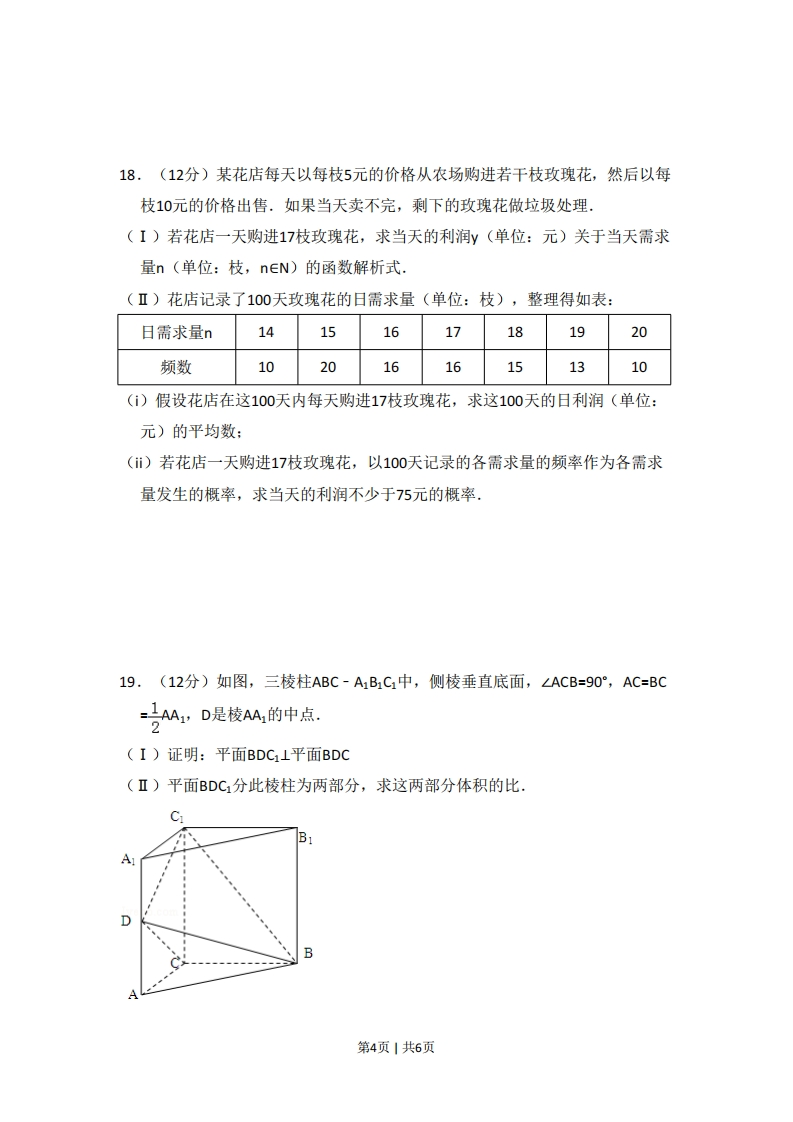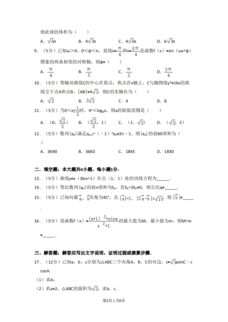 b>0)的左、右焦点,P为直线x:a2 b23a上一点,△F2PF1是底角为30的等腰三角形,则E的离心率为()A司®号c.34号5.(5分)已知正三角形ABC的顶点A(1,1),B(1,3),顶点C在第一象限,若点(x,y)在△ABC内部,则z=-x+y的取值范围是()A.(1-√3,2)B.(0,2)C.(3-1,2)D.(0,1+√3)6.(5分)如果执行下边的程序框图,输入正整数N(N22)和实数a1,a2,,an,输出A,B,则()第1页1共6页开始输入Na1,aaek=1A=a,B=ax=atk=k+1是X>A?A=X是x0,0<中<,直线x=工和x=5兀是函数f(x)=sin(wx+中)4图象的两条相邻的对称轴,则中=()A西8号c晋D.3π410.(5分)等轴双曲线C的中心在原点,焦点在x轴上,C与抛物线y2=16x的准线交于点A和点B,|AB=4W3,则C的实轴长为()A.√2B.2W2C.4D.811.(5分)当0