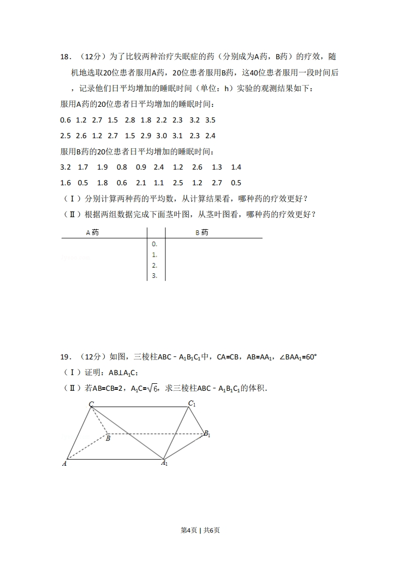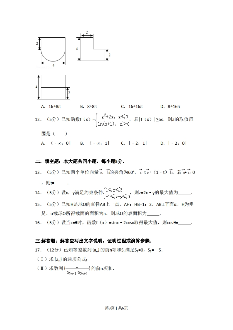 2013年全国统一高考数学试卷(文科)(新课标I)一、选择题共12小题.每小题5分,共60分.在每个小题给出的四个选项中,只有一项是符合题目要求的一项.1.(5分)已知集合A={1,2,3,4},B={xx=n2,n∈A},则AnB=()A.{1,4}B.{2,3}C.{9,16}D.{1,2}-)2()2.(5分)1+2iA-1-B.-1+当2c.1号0.1-岂3.(5分)从1,2,3,4中任取2个不同的数,则取出的2个数之差的绝对值为2的概率是()A司B.1c.145分)已知双自线c:号1白>0,b>0)前高心率2,则c的渐近线方程为()Ay=士好xB.y=±C,y=士X0y=±号x5.(5分)已知命题p:XER,2<3;命题q:3xER,x2=1-x2,则下列命题中为真命题的是()A.pAqB.pAqC.pAqD.TpAq6.(5分)设首项为1,公比为2的等比数列{an}的前n项和为Sn,则()A.Sp=2an-1 B.Sp=3an-2C.Sp=4-3anD.Sn=3-2an7.(5分)执行程序框图,如果输入的t∈[-1,3],则输出的s属于()第1页1共6页开始输入t是11否5=3t5=42输出s结束A.[-3,4]B.[-5,2]C.[-4,3]D.[-2,5]8.(5分)O为坐标原点,F为抛物线C:y2=4√2x的焦点,P为C上一点,若|PF|=4W2,则△P0F的面积为()A.2B.22c.23D.49.(5分)函数f(x)=(1-cosx)six在[-π,π]的图象大致为()BXdD10.(5分)已知锐角△ABC的内角A,B,C的对边分别为a,b,c,23cos2A+cos2A=0,a=7,c=6,则b=()A.10B.9C.8D.511.(5分)某几何体的三视图如图所示,则该几何体的体积为()第2页1共6页A.16+8πB.8+8πC.16+16πD.8+16m12.(5分)已知函数f(x)=-x242x,x<0,若1f(x)2ax,则a的取值范1n(x+1),x>0围是()A.(-0,0]B.(-0,1]C.[-2,1]D.[-2,0]二.填空题:本大题共四小题,每小题5分13.(5分)已知两个单位向量ab的夹角为60°,C=t(1-t).若C=0,则te14.(5分)设×,y满足约束条件)1≤x3-1≤xy≤0则z=2x-y的最大值为一15,(5分)已知H是球O的直径AB上一点,AH:HB=1:2,AB⊥平面a,H为垂足,α截球0所得截面的面积为π,则球0的表面积为16.(5分)设当x=0时,函数f(x)=six-2cosx取得最大值,则cos0=三解答题:解答应写出文字说明,证明过程或演算步骤.17.(12分)已知等差数列{an}的前n项和S.满足S3=0,S5=-5.(I)求{an}的通项公式:(Ⅱ)求数列{1一}的前n项和.a2r-1a2n+1第3页1共6页