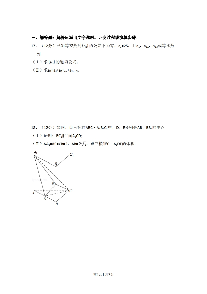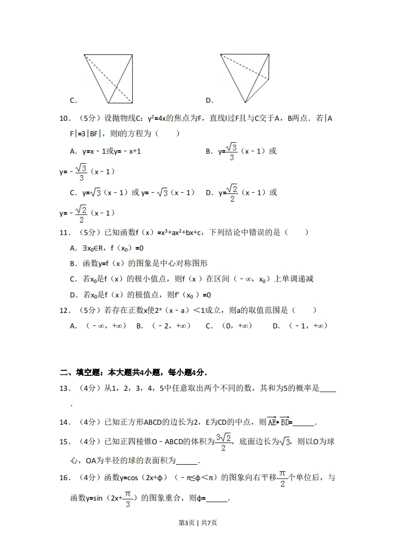 b>0)的左、右他点分别为新:P限c上的点PF2⊥FF2,∠PF1F2=30°,则C的离心率为()A.6c方D.V36.(5分)已知sin2a=2,则cos2(a+T)=()34A吉C.0号7.(5分)执行如图的程序框图,如果输入的N=4,那么输出的S=()第1页1共7页开始输入Nk=1S=0,T=1S=S+Tk=k+1N否是输出S结末A.1+1+1+1234B.1+1+1+123×24×3×2c.1+1+1+1+12345D.1+1+1+1+123×24×3×25X4×3×28.(5分)设a=log32,b=l0g52,c=log23,则()A.a>c>bB.b>c>aC.c>a>bD.c>b>a9.(5分)一个四面体的顶点在空间直角坐标系0-xyz中的坐标分别是(1,0,1),(1,1,0),(0,1,1),(0,0,0),画该四面体三视图中的正视图时,以zOx平面为投影面,则得到正视图可以为()A.B.第2页1共7页D10.(5分)设抛物线C:y2=4x的焦点为F,直线过F且与C交于A,B两点.若|AF=3BF,则的方程为()A.y=x-1或y=-x+1B.y5(x-1)或3y=-E(x-1)3c.y=5x-1)或y=-5(x-1)D.y2(x-1)或2y=-2(x-1)211.(5分)已知函数f(x)=x3+ax2+bx+c,下列结论中错误的是()A.3Xo∈R,f(Xo)=0B.函数y=f(x)的图象是中心对称图形C.若x是f(x)的极小值点,则f(x)在区间(-o,x)上单调递减D.若xo是f(x)的极值点,则F(x)=012.(5分)若存在正数x使2×(x-a)<1成立,则a的取值范围是()A.(-00,+0)B.(-2,+0)C.(0,+0)D.(-1,+0)二、填空题:本大题共4小题,年小题4分.13.(4分)从1,2,3,4,5中任意取出两个不同的数,其和为5的概率是14.(4分)已知正方形ABCD的边长为2,E为CD的中点,则ABD15.(4分)已知正四棱锥0-ABCD的体积为3三,底面边长为√5,则以0为球2心,OA为半径的球的表面积为·16.(4分)函数y=cos(2x+中)(-心中