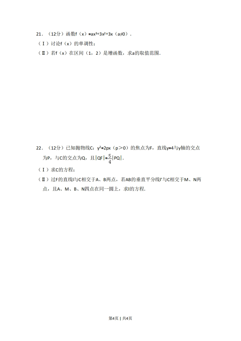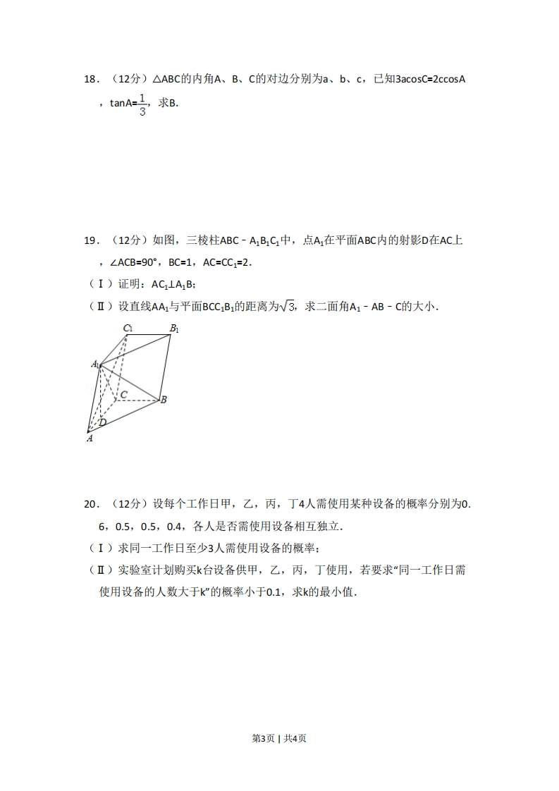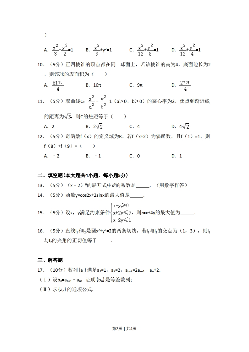 2014年全国统一高考数学试卷(文科)(大纲版)一、选择题(本大题共12小题,每小题5分)1.(5分)设集合M={1,2,4,6,8},N={1,2,3,5,6,7},则MnN中元素的个数为()A.2B.3c.5D.72.(5分)已知角a的终边经过点(-4,3),则cosa=()A.4B号C.-35D.-43.(5分)不等式组x(x+2)0的解集为()|x<1A.{x|-21)4,(5分)己知正四面体ABCD中,E是AB的中点,则异面直线CE与BD所成角的余弦值为()A君B.3cD.3635.(5分)函数y=n(+1)(x>-1)的反函数是()A.y=(1-e*)3(x>-1)B.y=(ex-1)3(x>-1)C.y=(1-e*)3(xER)D.y=(ex-1)3 (xER)6.(5分)已知a,b为单位向量,其夹角为60°,则(2a-b),=()A.-1B.0C.1D.27.(5分)有6名男医生、5名女医生,从中选出2名男医生、1名女医生组成一个医疗小组,则不同的选法共有()A.60种B.70种C.75种D.150种8.(5分)设等比数列{an}的前n项和为Sn·若S2=3,S4=15,则S6=()A.31B.32C.63D.649.(5分)已知椭圆C:号y21(a>b>0)的左、右焦点为、F2,离心率为3,过F2的直线I咬C于A、B两点,若△AFB的周长为4W√3,则C的方程为(3第1页1共4页A.2y2122B.x-ty2=1c.2y21D.y2132312812410.(5分)正四棱锥的顶点都在同一球面上,若该棱锥的高为4,底面边长为2,则该球的表面积为()A.81πB.16mC.9ntD.27元441.(5分)双曲线c:号y21(a>0,b>0)的离心率为2,焦点到渐近线a263的距离为W3,则c的焦距等于()A.2B.22C.4D.4W212.(5分)奇函数f(x)的定义域为R,若f(x+2)为偶函数,且f(1)=1,则f(8)+f(9)=()A.-2B.-1C.0D.1二、填空题(本大题共4小题,每小题5分)13.(5分)(x-2)的展开式中x的系数是.(用数字作答)14.(5分)函数y=cos2x+2sinx的最大值是x-y>015.(5分)设x,y满足约束条件{x+2y<3,则z=x+4y的最大值为x-2y≤116.(5分)直线1和l2是圆x2+y2=2的两条切线,若l与2的交点为(1,3),则与引2的夹角的正切值等于三、解答题17.(10分)数列{an}满足a1=1,a2=2,an2=2anm1-an+2.(I)设bn=an1-an,证明{bn}是等差数列:(Ⅱ)求{an}的通项公式.第2页1共4页18,(12分)△ABC的内角A、B、C的对边分别为a、b、c,已知3ac0sC=2 ccosA,tanA=1,求B.319.(12分)如图,三棱柱ABC-A1B1C1中,点A1在平面ABC内的射影D在AC上,∠ACB=90°,BC=1,AC=CC1=2.(I)证明:AC1⊥AB:(Ⅱ)设直线AA1与平面BCC1B1的距离为W3,求二面角A1-AB-C的大小.GBD20.(12分)设每个工作日甲,乙,丙,丁4人需使用某种设备的概率分别为0.6,0.5,0.5,0.4,各人是否需使用设备相互独立.(I)求同一工作日至少3人需使用设备的概率:(Ⅱ)实验室计划购买k台设备供甲,乙,丙,丁使用,若要求“同一工作日需使用设备的人数大于k"的概率小于0.1,求k的最小值,第3页1共4页