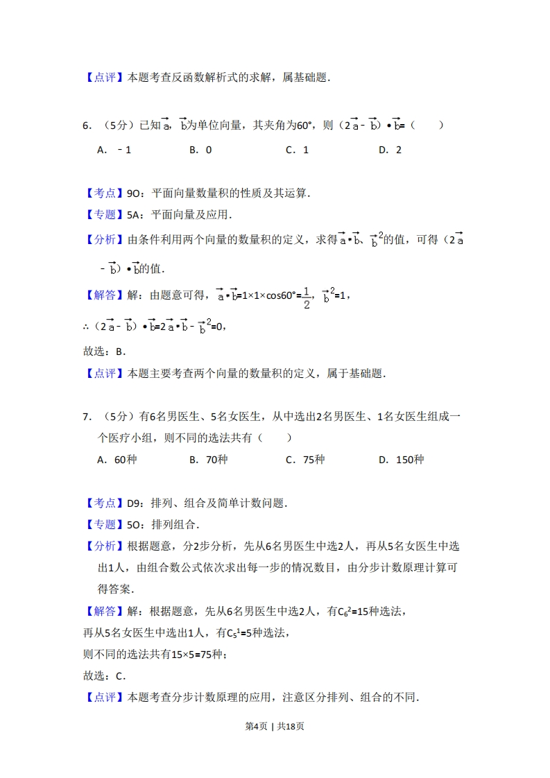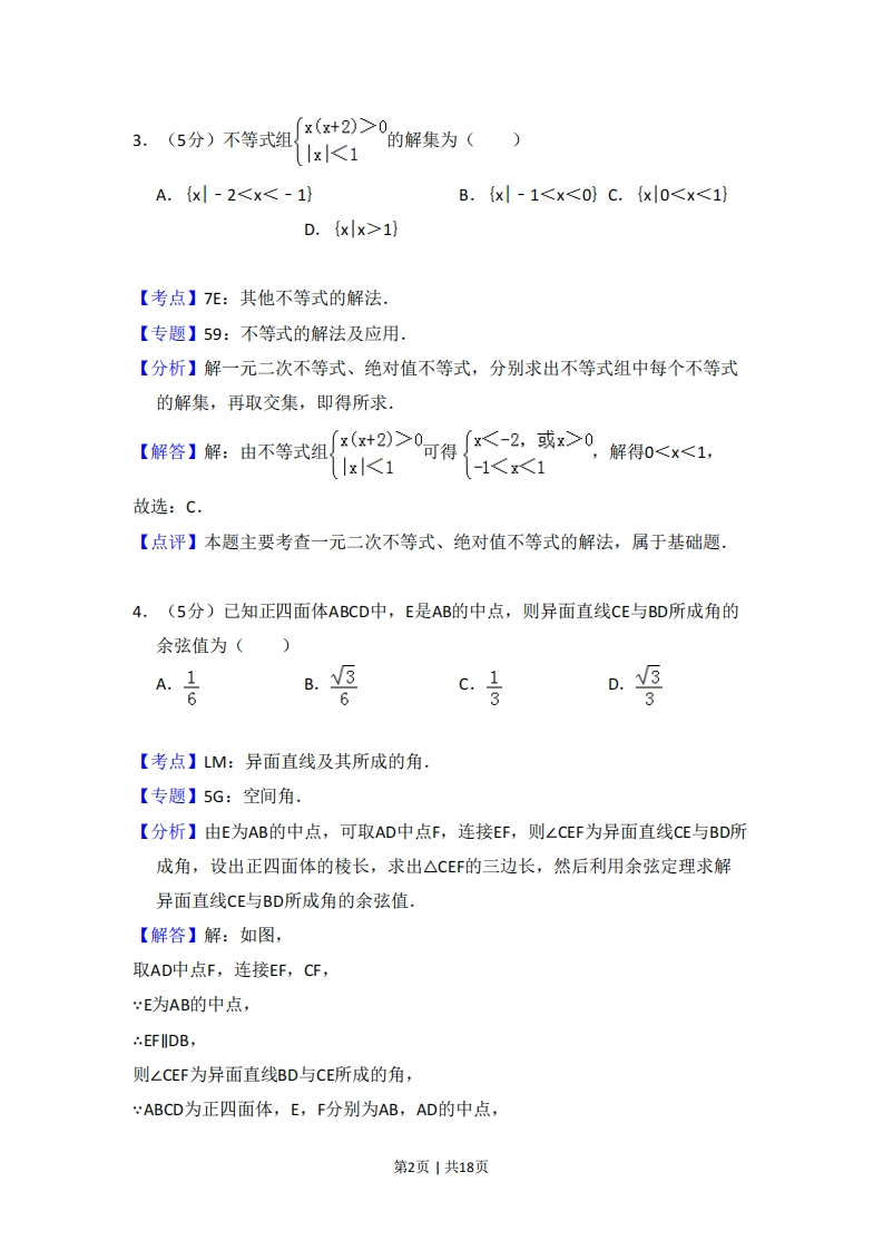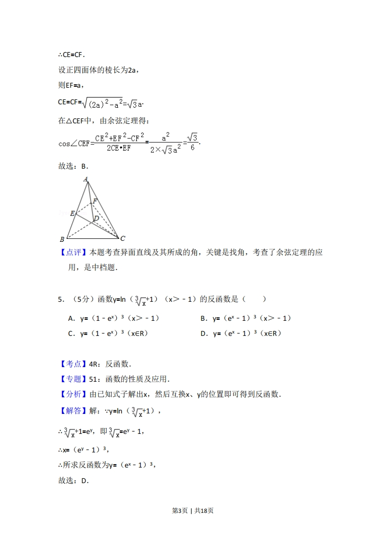 2014年全国统一高考数学试卷(文科)(大纲版)事考答案与试题佩析一、选择题(本大题共12小题,每小题5分)1.(5分)设集合M={1,2,4,6,8},N={1,2,3,5,6,7},则MnN中元素的个数为()A.2B.3C.5D.7【考点】1A:集合中元素个数的最值:1E:交集及其运算,【专题】5:集合,【分析】根据M与N,找出两集合的交集,找出交集中的元素即可.【解答】解:M={1,2,4,6,8},N={1,2,3,5,6,7},MnN={1,2,6},即M∩N中元素的个数为3.故选:B.【点评】此题考查了交集及其运算,熟练掌握交集的定义是解本题的关键,2.(5分)已知角a的终边经过点(-4,3),则c0sa=()A.45B.35C.-3D.-45【考点】G9:任意角的三角函数的定义.【专题】56:三角函数的求值.【分析】由条件直接利用任意角的三角函数的定义求得cosα的值.【解答】解:“角α的终边经过点(-4,3),x=-4,y=3,r=x2+y2=5.c0sa=X--4--4,r55故选:D.【点评】本题主要考查任意角的三角函数的定义,两点间的距离公式的应用,属于基础题第1页1共18页x(x+2)03.(5分)不等式组的解集为()UxK<1A.{x-21)【考点】7:其他不等式的解法.【专题】59:不等式的解法及应用【分析】解一元二次不等式、绝对值不等式,分别求出不等式组中每个不等式的解集,再取交集,即得所求,【解答】解:由不等式组x(x+2)>0可得x<-2,或x>|x<1-1-1)的反函数是()A.y=(1-e×)3(x>-1)B.y=(ex-1)3(x>-1)C.y=(1-ex)3 (xER)D.y=(ex-1)3 (xER)【考点】4R:反函数.【专题】51:函数的性质及应用【分析】由已知式子解出x,然后互换x、y的位置即可得到反函数.【解答】解:y=n(1),“+1=ev,即ev-1,Xe(ey-1)3,所求反函数为y=(ex-1)3,故选:D.第3页1共18页