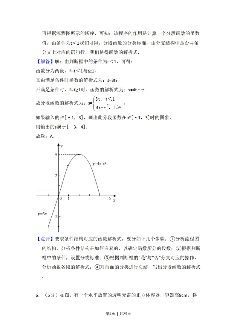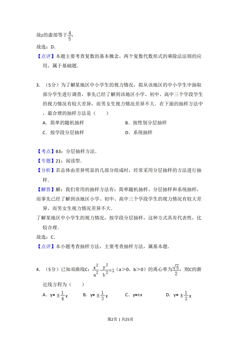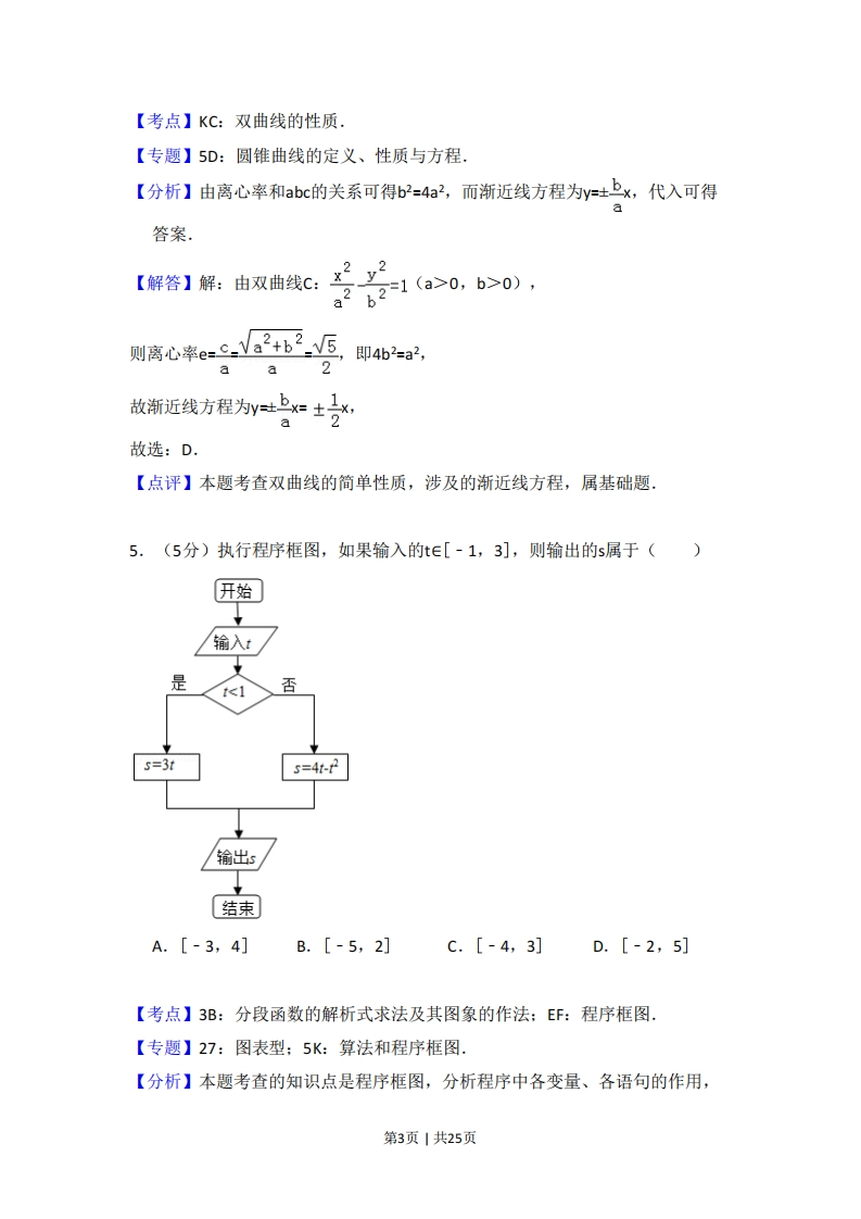 2013年全国统一高考数学试卷(理科)(新课标I)事考答案与试题佩析一、选择题:本大题共12小题,每小题5分,在每小题给出的四个选项中,只有一个是符合题目要求的,1.(5分)已知集合A={xx2-2x>0},B={x-√50}={xx>2或x<0},∴AnB={x|20,b>0)的离心率为5则c的渐近线方程为()Ay=±好x3C.y=±xD.y=±第2页1共25页【考点】KC:双曲线的性质,【专题】5D:圆锥曲线的定义、性质与方程.【分析】由离心率和abc的关系可得b2=4a2,而渐近线方程为y=±bx,代入可得a答案【你爷】架:由双周线c:苔1(a>0,b>0则离心率e=Sa2+b25,即4b2=a,aa故渐近线方程为y=±bx=±马x,a2故选:D.【点评】本题考查双曲线的简单性质,涉及的渐近线方程,属基础题.5.(5分)执行程序框图,如果输入的t[-1,3],则输出的s属于()开始输入t否=3t5=4t-2输出s结束A.[-3,4]B.[-5,2]C.[-4,3]D.[-2,5]【考点】3B:分段函数的解析式求法及其图象的作法:E「:程序框图.【专题】27:图表型:5K:算法和程序框图【分析】本题考查的知识点是程序框图,分析程序中各变量、各语句的作用,第3页1共25页