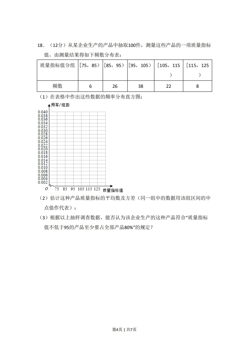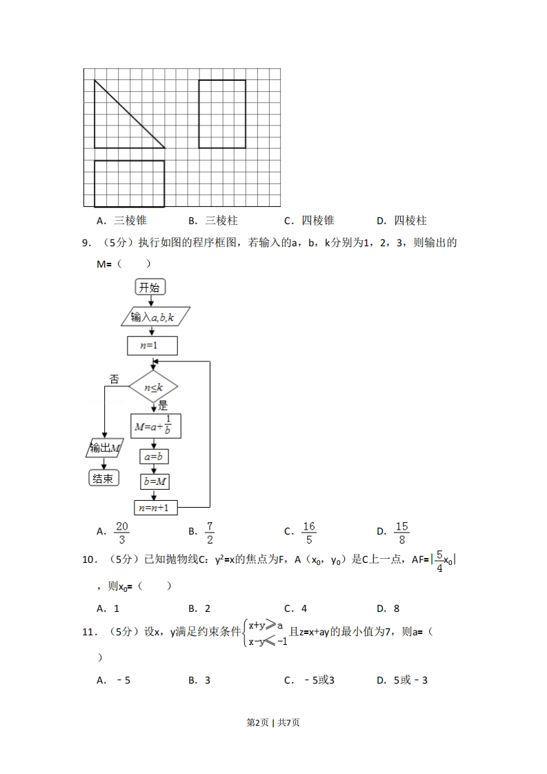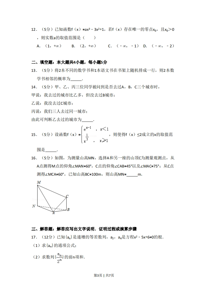 2014年全国统一高考数学试卷(文科)(新课标I)一、选择题:本大题共12小题,每小题5分,在每小题给出的四个选项中,只有一项是符合题目要求的1.(5分)已知集合M={x|-10,则()A.sina>0B.cosa>0C.sin2a>0D.cos2a>03.(5分)设2=,1+i,则lz=()1+iA号B.②D.2224.(5分)已知双曲线x2-y21(a>0)的离心率为2,则实数a()a23A.2B.6c.⑤D.1225.(5分)设函数f(x),g(x)的定义域都为R,且f(x)是奇函数,g(x)是偶函数,则下列结论正确的是()A.f(x)·g(x)是偶函数B.If(x)|g(x)是奇函数C.f(x)·g(x)|是奇函数D.f(x)·g(x)是奇函数6.(5分)设D,E,F分别为△ABC的三边BC,CA,AB的中点,则EB+FC(A.AD8.团C.BC07.(5分)在函数①y=cos2x,②y=|cosx,③ycos(2x+兀),④y=tan(62x-工)中,最小正周期为π的所有函数为()4A.①②③B.①③④C.②④D.①③8.(5分)如图,网格纸的各小格都是正方形,粗实线画出的是一个几何体的三视图,则这个几何体是()第1页1共7页A.三棱锥B.三棱柱C.四棱锥D.四棱柱9.(5分)执行如图的程序框图,若输入的a,b,k分别为1,2,3,则输出的M=()开始输入a,b,kn=1否n≤k¥是1M=a+万输出ya=b结束b=Mn=n+1A.20B.2c.9D.1510.(5分)已知抛物线C:y2=x的焦点为F,A(xo,Yo)是C上一点,AF=5xgl4,则x=()A.1B.2C.4D.811.(5分)设x,y满足约束条件∫+y>a且z=xay的最小值为7,则a=(xy≤-1)A.-5B.3C.-5或3D.5或-3第2页1共7页12.(5分)已知函数f(x)=ax3-3x2+1,若f(x)存在唯一的零点x,且x>0,则实数a的取值范围是()A.(1,+o0)B.(2,+o0)C.(-0,-1)D.(-0,-2)二、填空题:本大题共4小题,每小题5分13.(5分)将2本不同的数学书和1本语文书在书架上随机排成一行,则2本数学书相邻的概率为14.(5分)甲、乙、丙三位同学被问到是否去过A,B,C三个城市时,甲说:我去过的城市比乙多,但没去过B城市:乙说:我没去过c城市:丙说:我们三人去过同一城市:由此可判断乙去过的城市为ex-1,x<115.(5分)设函数f(x)=则使得f(x)≤2成立的x的取值范围是16.(5分)如图,为测量山高MN,选择A和另一座的山顶C为测量观测点,从A点测得M点的仰角∠MAN=60°,C点的仰角∠CAB=45°以及∠MAC=75°:从C点测得∠MCA=60°,已知山高BC=100m,则山高MN=m.三、解答题:解答应写出文字说明。证明过程或演算步骤17.(12分)已知{an}是递增的等差数列,a2,a4是方程x2-5x+6=0的根.(1)求{an}的通项公式:(2)求数列{n的前n项和.第3页1共7页