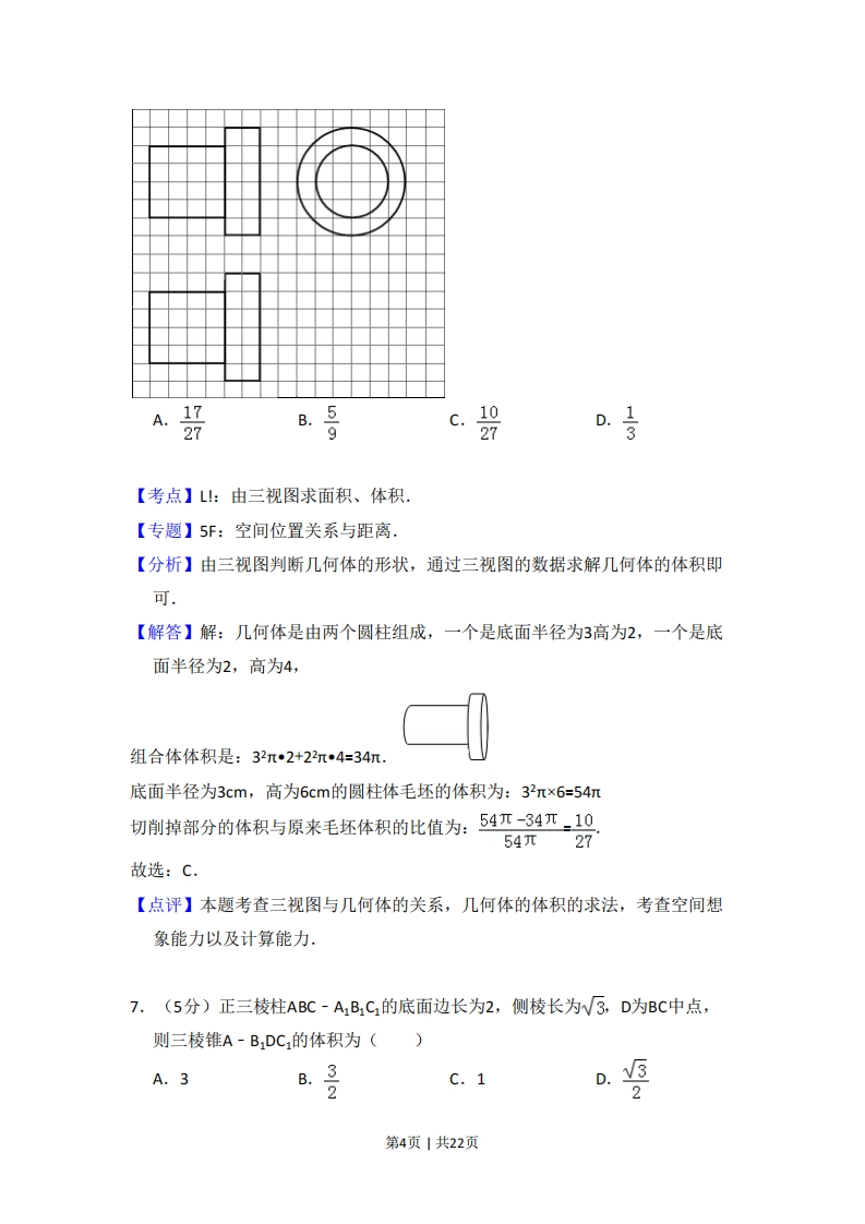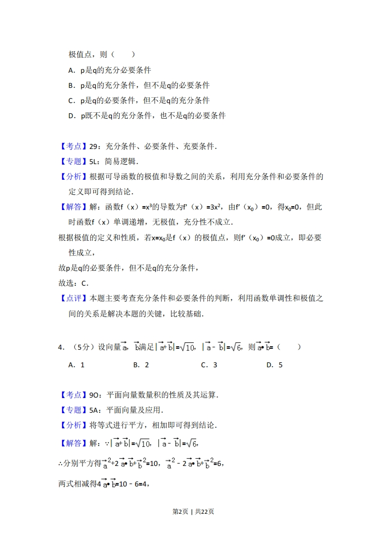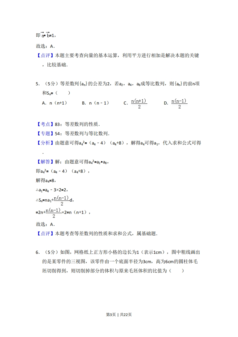 2014年全国统一高考数学试卷(文科)(新课标Ⅱ)事考答案与试题佩析一、选择题:本大题共12小题,每小题5分,在每小题给出的四个选项中,只有一项是符合题目要求的1.(5分)已知集合A={-2,0,2},B={xx2-x-2=0},则AnB=(A.0B.{2c.{o}D.{-2}【考点】1E:交集及其运算.【专题】5:集合,【分析】先解出集合B,再求两集合的交集即可得出正确选项.【解答】解:A={-2,0,2},B={xx2-X-2=0}={-1,2},AnB={2}.故选:B.【点评】本题考查交的运算,理解好交的定义是解答的关键.2.(5分)1+3i:()1-iA.1+2iB.-1+2iC.1-2iD.-1-2i【考点】A5:复数的运算.【专题】5N:数系的扩充和复数.【分析】分子分母同乘以分母的共轭复数1+i化简即可.【解答】解:化简可得1+31-(4+3i)1+)-1-3+41-2+41:-1+2i1-i(1-i)(1+i)1-i22故选:B【点评】本题考查复数代数形式的化简,分子分母同乘以分母的共轭复数是解决问题的关键,属基础题3.(5分)函数f(x)在x=Xo处导数存在,若p:P(xo)=0:q:x=x是f(x)的第1页|共22页极值点,则()A.p是q的充分必要条件B.p是q的充分条件,但不是q的必要条件C.p是q的必要条件,但不是q的充分条件D.p既不是q的充分条件,也不是q的必要条件【考点】29:充分条件、必要条件、充要条件.【专题】5L:简易逻辑.【分析】根据可导函数的极值和导数之间的关系,利用充分条件和必要条件的定义即可得到结论【解答】解:函数f(x)=x的导数为f(x)=3x2,由F(X)=0,得x=0,但此时函数f(x)单调递增,无极值,充分性不成立,根据极值的定义和性质,若x=xo是f(x)的极值点,则P(xo)=0成立,即必要性成立,故p是q的必要条件,但不是q的充分条件,故选:C.【点评】本题主要考查充分条件和必要条件的判断,利用函数单调性和极值之间的关系是解决本题的关键,比较基础4.(5分)设向量a,b满足b=√10,a-bl=√6,则=()A.1B.2C.3D.5【考点】90:平面向量数量积的性质及其运算.【专题】5A:平面向量及应用,【分析】将等式进行平方,相加即可得到结论.【解答】解:atbl=√0,a-bl=√6,分别平方得a2+2a6*62=10,a2-2a6+62=6,两式相减得4a·b=10-6=4,第2页|共22页即a61,故选:A【点评】本题主要考查向量的基本运算,利用平方进行相加是解决本题的关键,比较基础。5.(5分)等差数列{an}的公差为2,若a2,au,ag成等比数列,则{an}的前n项和S=()A.n(n+1)B.n(n-1)c.n(n+1)D.n(n-1)22【考点】83:等差数列的性质.【专题】54:等差数列与等比数列,【分析】由题意可得a2=(a4-4)(a,+8),解得a4可得a1,代入求和公式可得【解答】解:由题意可得a42=a2ag,即a42=(a4-4)(a4+8),解得a4=8,a1=a4-3×2=2,S=nartn(n-1)d,2=2n+nn-1)x2=n(n+1),2故选:A.【点评】本题考查等差数列的性质和求和公式,属基础题.6.(5分)如图,网格纸上正方形小格的边长为1(表示1cm),图中粗线画出的是某零件的三视图,该零件由一个底面半径为3cm,高为6cm的圆柱体毛坯切削得到,则切削掉部分的体积与原来毛坯体积的比值为()第3页1共22页