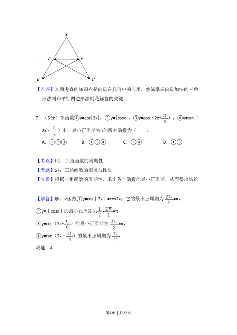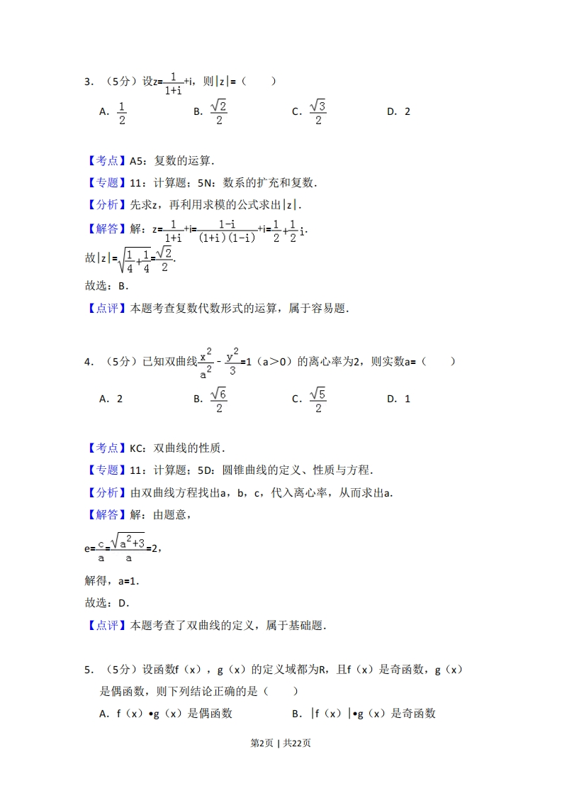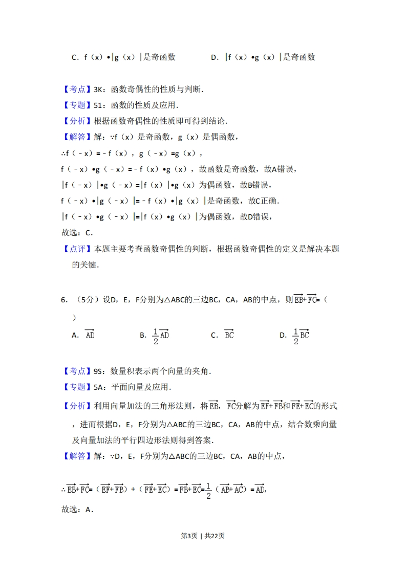 2014年全国统一高考数学试卷(文科)(新课标I)事考答案与试题佩折一、选择题:本大题共12小题,每小题5分,在每小题给出的四个选项中,只有一项是符合题目要求的1.(5分)已知集合M={x-10,则()A.sina>0B.cosa>0C.sin2a>0D.cos2a>0【考点】GC:三角函数值的符号.【专题】56:三角函数的求值.【分析】化切为弦,然后利用二倍角的正弦得答案.【解答】解:tana>0,..sind>0cosa则sin2a=2 sinacosa>0.故选:C【点评】本题考查三角函数值的符号,考查了二倍角的正弦公式,是基础题,第1页|共22页3.(5分)设2=,1.i,则|z=()1+iB.②c.3D.222【考点】A5:复数的运算.【专题】11:计算题:5N:数系的扩充和复数.【分析】先求z,再利用求模的公式求出z.【解答】解:中a号故z=-2V4+42故选:B.【点评】本题考查复数代数形式的运算,属于容易题.4.(5分)已知双曲线号号1(日>0)的离心率为知,则实数=()a23A.2B.V6c.V⑤D.122【考点】KC:双曲线的性质.【专题】11:计算题:5D:圆锥曲线的定义、性质与方程.【分析】由双曲线方程找出a,b,c,代入离心率,从而求出a.【解答】解:由题意,e=c-02432.aa解得,a=1.故选:D.【点评】本题考查了双曲线的定义,属于基础题.5.(5分)设函数f(x),g(x)的定义域都为R,且f(x)是奇函数,g(x)是偶函数,则下列结论正确的是()A.f(x)·g(x)是偶函数B.f(x)·g(x)是奇函数第2页|共22页C.f(x)·g(x)|是奇函数D.f(x)·g(x)是奇函数【考点】3K:函数奇偶性的性质与判断,【专题】51:函数的性质及应用.【分析】根据函数奇偶性的性质即可得到结论.【解答】解:f(x)是奇函数,g(x)是偶函数,f(-x)=-f(x),g(-x)=g(x),f(-x)·g(-x)=-f(x)·g(x),故函数是奇函数,故A错误,|f(-x)g(-x)=f(x)g(x)为偶函数,故B错误,f(-x)·g(-x)=-f(x)·g(x)是奇函数,故c正确.If(-x)·g(-x)=f(x)g(x)为偶函数,故D错误,故选:C.【点评】本题主要考查函数奇偶性的判断,根据函数奇偶性的定义是解决本题的关键.6.(5分)设D,E,F分别为△ABC的三边BC,CA,AB的中点,则EB+FC()A.ADB.1C.BC【考点】9S:数量积表示两个向量的夹角.【专题】5A:平面向量及应用.【分析】利用向量加法的三角形法则,将EB,FC分解为EF+FB和FE+EC的形式,进而根据D,E,F分别为△ABC的三边BC,CA,AB的中点,结合数乘向量及向量加法的平行四边形法则得到答案.【解答】解:D,E,F分别为△ABC的三边BC,CA,AB的中点,:丽+FC(丽+F丽)+(FE+EC)=丽+E心上(+AC)=A,故选:A.第3页|共22页