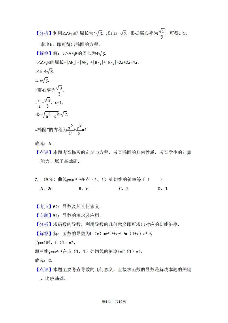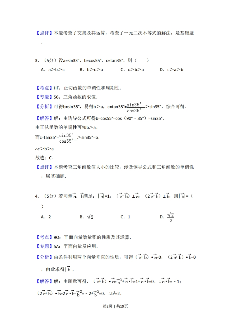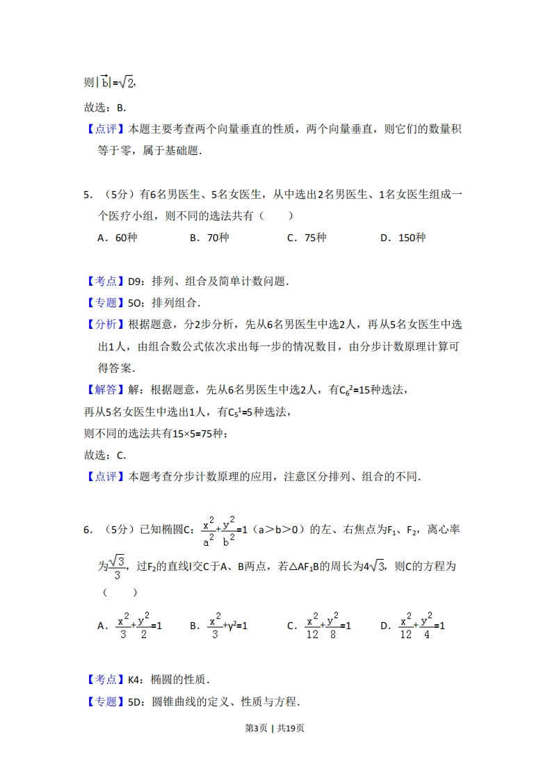 2014年全国统一高考数学试卷(理科)(大纲版)金考答案与试愿佩析一、选择题(本大题共12小题,每小题5分)1.(5分)设2=101,则2的共轭复数为()3+1A.-1+3iB.-1-3iC.1+3iD.1-3i【考点】A1:虚数单位i、复数:A5:复数的运算.【专题】5N:数系的扩充和复数.【分析】直接由复数代数形式的除法运算化简,则z的共轭可求.【解答】解:z=101-10i3)10+301-1+313+i(3+i)(3-i)10z=1-3i.故选:D.【点评】本题考查复数代数形式的除法运算,考查了复数的基本概念,是基础题.2.(5分)设集合M={xx2-3x-4<0},N={x0≤≤5},则MnN=()A.(0,4]B.[0,4)C.[-1,0)D.(-1,0]【考点】1E:交集及其运算,【专题】5:集合.【分析】求解一元二次不等式化简集合M,然后直接利用交集运算求解.【解答】解:由x2-3x-4<0,得-1b>cB.b>c>aC.c>b>aD.c>a>b【考点】HF:正切函数的单调性和周期性,【专题】56:三角函数的求值.【分析】可得b=sin35°,易得b>a,c=tan35°=sin35°>sin35°,综合可得.c0s35°【解答】解:由诱导公式可得b=cos55=cos(90°-35°)=sin35°,由正弦函数的单调性可知b>a,cos350>sin35°=b,而c=tan35°=sin35°∴c>b>a故选:C【点评】本题考查三角函数值大小的比较,涉及诱导公式和三角函数的单调性,属基础题.4.(5分)若向量a、b满足:|a=1,(b)1a,(2a1b,则川bl=()A.2B.√2C.1D.②【考点】9O:平面向量数量积的性质及其运算,【专题】5A:平面向量及应用.【分析】由条件利用两个向量垂直的性质,可得(b)·=0,(2b)·=0,由此求得.【解答】解:由题意可得,(·示2+a-1+a-0,÷a=-1:(2ab)…b=2ab+62=-2+62=0,b2=2,第2页1共19页则川b=V2,故选:B.【点评】本题主要考查两个向量垂直的性质,两个向量垂直,则它们的数量积等于零,属于基础题.5.(5分)有6名男医生、5名女医生,从中选出2名男医生、1名女医生组成一个医疗小组,则不同的选法共有()A.60种B.70种C.75种D.150种【考点】D9:排列、组合及简单计数问题.【专题】50:排列组合.【分析】根据题意,分2步分析,先从6名男医生中选2人,再从5名女医生中选出1人,由组合数公式依次求出每一步的情况数目,由分步计数原理计算可得答案.【解答】解:根据题意,先从6名男医生中选2人,有C2=15种选法,再从5名女医生中选出1人,有C2=5种选法,则不同的选法共有15×5=75种:故选:C【点评】本题考查分步计数原理的应用,注意区分排列、组合的不同.6.《(5分)已知椭圆c:子y子1《(a>b>0)的左、右焦点为、F,离心率a2 b2为5,过F,的直线交C于A、B两点,若△AF,B的周长为4√5,则C的方程为3()222A.xty=1B.xty2=122-1C.323128124【考点】K4:椭圆的性质【专题】5D:圆锥曲线的定义、性质与方程.第3页1共19页