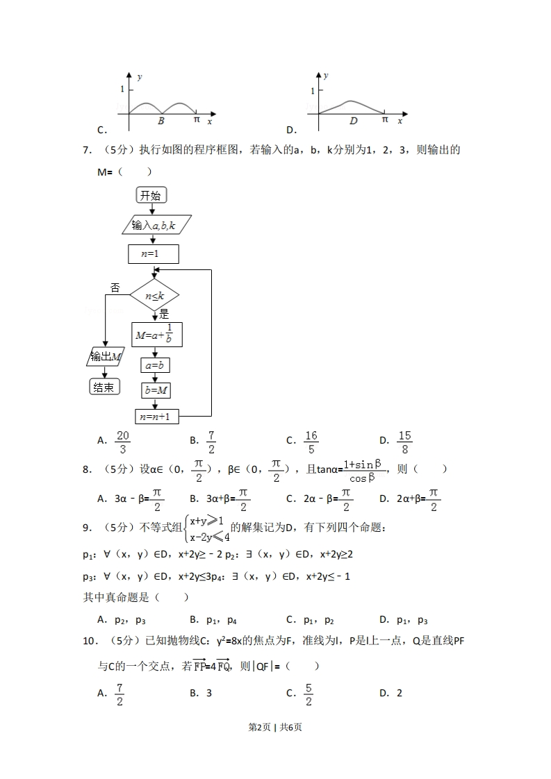 2014年全国统一高考数学试卷(理科)(新课标I)一、选择题(共12小题,每小题5分)1.(5分)已知集合A={xx2-2x-3≥0},B={x-2<2},则A∩B=()A.[1,2)B.[-1,1]C.[-1,2)D.[-2,-1]2.(5分)(1+i)3()(1-1)2A.1+iB.1-iC.-1+iD.-1-i3.(5分)设函数f(x),g(x)的定义域都为R,且f(x)是奇函数,g(x)是偶函数,则下列结论正确的是()A.f(x)g(x)是偶函数B.f(x)|·g(x)是奇函数C.f(x)·g(x)|是奇函数D.f(x)g(x)是奇函数4.(5分)已知F为双曲线C:x2-my2=3m(m>0)的一个焦点,则点F到c的一条渐近线的距离为()A.√3B.3c.√3mD.3m5.(5分)4位同学各自在周六、周日两天中任选一天参加公益活动,则周六、周日都有同学参加公益活动的概率为()A吉B昌c吾D名6.(5分)如图,圆0的半径为1,A是圆上的定点,P是圆上的动点,角x的始边为射线OA,终边为射线OP,过点P作直线OA的垂线,垂足为M,将点M到直线OP的距离表示为x的函数f(x),则y=f(x)在[0,π]的图象大致为(第1页1共6页πx7.(5分)执行如图的程序框图,若输入的a,b,k分别为1,2,3,则输出的M=()开始输入ab,k=1否是M=a+万输出a=b结束6=Mn=n+1A.20B.2c.16D.153588.(5分)设aE(0,)Be (0.),Htana-ltsinB,,则()2c0sB■A.3a-B=B.3a+B=C.2a-B=2D.2a+B=29.(5分)不等式组+y>1的解集记为0,有下列四个命题:x-2y4p1:廿(x,y)∈D,x+2y-2P2:3(x,y)∈D,x+2y22p3:H(x,y)∈D,x+2ys3p4:3(x,y)∈D,x+2ys-1其中真命题是()A.p2,P3B.p1,P4C.p1,P2D.p1,P310.(5分)已知抛物线C:y2=8x的焦点为F,准线为,P是上一点,Q是直线PF与C的一个交点,若FP-4Q,则川QF|=()B.3c5D.2第2页1共6页11,(5分)已知函数f(x)=ax3-3x2+1,若f(x)存在唯一的零点x,且x>0,则实数a的取值范围是()A.(1,+0)B.(2,+0)C.(-00,-1)D.(-0,-2)12.(5分)如图,网格纸上小正方形的边长为1,粗实线画出的是某多面体的三视图,则该多面体的各条棱中,最长的棱的长度为()A.6V2B.6c.4W2D.4二、填空题(共4小题,每小题5分)13.(5分)(x-y)(x+y)8的展开式中x2y7的系数为一·(用数字填写答案)14,(5分)甲、乙、丙三位同学被问到是否去过A,B,C三个城市时,甲说:我去过的城市比乙多,但没去过B城市:乙说:我没去过C城市:丙说:我们三人去过同一城市:由此可判断乙去过的城市为一,15.(5分)己知A,B,C为圆0上的三点,若A0上(品+AC),则B与AC的夹2角为16,(5分)已知a,b,c分别为△ABC的三个内角A,B,C的对边,a=2且(2+b)(sinA-sinB)=(c-b)sinC,则△ABC面积的最大值为_第3页1共6页