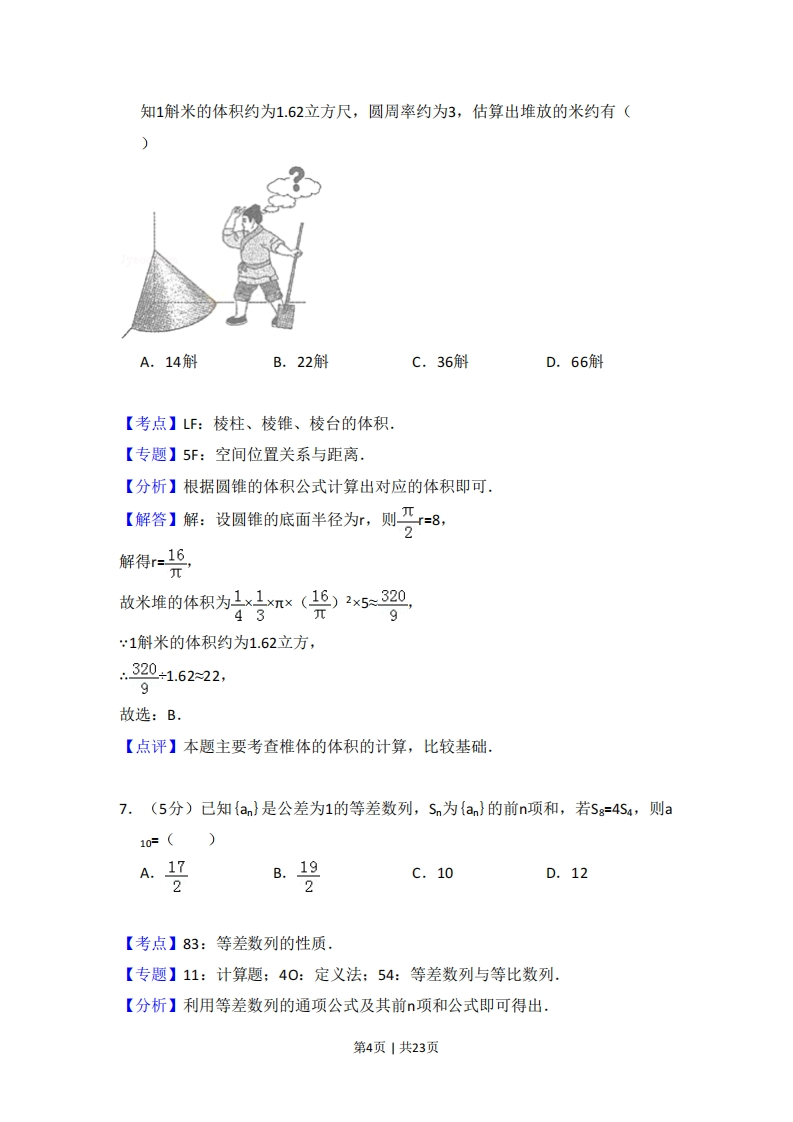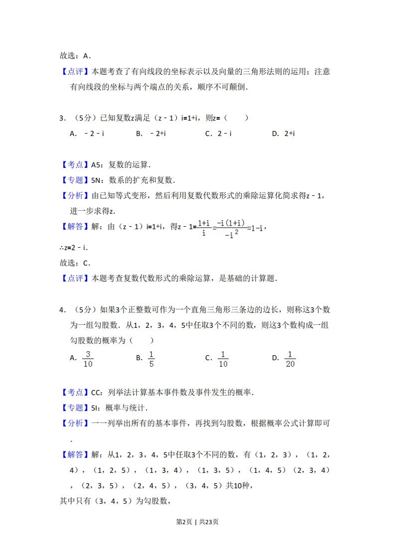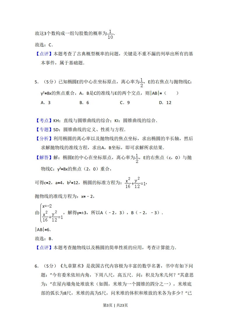 2015年全国统一高考数学试卷(文科)(新课标I)事考答案与试题佩析一、选择题:本大题共12小题,每小题5分,在每小题给出的四个选项中,只有一项是符合题目要求的.1.(5分)已知集合A={xx=3n+2,neN},B={6,8,10,12,14},则集合A∩B中元素的个数为()A.5B.4C.3D.2【考点】1E:交集及其运算.【专题】5:集合.【分析】根据集合的基本运算进行求解,【解答】解:A={xx=3n+2,nEN}={2,5,8,11,14,17,},则A∩B={8,14},故集合A∩B中元素的个数为2个,故选:D,【点评】本题主要考查集合的基本运算,比较基础.2.(5分)已知点A(0,1),B(3,2),向量AC(-4,-3),则向量BC()A.(-7,-4)B.(7,4)C.(-1,4)D.(1,4)【考点】9:平面向量的坐标运算.【专题】5A:平面向量及应用【分析】顺序求出有向线段AB,然后由BCAC-AB求之.【解答】解:由已知点A(0,1),B(3,2),得到B=(3,1),向量AC(-4,-3),则向量BCAC-AB=(-7,-4):第1页|共23页故选:A.【点评】本题考查了有向线段的坐标表示以及向量的三角形法则的运用:注意有向线段的坐标与两个端点的关系,顺序不可颠倒,3.(5分)已知复数z满足(z-1)i=1+i,则z=()A.-2-iB.-2+ic.2-iD.2+i【考点】A5:复数的运算.【专题】5N:数系的扩充和复数.【分析】由已知等式变形,然后利用复数代数形式的乘除运算化简求得z~1,进一步求得z,【解答】解:由(2-1)1+i,得2-1=1+i1)-1-i,i-122=2-.故选:C【点评】本题考查复数代数形式的乘除运算,是基础的计算题.4.(5分)如果3个正整数可作为一个直角三角形三条边的边长,则称这3个数为一组勾股数.从1,2,3,4,5中任取3个不同的数,则这3个数构成一组勾股数的概率为()A品8.5C.1D.1020【考点】CC:列举法计算基本事件数及事件发生的概率.【专题】5引:概率与统计.【分析】一一列举出所有的基本事件,再找到勾股数,根据概率公式计算即可【解答】解:从1,2,3,4,5中任取3个不同的数,有(1,2,3),(1,2,4),(1,2,5),(1,3,4),(1,3,5),(1,4,5)(2,3,4),(2,3,5),(2,4,5),(3,4,5)共10种,其中只有(3,4,5)为勾股数,第2页|共23页故这3个数构成一组勾股数的概率为10故选:C.【点评】本题考查了古典概型概率的问题,关键是不重不漏的列举出所有的基本事件,属于基础题.5.(5分)已知椭圆E的中心在坐标原点,离心率为二,E的右焦点与抛物线C:y2=8x的焦点重合,A,B是C的准线与E的两个交点,则|AB=()A.3B.6C.9D.12【考点】KH:直线与圆锥曲线的综合:KI:圆锥曲线的综合.【专题】5D:圆锥曲线的定义、性质与方程.【分析】利用椭圆的离心率以及抛物线的焦点坐标,求出椭圆的半长轴,然后求解抛物线的准线方程,求出A,B坐标,即可求解所求结果,【解答】解:椭圆E的中心在坐标原点,离心率为上,E的右焦点(c,0)与抛物线C:y2=8x的焦点(2,0)重合,可得c=2,a=4,b2=12,椭圆的标准方程为:x2y16121,抛物线的准线方程为:x=-2,x=-2由x2y21,解得y=3,所以A(-2,3),B(-2,-3)·(16+12-1|AB=6.故选:B【点评】本题考查抛物线以及椭圆的简单性质的应用,考查计算能力.6.(5分)《九章算术》是我国古代内容极为丰富的数学名著,书中有如下问题:”今有委米依垣内角,下周八尺,高五尺.问:积及为米几何?“其意思为:”在屋内墙角处堆放米(如图,米堆为一个圆锥的四分之一),米堆底部的弧长为8尺,米堆的高为5尺,问米堆的体积和堆放的米各为多少?“已第3页|共23页