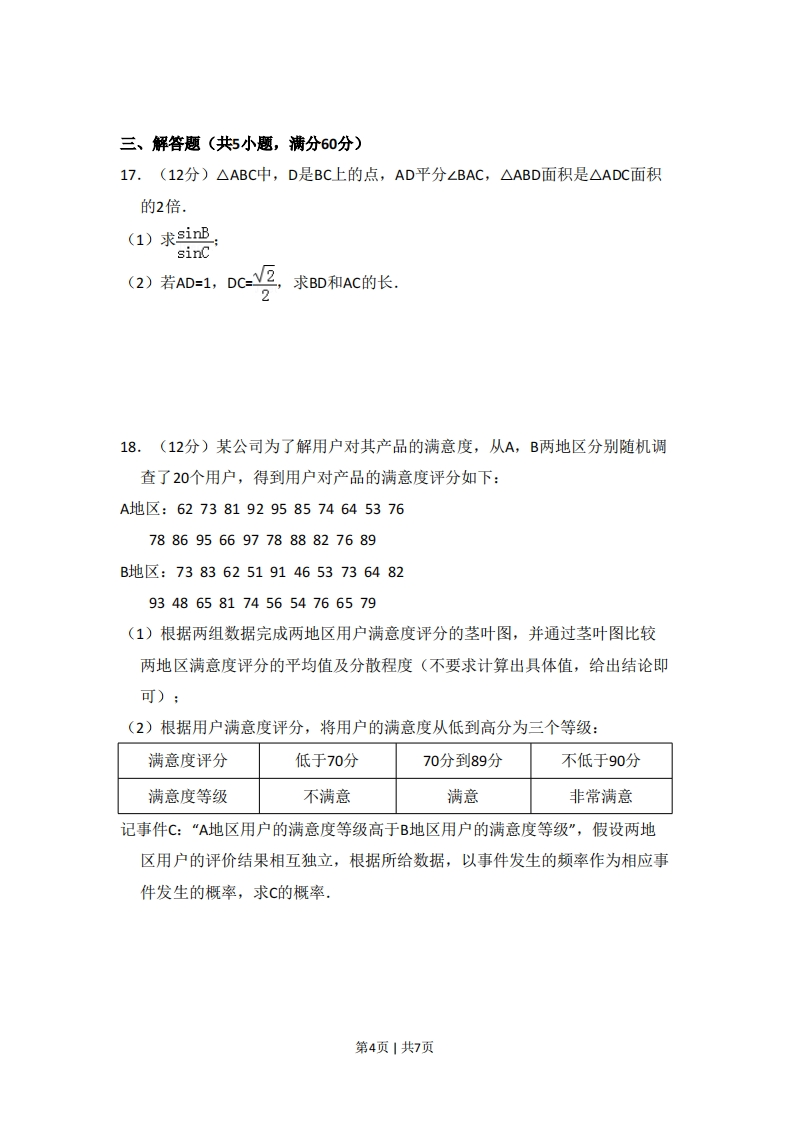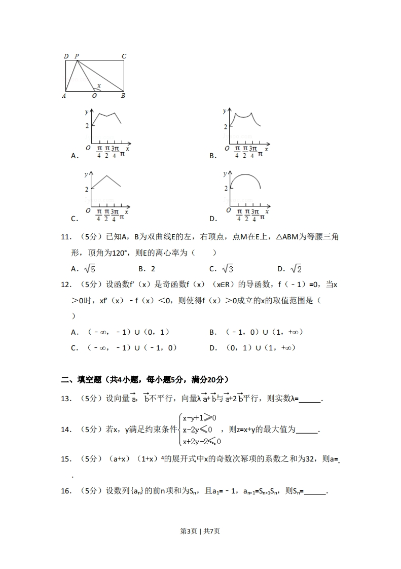 2015年全国统一高考数学试卷(理科)(新课标Ⅱ)一、选择题(共12小题,每小题5分,满分60分)1.(5分)已知集合A={-2,-1,0,1,2},B={x(×-1)(x+2)<0},则A∩B=()A.{-1,0}B.{0,1}C.{-1,0,1}D.0,1,22.(5分)若a为实数,且(2+ai)(a-2i)=-4i,则a=()A.-1B.0C.1D.23.(5分)根据如图给出的2004年至2013年我国二氧化硫年排放量(单位:万吨)柱形图,以下结论中不正确的是()2700260025002400230022002100200019002004年2005年2006年2007年2008年2009年2010年2011年2012年2013年A.逐年比较,2008年减少二氧化硫排放量的效果最显著B.2007年我国治理二氧化硫排放显现成效C,2006年以来我国二氧化硫年排放量呈减少趋势D.2006年以来我国二氧化硫年排放量与年份正相关4.(5分)已知等比数列{an}满足a1=3,a1+a3+a5=21,则a3ta5ta=()A.21B.42C.63D.841+1082(2-x),x<15.(5分)设函数f(x)=则f(-2)f(log212)=(2x-1,x>1A.3B.6C.9D.126.(5分)一个正方体被一个平面截去一部分后,剩余部分的三视图如图,则截去部分体积与剩余部分体积的比值为()第1页1共7页A吉8.月cD吉7.(5分)过三点A(1,3),B(4,2),C(1,-7)的圆交y轴于M,N两点,则MN=()A.2W6B.8c.4W6D.108.(5分)程序框图的算法思路源于我国古代数学名著《九章算术》中的“更相减损术”,执行该程序框图,若输入的a,b分别为14,18,则输出的a=()开始输入a,b是a≠b2否是a>b?否输出aa=a-bb=b-a结束A.0B.2C.4D.149.(5分)已知A,B是球0的球面上两点,∠AOB=90°,C为该球面上的动点,若三棱锥0-ABC体积的最大值为36,则球0的表面积为()A.36rB.64πC.144元D.256m10.(5分)如图,长方形ABCD的边AB=2,BC=1,O是AB的中点,点P沿着边BC,CD与DA运动,记∠BOP=x.将动点P到A,B两点距离之和表示为x的函数f(x),则y=f(x)的图象大致为()第2页1共7页D P0ππ3π424π424π0ππ3rx0ππ3rxC.44πD.44π11.(5分)已知A,B为双曲线E的左,右顶点,点M在E上,△ABM为等腰三角形,顶角为120°,则E的离心率为()A.√5B.2c.√3D.√212.(5分)设函数F(x)是奇函数f(x)(xER)的导函数,f(-1)=0,当x>0时,xP(x)-f(x)<0,则使得f(x)>0成立的x的取值范围是(A.(-0,-1)U(0,1)B.(-1,0)U(1,+0)C.(-0,-1)U(-1,0)D.(0,1)U(1,+o)二、填空题(共4小题,每小题5分,满分20分)13.(5分)设向量a,不平行,向量入6与26平行,则实数=一「xy叶1014.(5分)若x,y满足约束条件{x-2y<0,则z=x+y的最大值为一·x+2y-2s015.(5分)(a+x)(1+x)4的展开式中x的奇数次幂项的系数之和为32,则a=16.(5分)设数列{an}的前n项和为Sn,且a1=-1,an1=Sn-1Sn,则Sn_第3页1共7页
