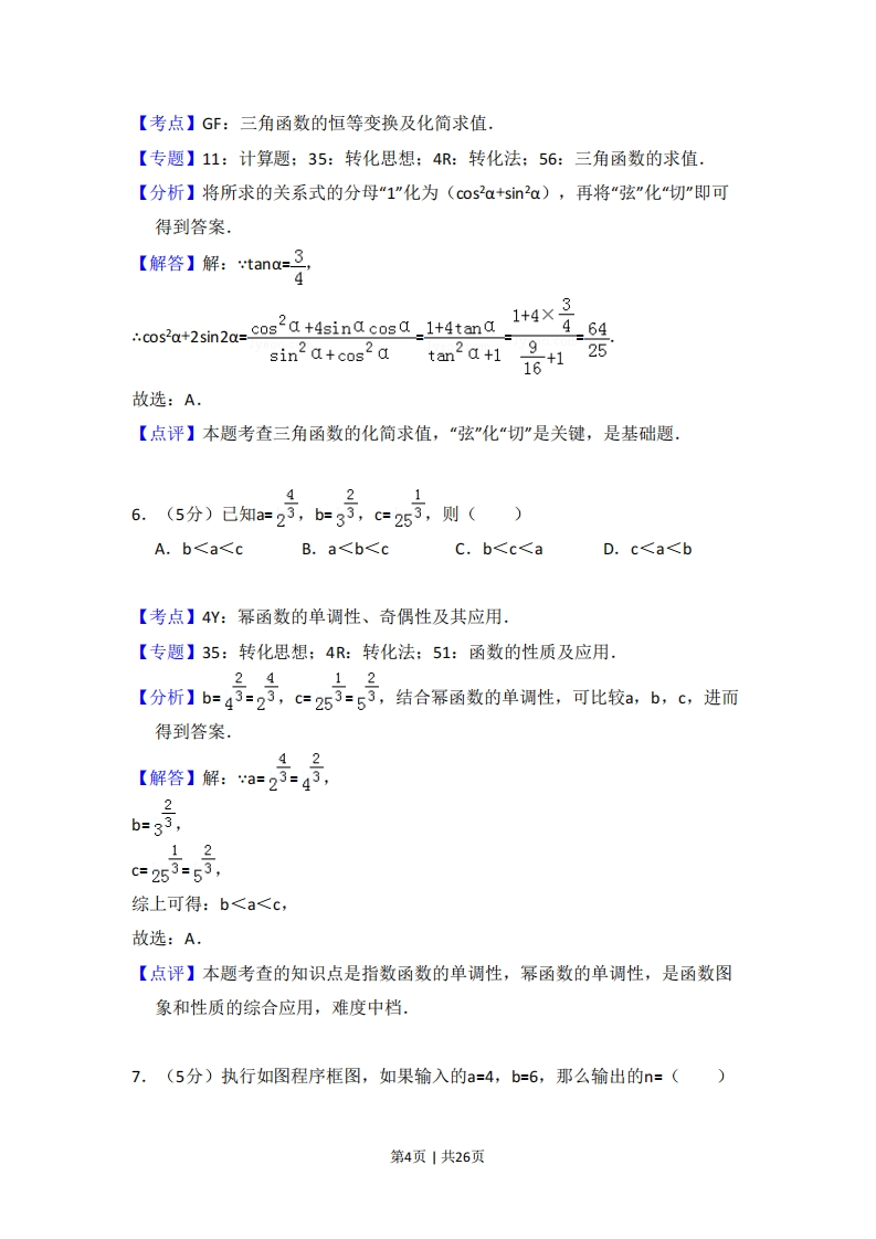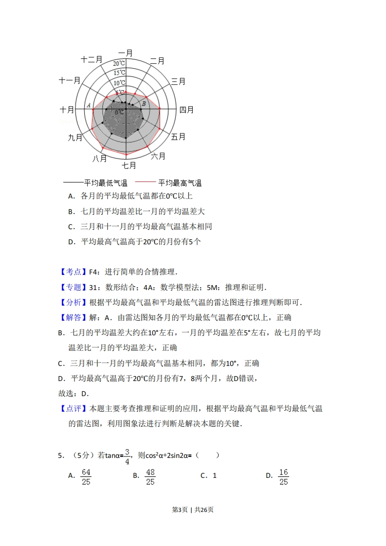 2016年全国统一高考数学试卷(理科)(新课标Ⅲ)事考答案与试题佩析一、选择题:本大题共12小题,每小题5分,在每小题给出的四个选项中,只有一项是符合题目要求的.1.(5分)设集合S={x(x-2)(x-3)≥0},T={xx>0},则s∩T=(A.[2,3]B.(-0,2]U[3,+o)C.[3,+oo)D.(0,2]U[3,+o0)【考点】1E:交集及其运算.【专题】37:集合思想:40:定义法:5:集合.【分析】求出S中不等式的解集确定出S,找出S与T的交集即可.【解答】解:由S中不等式解得:2或x之3,即S=(-0,2]U[3,+o0),T=(0,+0),∴SnT=(0,2]U[3,+oo),故选:D.4之2812【点评】此题考查了交集及其运算,熟练掌握交集的定义是解本题的关键.2.(5分)若z=1+2i,则41=()z"z-1A.1B.-1C.iD.-i【考点】A5:复数的运算.【专题】11:计算题:29:规律型:35:转化思想:5N:数系的扩充和复数.【分析】利用复数的乘法运算法则,化简求解即可.【解答】解:z=1+2i,则41=,41-4i=i.zz-1(1+2i)(1-2i)-15-1故选:C第1页|共26页【点评】本题考查复数的代数形式混合运算,考查计算能力.3.(5分)已知向量B丽(凸,5),d(5,马),则∠ABC=()2A.30°B.45°C.60°D.120°【考点】9S:数量积表示两个向量的夹角.【专题】11:计算题:41:向量法:49:综合法:5A:平面向量及应用.【分析】根据向量A,的坐标便可求出BA~BC,及BA,B配的值,从而根据向量夹角余弦公式即可求出cos∠ABC的值,根据∠ABC的范围便可得出∠ABC的值.【解答】解:函C555丽c1442·cos∠ABC=BA.BC V3BA BC 2又0°≤∠ABC≤180°;LABC=30°.故选:A.【点评】考查向量数量积的坐标运算,根据向量坐标求向量长度的方法,以及向量夹角的余弦公式,向量夹角的范围,已知三角函数值求角.4.(5分)某旅游城市为向游客介绍本地的气温情况,绘制了一年中各月平均最高气温和平均最低气温的雷达图,图中A点表示十月的平均最高气温约为15℃,B点表示四月的平均最低气温约为5℃,下面叙述不正确的是()第2页1共26页十二月一月20℃二月15℃十一月10g三月B十月A四月九月五月八月六月七月平均最低气温平均最高气温A.各月的平均最低气温都在0C以上B.七月的平均温差比一月的平均温差大C.三月和十一月的平均最高气温基本相同D.平均最高气温高于20℃的月份有5个【考点】F4:进行简单的合情推理【专题】31:数形结合:4A:数学模型法:5M:推理和证明,【分析】根据平均最高气温和平均最低气温的雷达图进行推理判断即可.【解答】解:A.由雷达图知各月的平均最低气温都在0℃以上,正确B.七月的平均温差大约在10°左右,一月的平均温差在5°左右,故七月的平均温差比一月的平均温差大,正确C.三月和十一月的平均最高气温基本相同,都为10°,正确D.平均最高气温高于20℃的月份有7,8两个月,故D错误,故选:D.【点评】本题主要考查推理和证明的应用,根据平均最高气温和平均最低气温的雷达图,利用图象法进行判断是解决本题的关键。5.(5分)若tana=3,则cos2a+2sin2a=()A.64B.48C.1D.16252525第3页|共26页