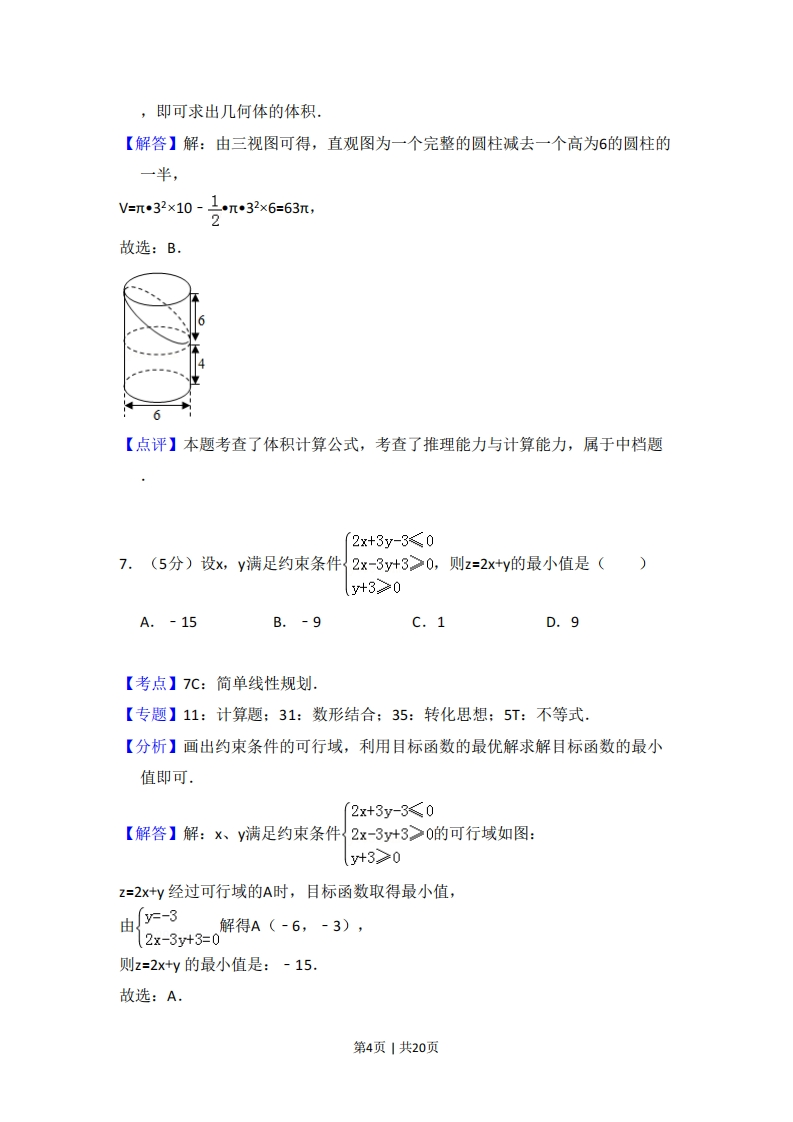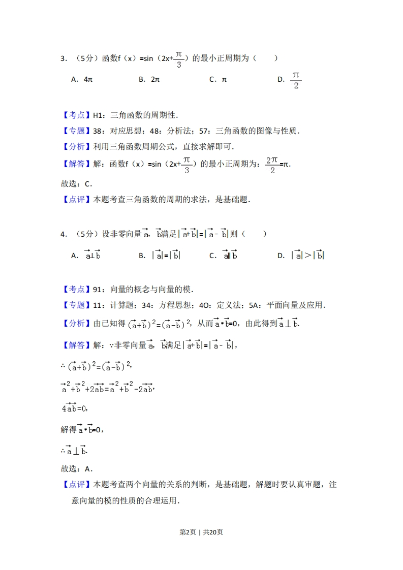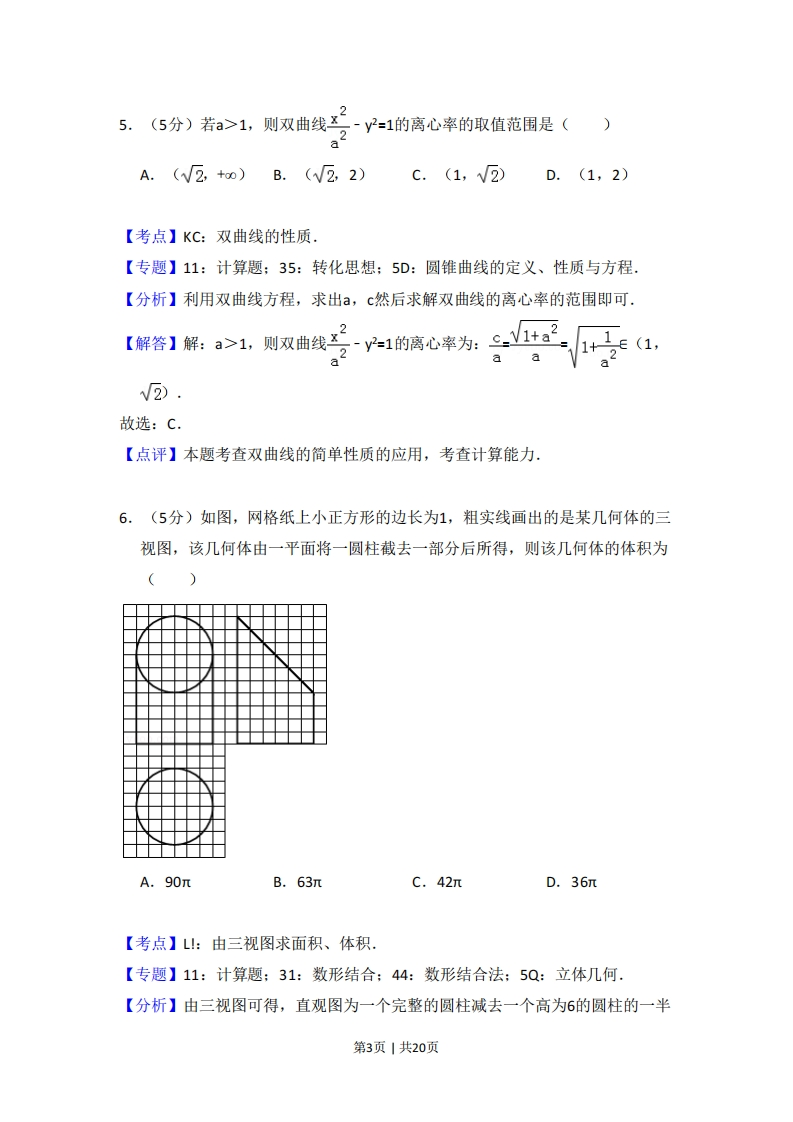 2017年全国统一高考数学试卷(文科)(新课标Ⅱ)事考答案与试题佩折一、选择题:本题共12小题,每小题5分,共60分.在每小题给出的四个选项中,只有一项是符合题目要求的。1.(5分)设集合A={1,2,3},B={2,3,4},则AUB=()A.{1,2,3,4}B.{1,2,3}C.{2,3,4}D.{1,3,4}【考点】1D:并集及其运算【专题】11:计算题;49:综合法.【分析】集合A=(1,2,3},B={2,3,4},求AUB,可用并集的定义直接求出两集合的并集.【解答】解:A={1,2,3},B={2,3,4},AUB={1,2,3,4}故选:A.【点评】本题考查并集及其运算,解题的关系是正确理解并集的定义及求并集的运算规则,是集合中的基本概念型题,2.(5分)(1+i)(2+i)=()A.1-iB.1+3iC.3+iD.3+3i【考点】A5:复数的运算.【专题】35:转化思想:5N:数系的扩充和复数.【分析】利用复数的运算法则即可得出.【解答】解:原式=2-1+3i=1+3i.故选:B.【点评】本题考查了复数的运算法则,考查了推理能力与计算能力,属于基础题第1页1共20页3.(5分)函数f(x)=sin(2x+兀)的最小正周期为()A.4元B.2元C.πD.π2【考点】H1:三角函数的周期性,【专题】38:对应思想:48:分析法:57:三角函数的图像与性质.【分析】利用三角函数周期公式,直接求解即可.【解答】解:函数f(x)=sn(2x+兀)的最小正周期为:2元=n.32故选:C.【点评】本题考查三角函数的周期的求法,是基础题.4.(5分)设非零向量a,b满足b=a-b则()A.albB.Ial=1c.allbD.【考点】91:向量的概念与向量的模,【专题】11:计算题:34:方程思想:40:定义法:5A:平面向量及应用.【分析】由已知得(a+6)2=(a-b)2,从而a-b-0,由此得到a⊥b.【解答】解:非零向量a,b满足|atb=a-bl,(a+6)2=(a-b)2,à2+62+2a品=a2+62-2a品64ai=0,解得a·=0,a⊥b故选:A.【点评】本题考查两个向量的关系的判断,是基础题,解题时要认真审题,注意向量的模的性质的合理运用.第2页|共20页,.5分)者>1。则双陆线号=的离心率的取植范程是()A.(2,+o)B.(√2,2)C.(1,√2)D.(1,2)【考点】KC:双曲线的性质.【专题】11:计算题:35:转化思想:5D:圆锥曲线的定义、性质与方程.【分析】利用双曲线方程,求出a,c然后求解双曲线的离心率的范围即可【解答】解:a>1,则双曲线号6*:a√2).故选:C【点评】本题考查双曲线的简单性质的应用,考查计算能力.6.(5分)如图,网格纸上小正方形的边长为1,粗实线画出的是某几何体的三视图,该几何体由一平面将一圆柱截去一部分后所得,则该几何体的体积为()A.90rB.63πC.42πD.36元【考点】!:由三视图求面积、体积,【专题】11:计算题:31:数形结合:44:数形结合法:5Q:立体几何.【分析】由三视图可得,直观图为一个完整的圆柱减去一个高为6的圆柱的一半第3页|共20页